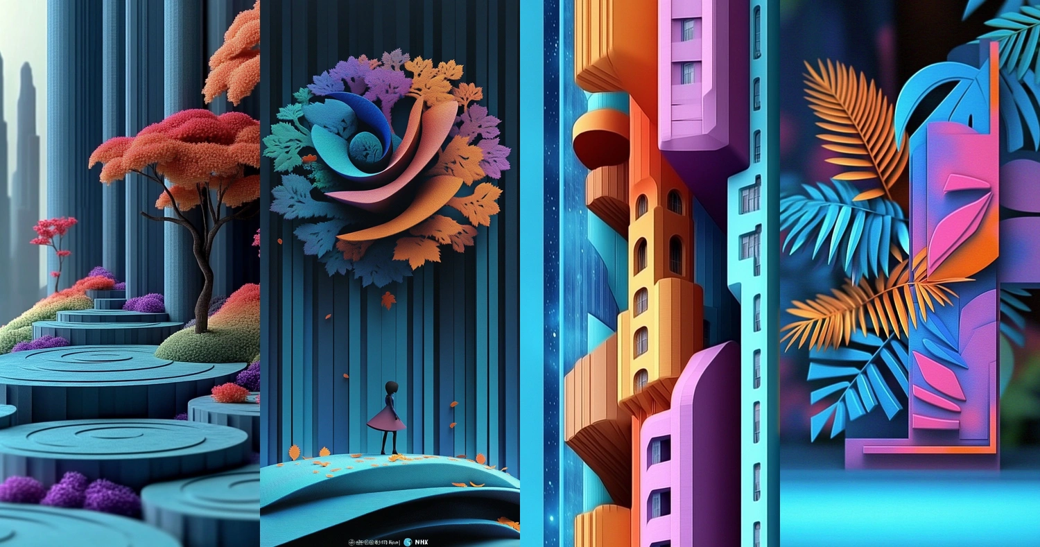 Bright, saturated colors emphasize detailed, geometric shapes, creating depth through layered textures and varied lighting. The spatial arrangements appear both structured and fluid, enhancing dimensionality.