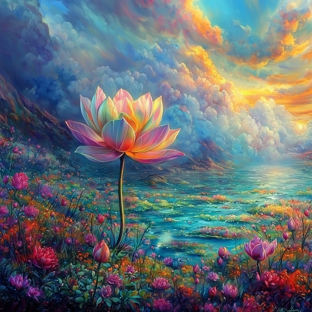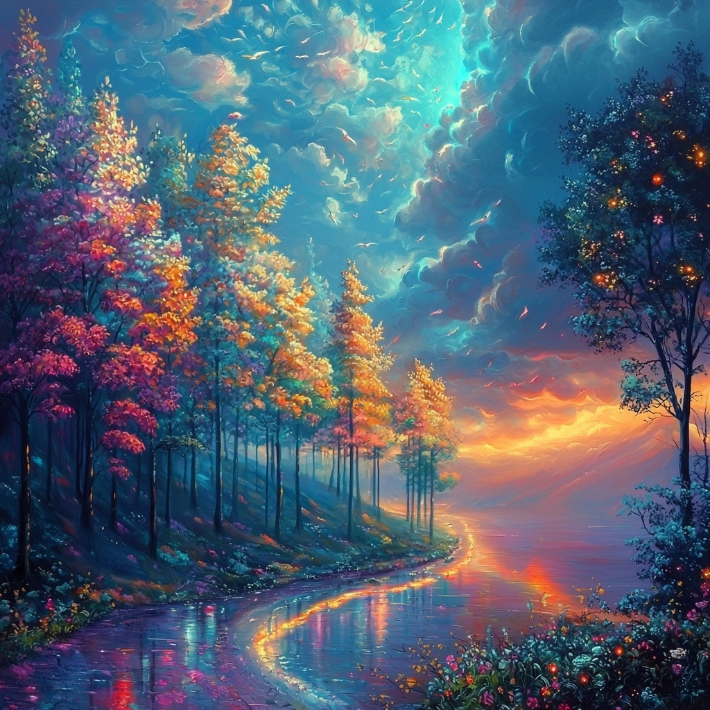 The interplay of light and shadow creates a dynamic feel, with vibrant blues and oranges dominating the sky and water. The textures of clouds and trees exhibit meticulous detailing, enhancing depth and a sense of movement across the scene.