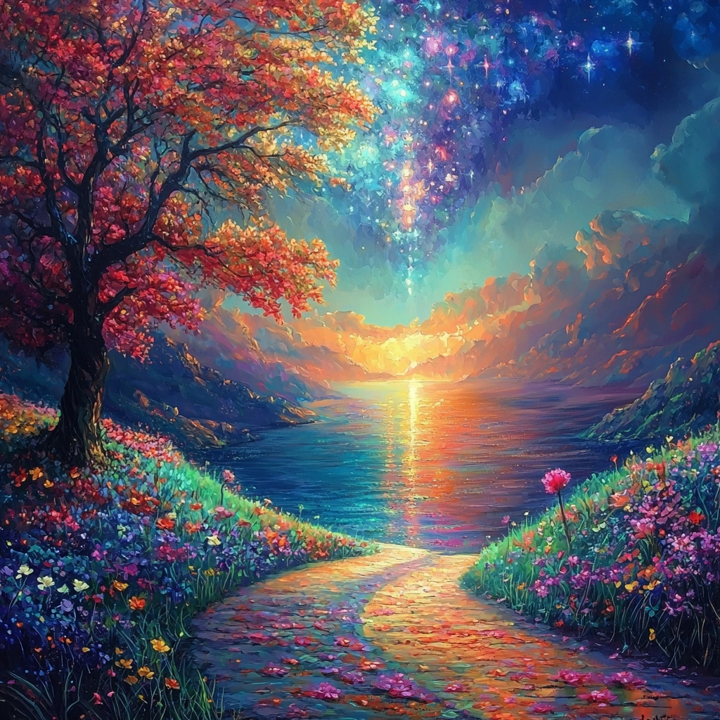 A colorful display featuring vivid hues and reflections with a dynamic composition.