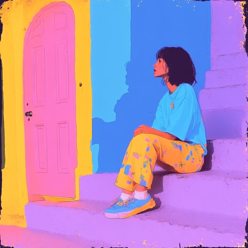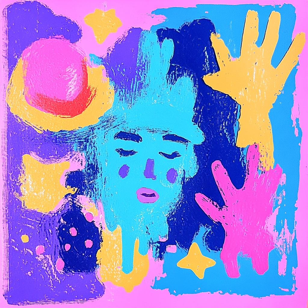The use of high-contrast colors creates a vibrant and energetic visual effect. The lighting is consistent and emphasizes bright, saturated hues, enhancing the textures. A sense of depth is achieved through bold color blocking and distinct outlines.