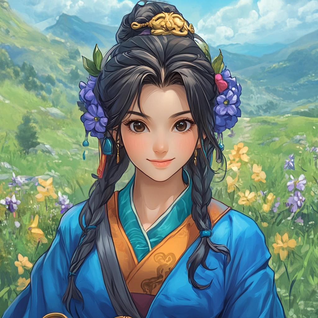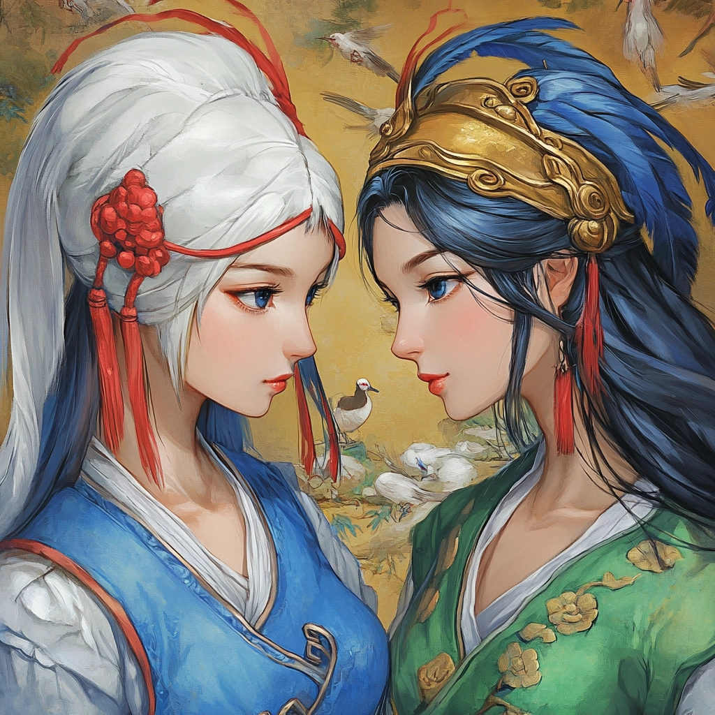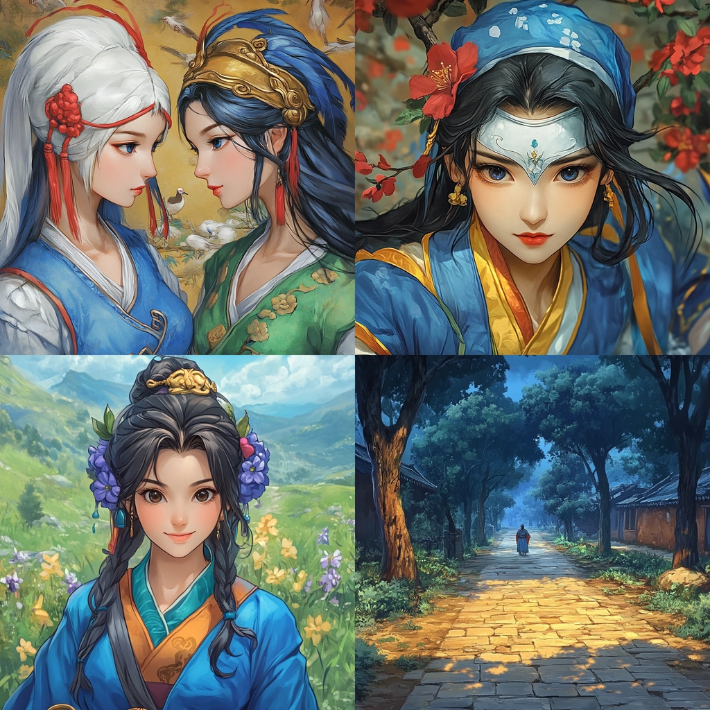 Bright and vivid colors dominate, with a strong emphasis on intricate detailing that showcases cultural costumes and settings. The spatial depth is apparent through layered compositions that create a vivid sense of environment, aided by natural textural renderings.