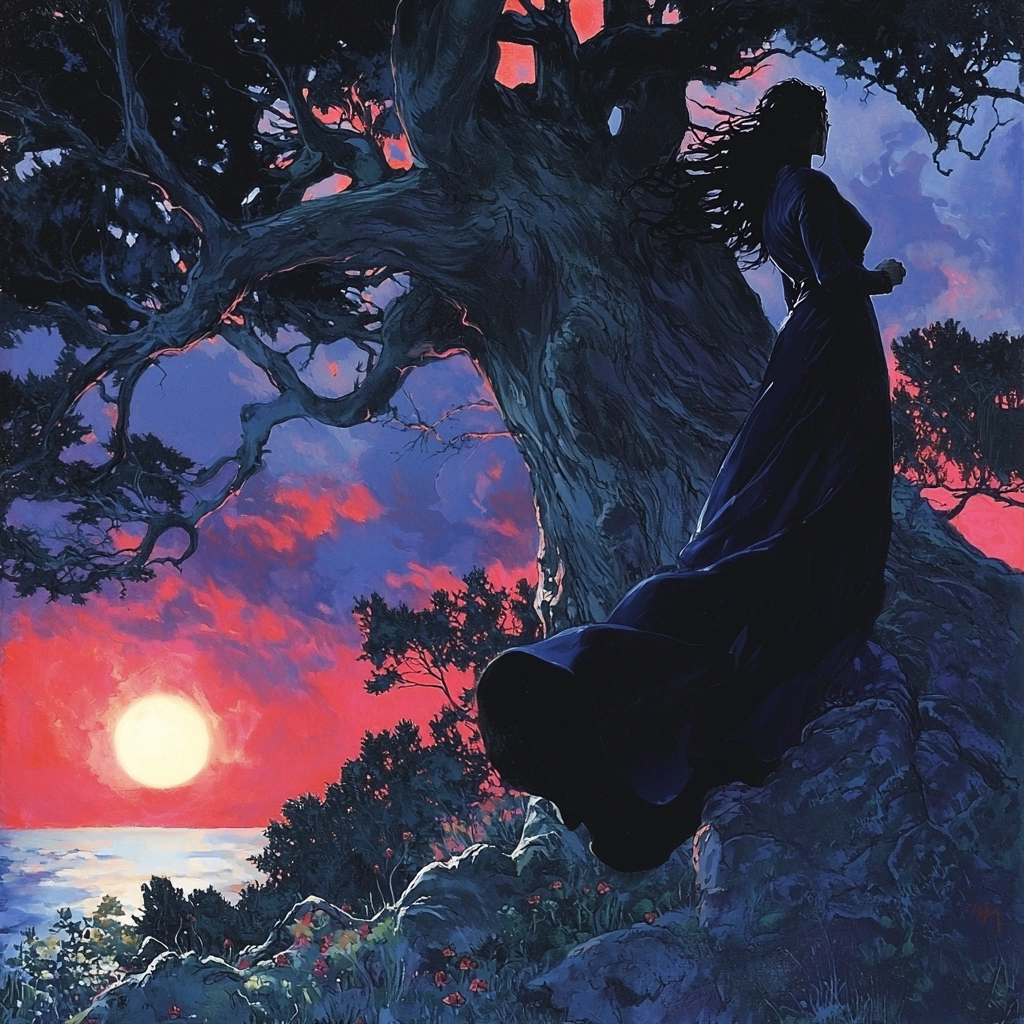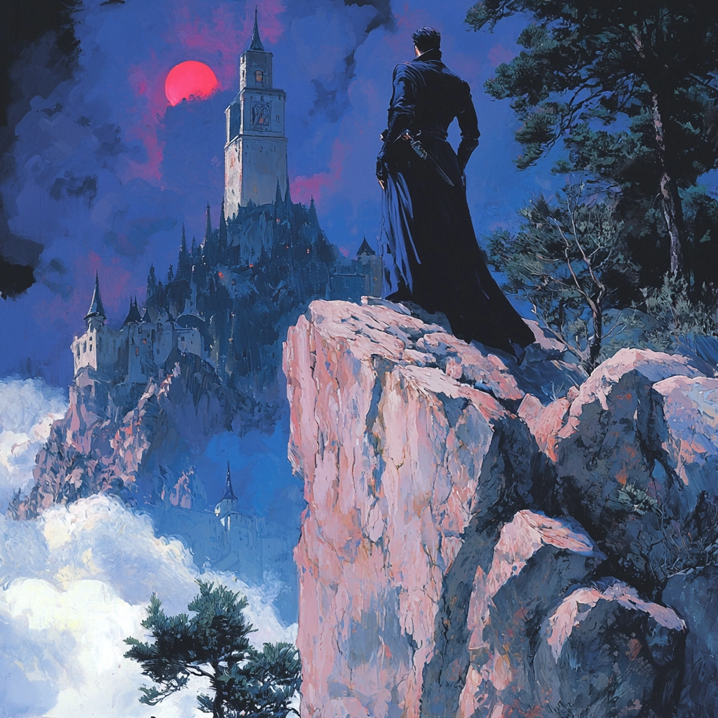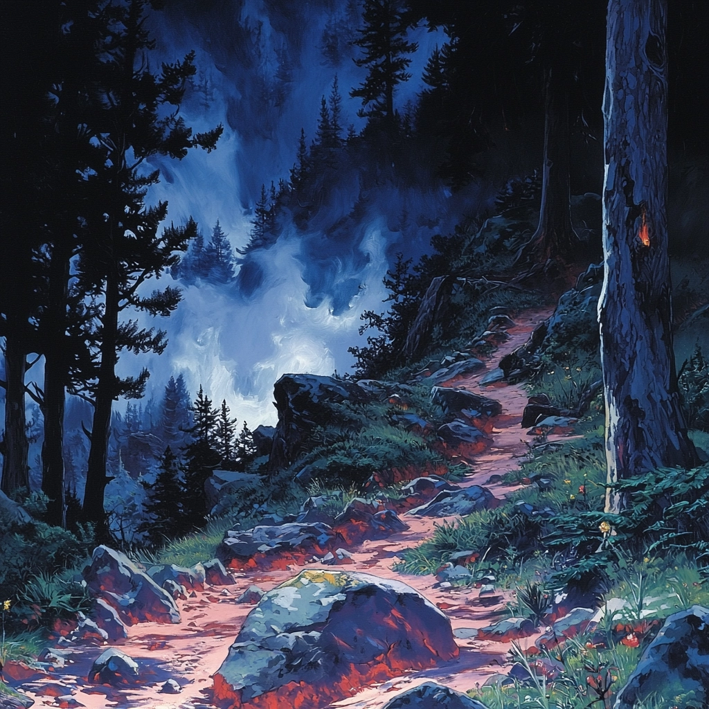 Intense lighting contrasts illuminate deep blues against vibrant reds, with a crisp white accentuating depth. Strong textures and layered depth enhance spatial dynamics and visual tension.