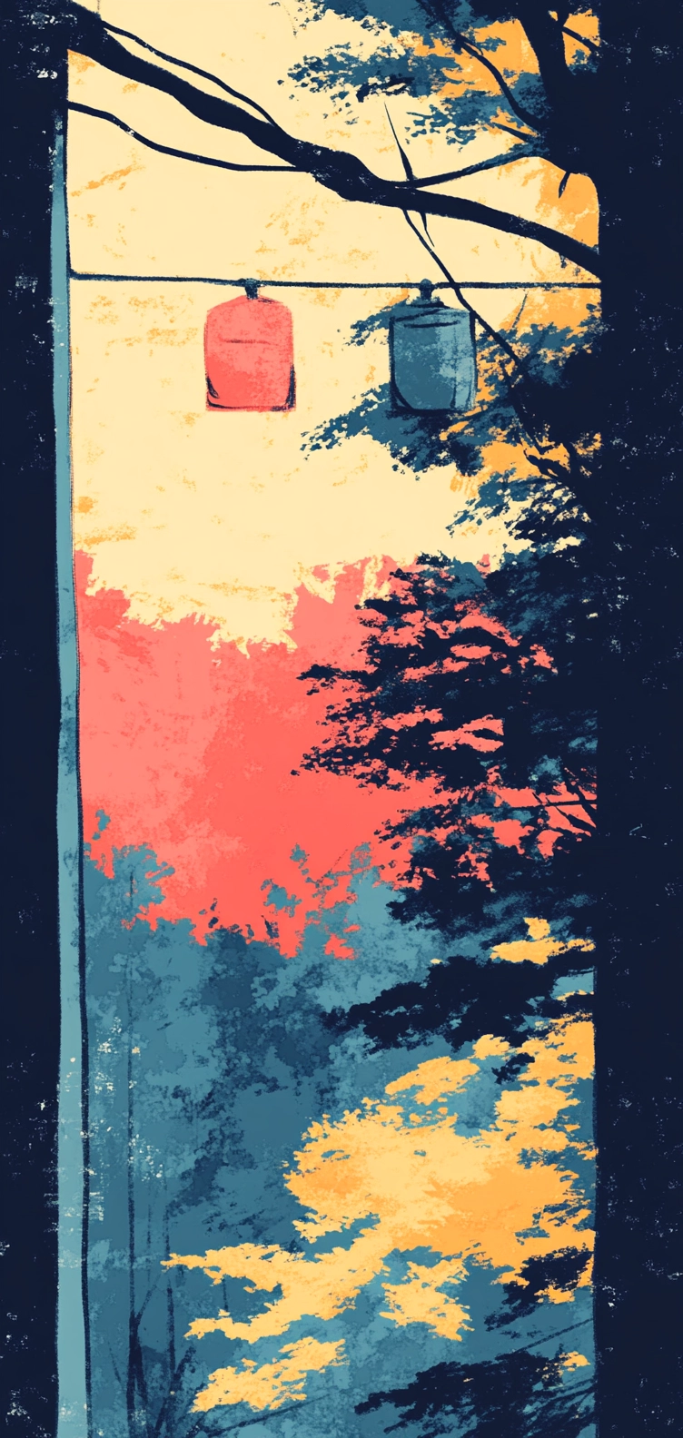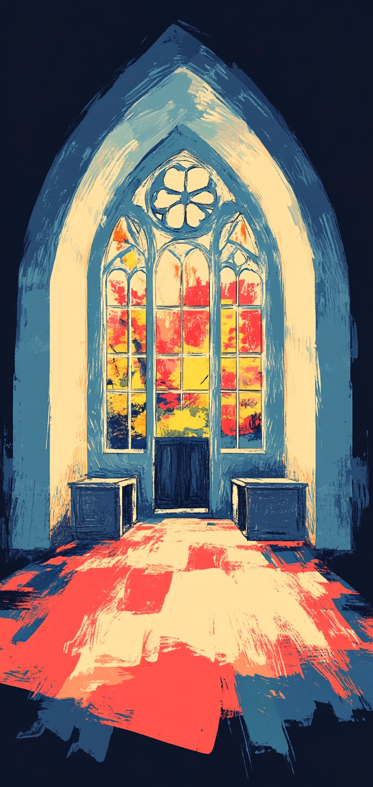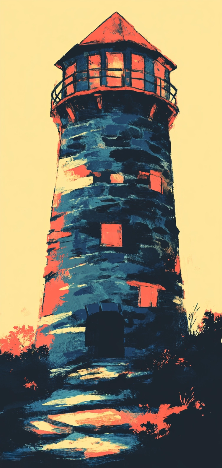 Prominent use of strong, contrasting colors with dark shadows creates dramatic tension. The composition emphasizes light and dark interplay, enhancing depth and space. Textures appear pronounced with heavy brushstrokes visible in primary elements.
