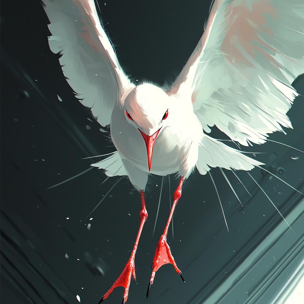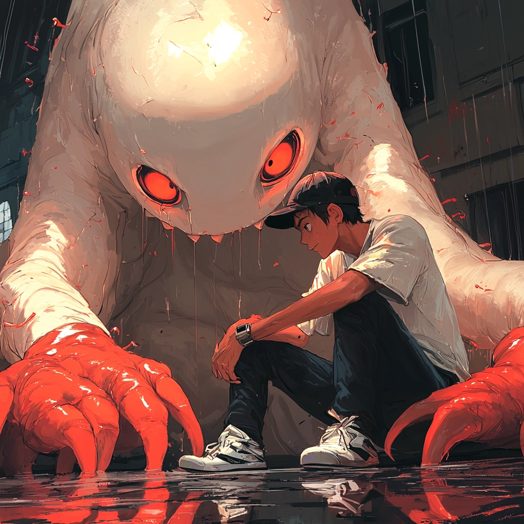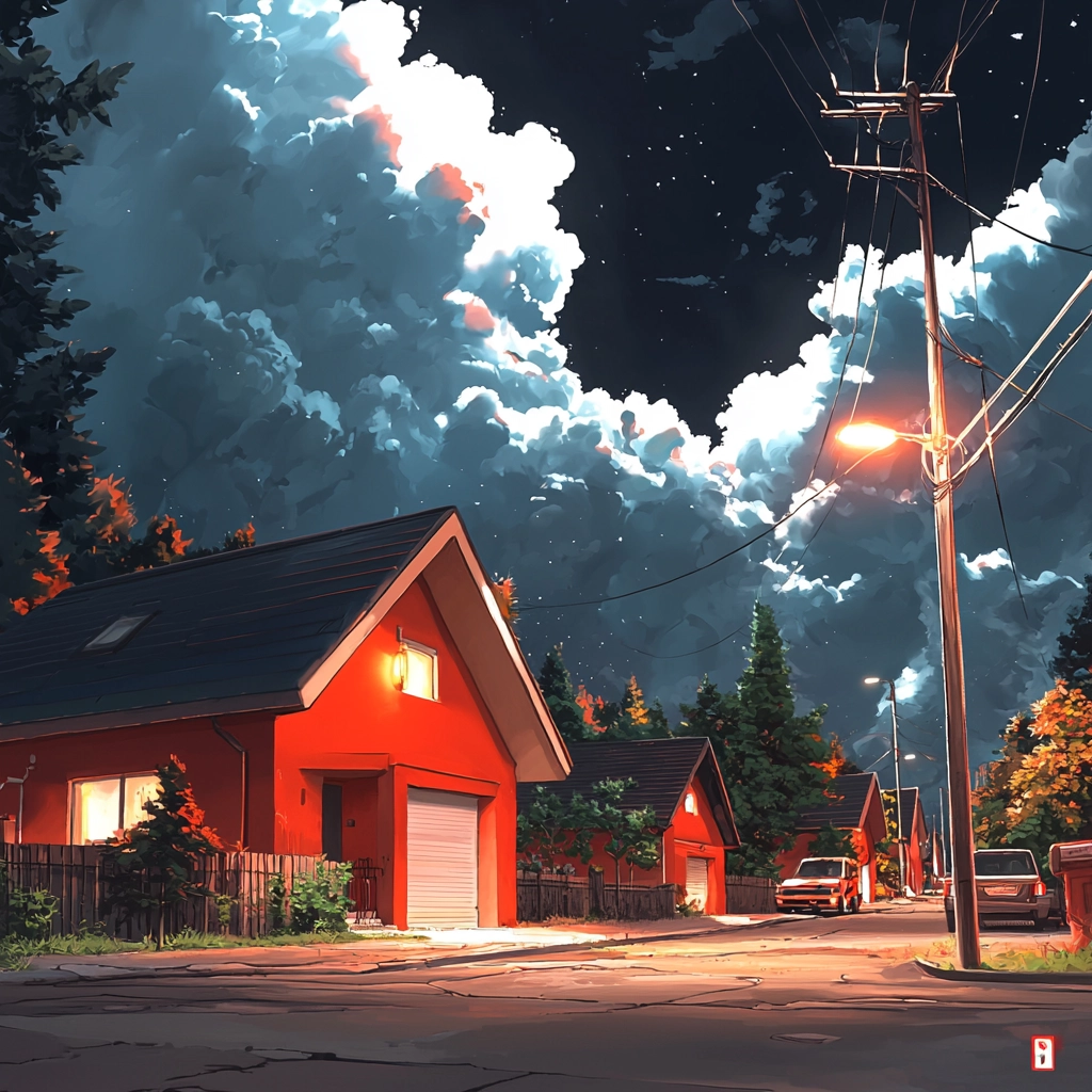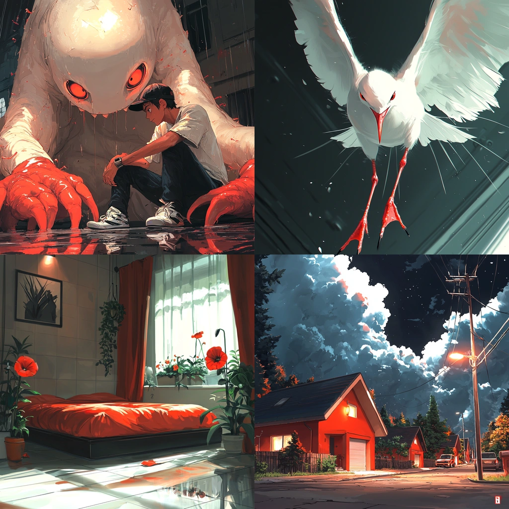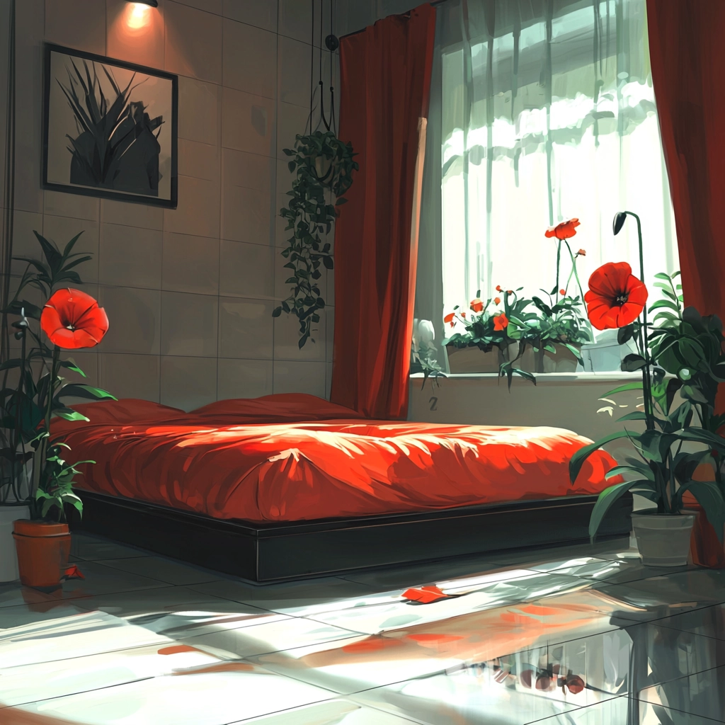 Distinct light sources create sharp, deep shadows, enhancing spatial depth. Textures are smooth yet vividly detailed, emphasizing sharp contrasts between saturated reds and cool blues.