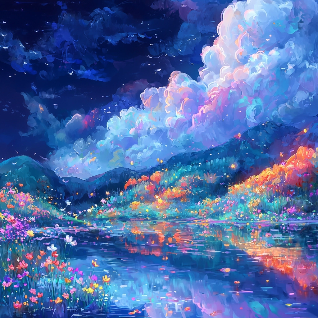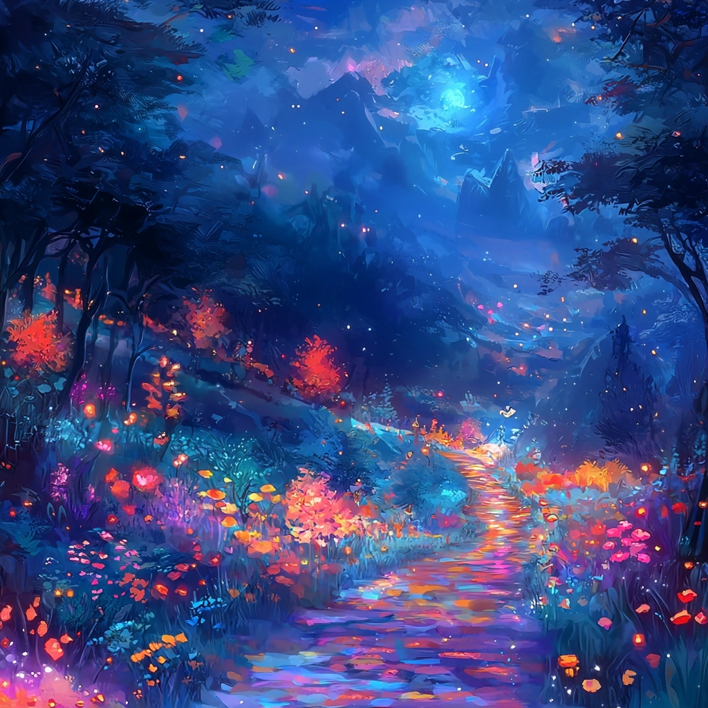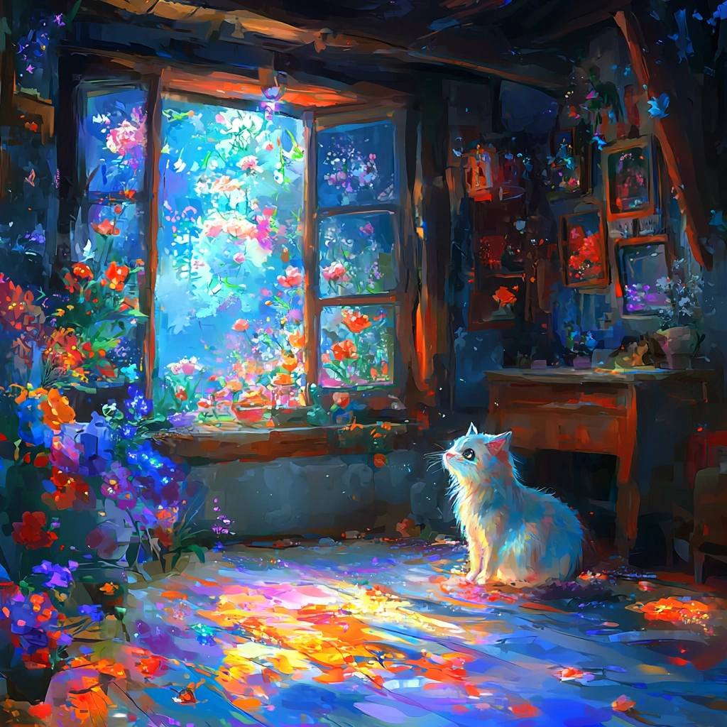 Dramatic lighting highlights vibrant contrasts between cool blues and vivid oranges, enhancing spatial depth and intricate detail. Textural brushwork adds dynamic energy, with swirling, lively compositions that elevate color intensity and shadow interplay.