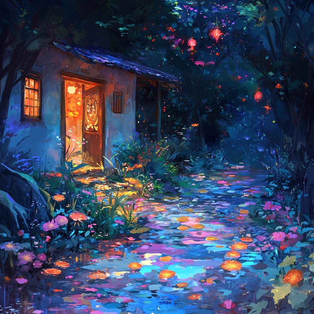 Rich blues dominate with contrasting warm lights creating lively yet intricate scenes.