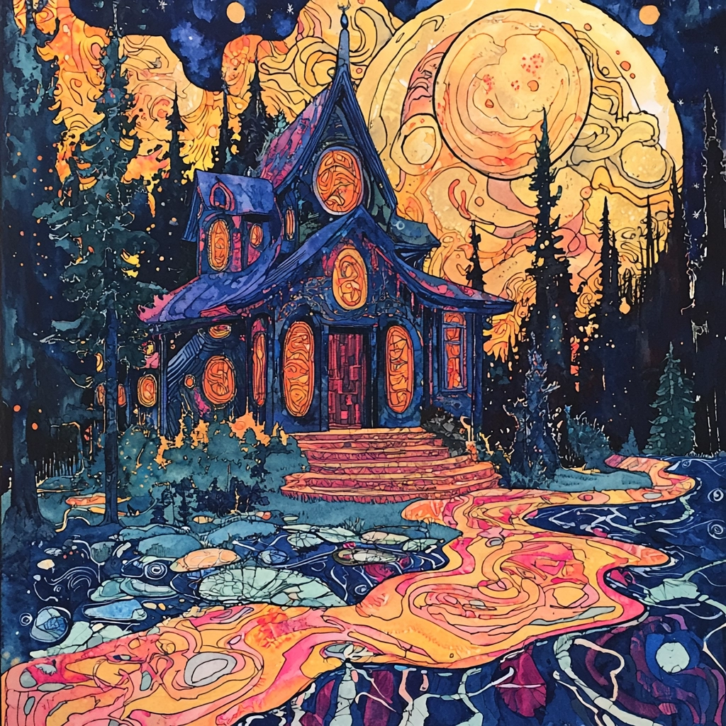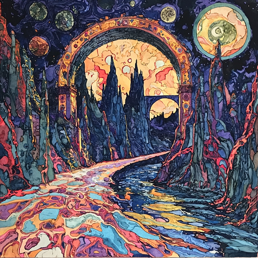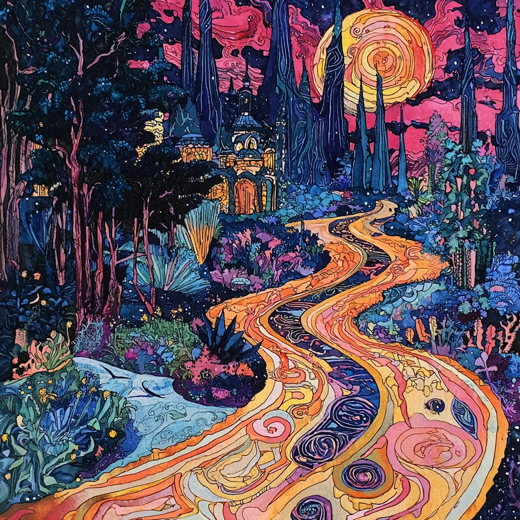 The artwork utilizes dramatic lighting effects to accentuate the vivid swirls of color, with intricate lines creating a sense of depth and texture. The contrast between dark blue and bright orange and pink enriches the spatial interaction, lending the composition an impression of rhythmic movement.