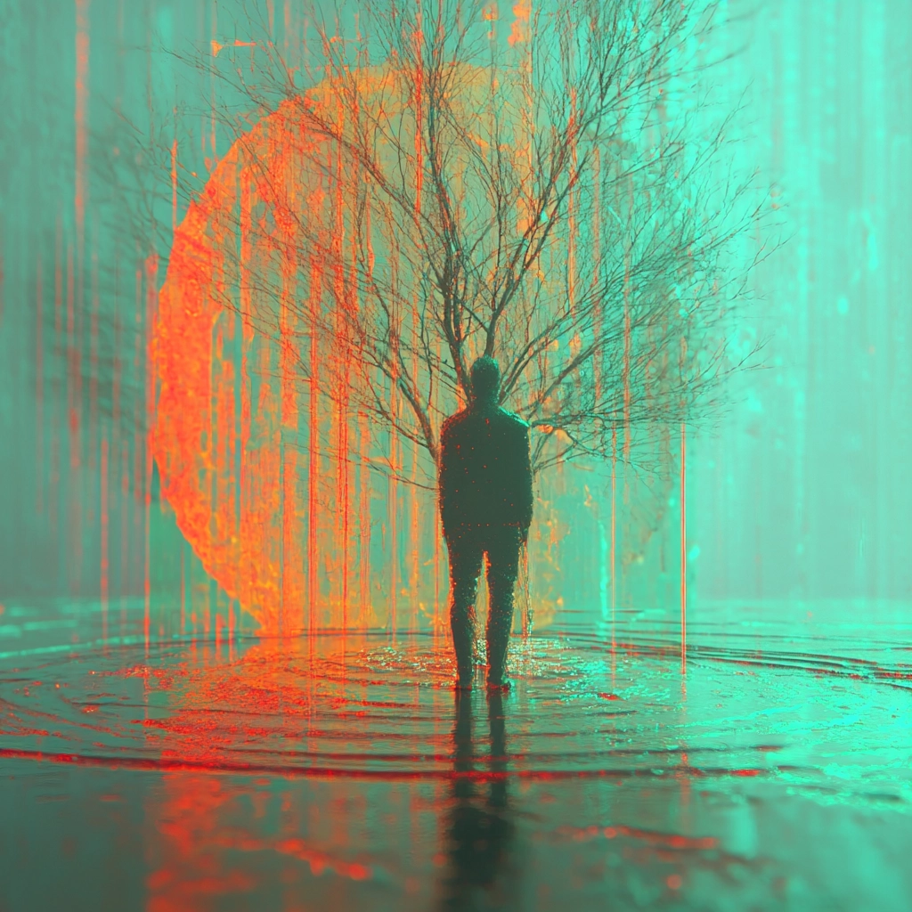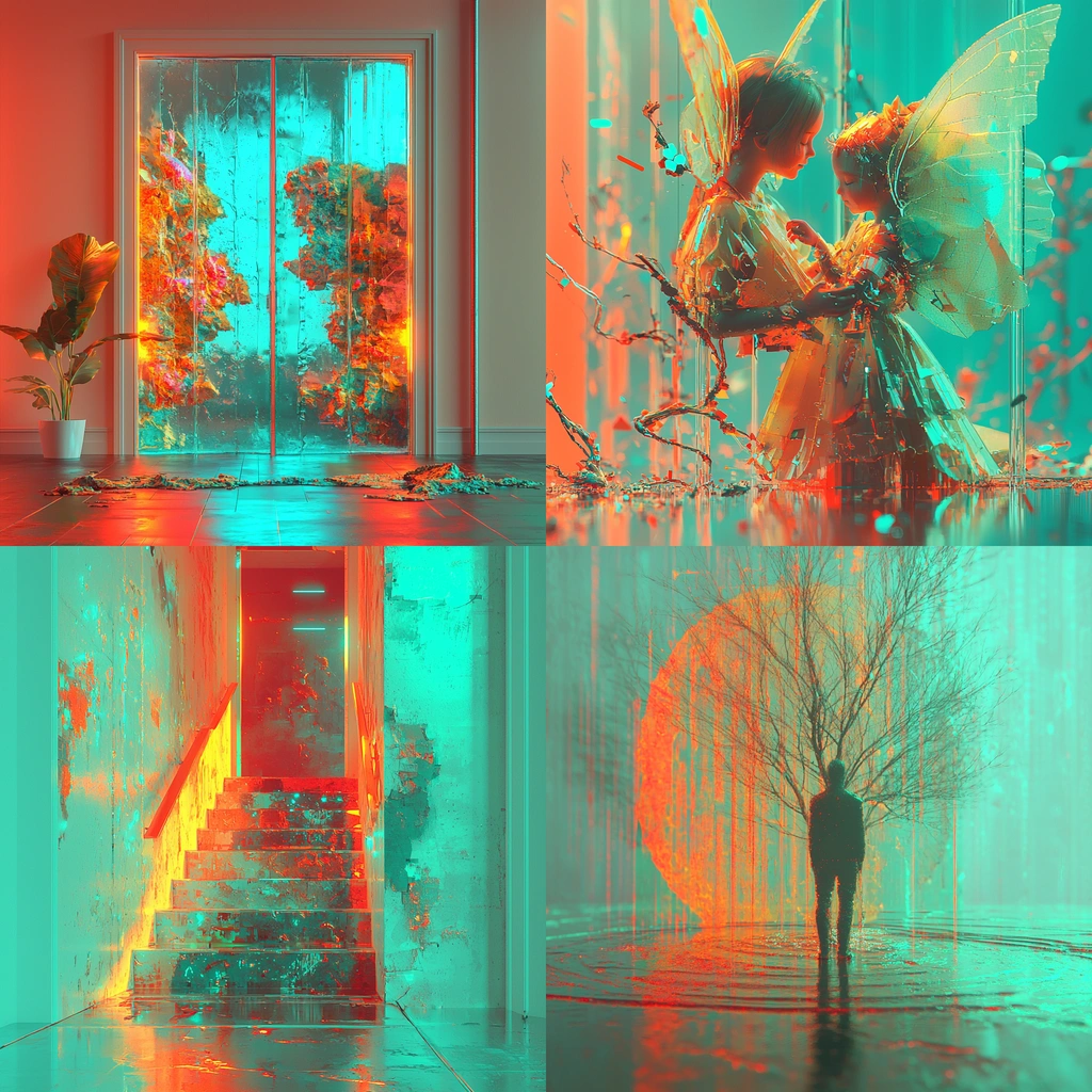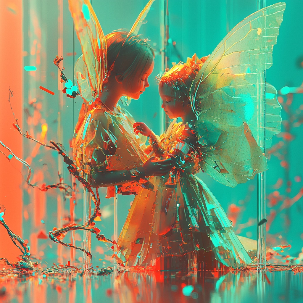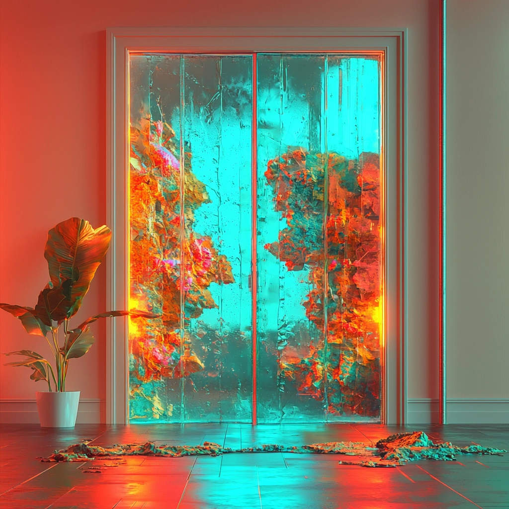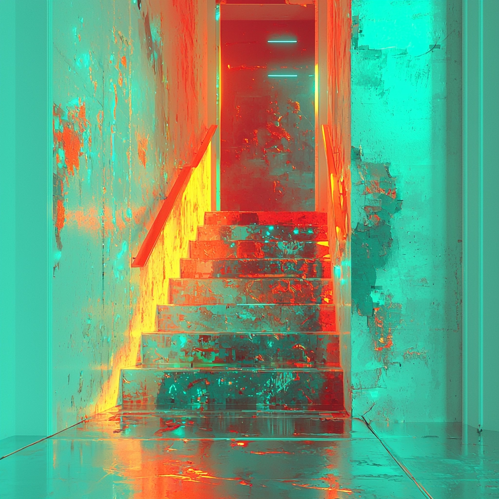 Bold lighting contrasts enhance spatial depth, while vibrant colors define outlines with a sharp clarity. Textural details create dynamic movement within a vibrant color palette.