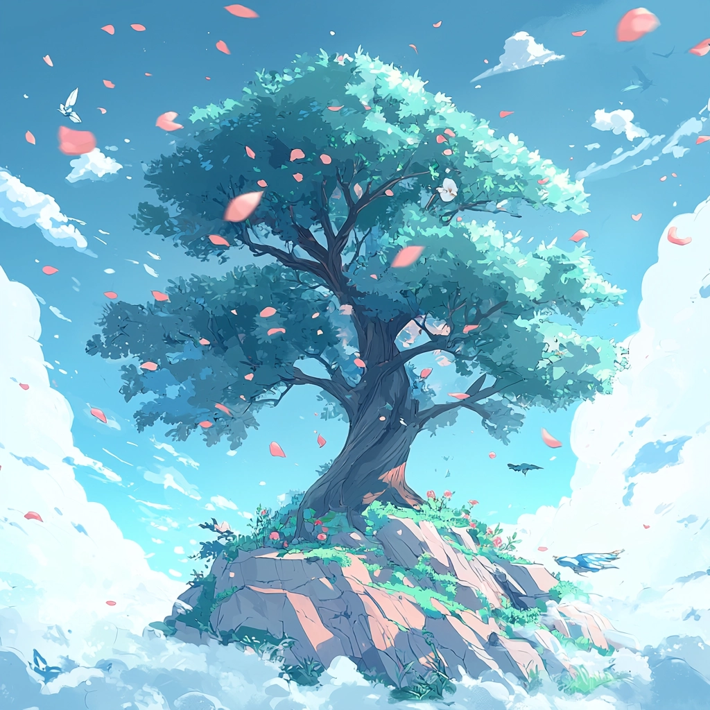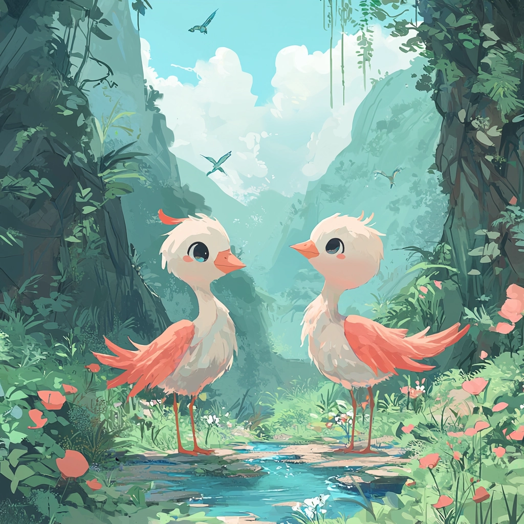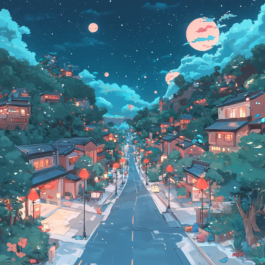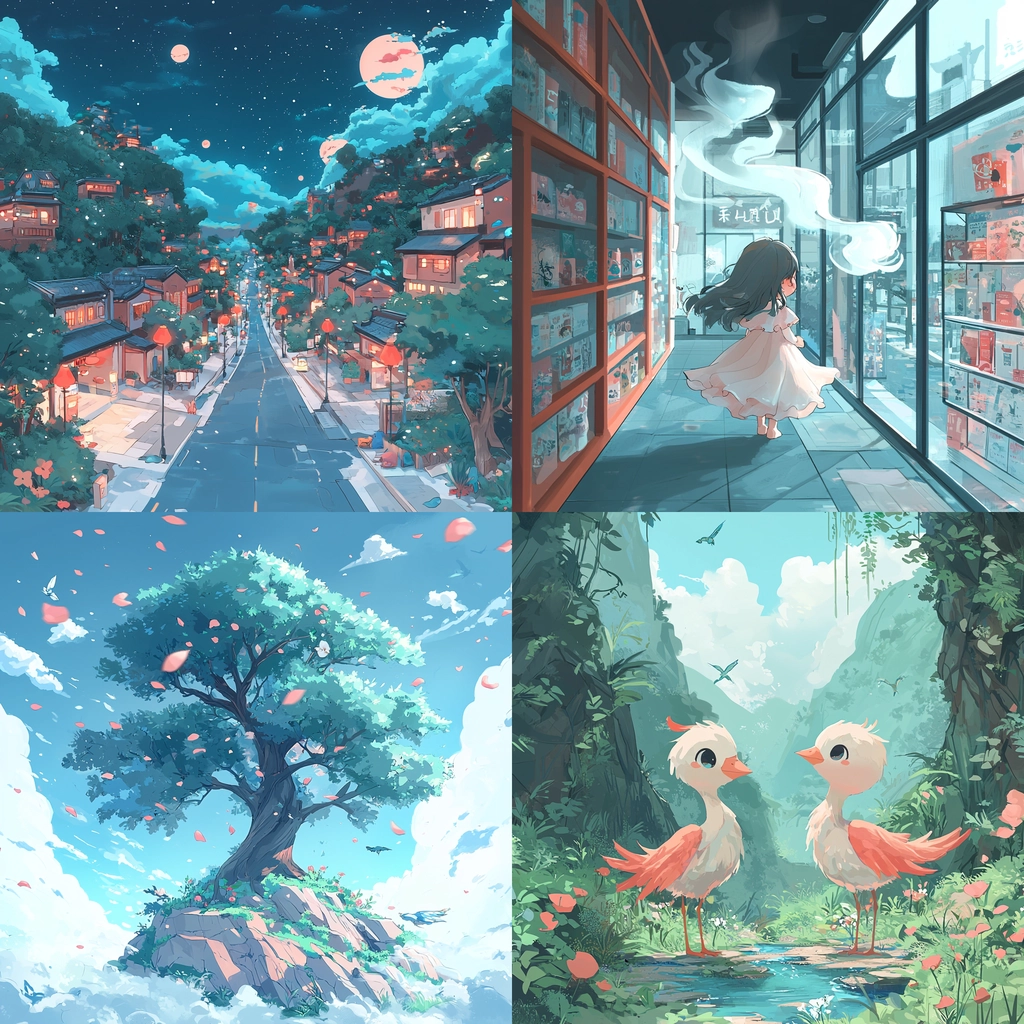 The cyan and red tones contrast sharply under vivid lighting, enhancing the intricate and stylized nature of the scenes. The spatial configuration draws the viewer's eye deep into the picturesque landscapes, with textures that exhibit smoothness and clarity.