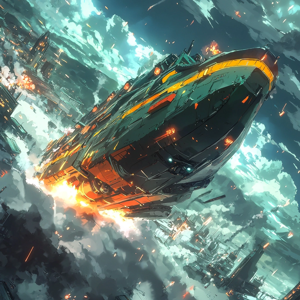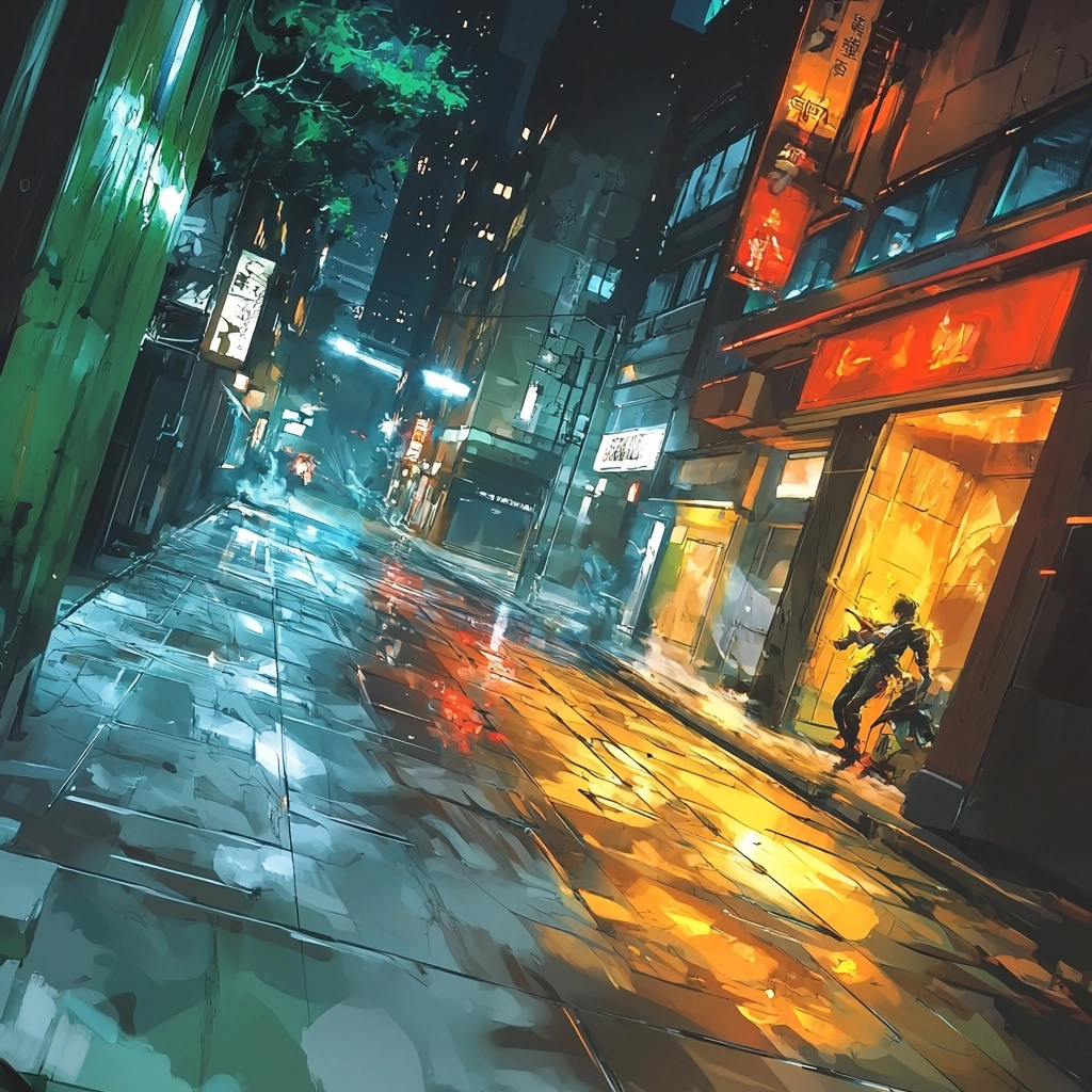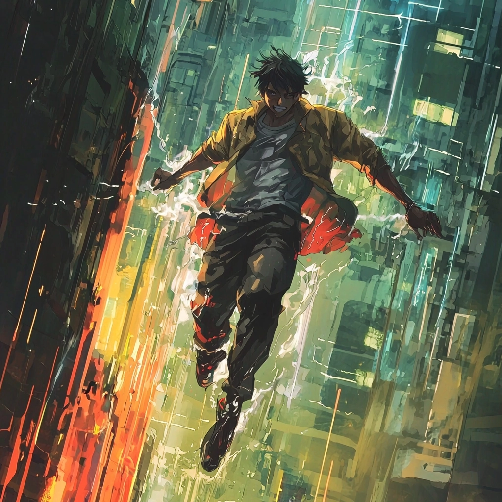 Lighting effects create a glowing atmosphere and depth, with vibrant colors enhancing the sense of motion. The integration of crisp textures offers a stark spatial definition and surface vibrancy.