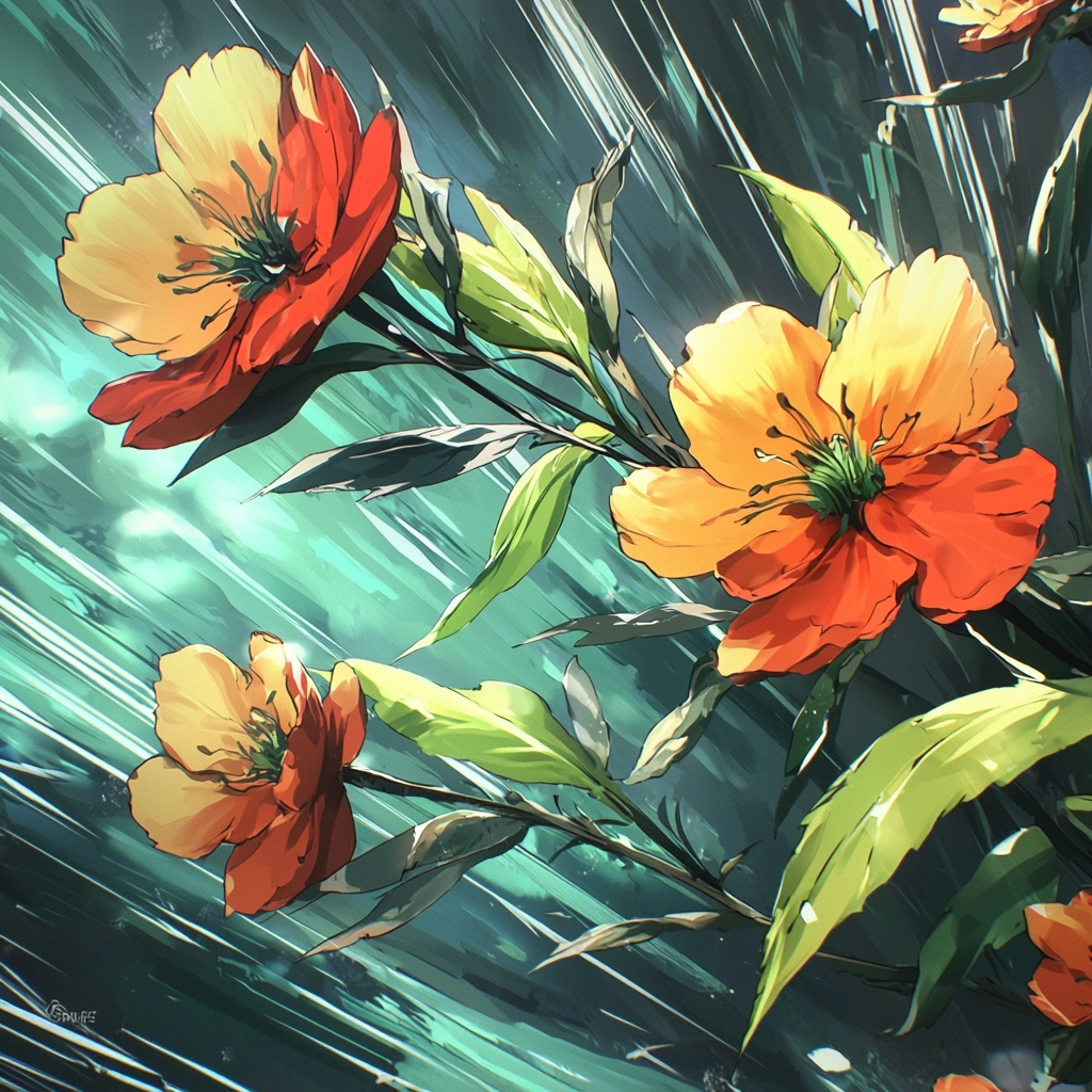 Dynamic compositions with vivid color contrasts.