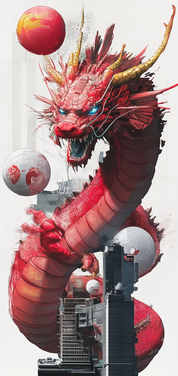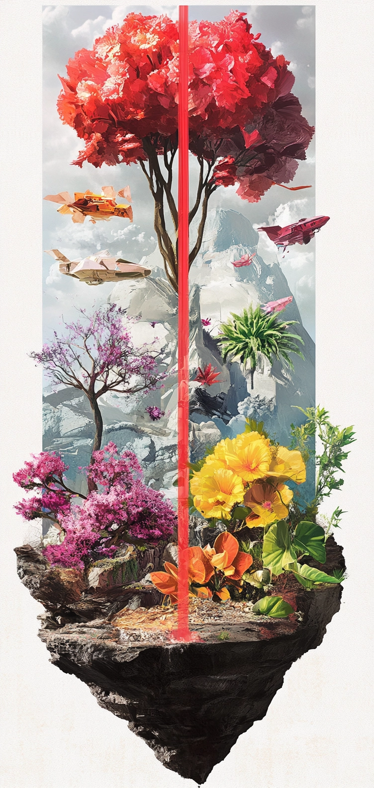 This piece uses bright, contrasting colors and detailed compositions with a mix of natural and architectural elements.