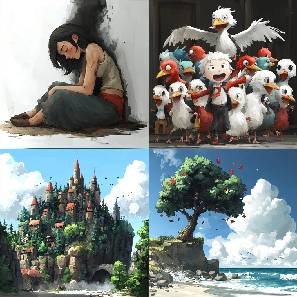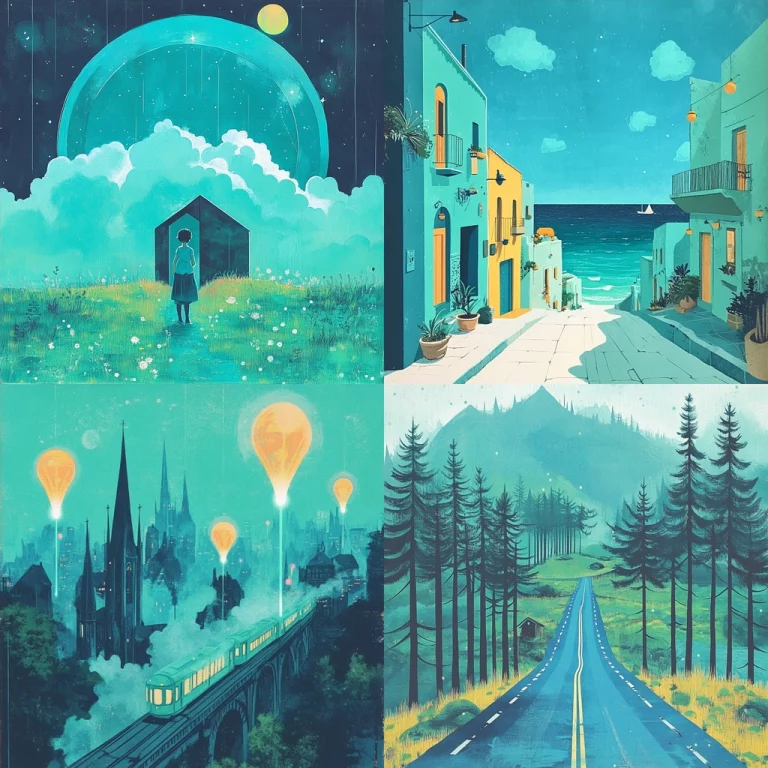 The scenes utilize a diverse palette with strong contrasts and dynamic forms, combining both bold and pastel hues for depth.