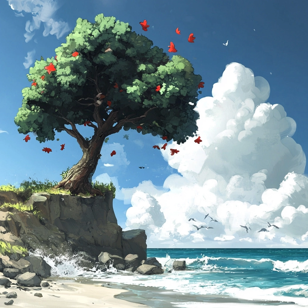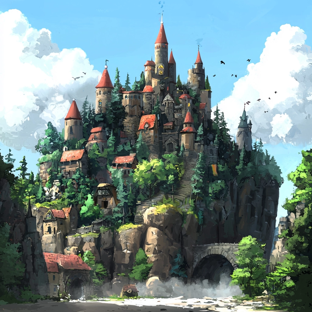 The use of lighting enhances the vivid colors giving depth and volume, with realistic textural details in shaded and lit areas. Spatial elements create an immersive scene, highlighting complex layers with a focus on both foreground and background elements.