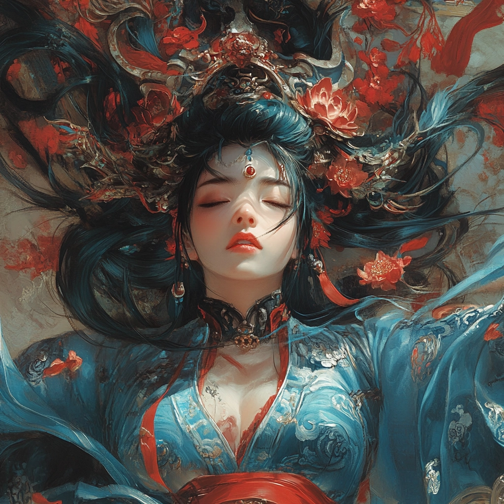 The lighting effects are dramatic with meticulously rendered highlights and shadows. The colors are vivid, with an emphasis on bright reds contrasting deep blues and dark tones. There is a pronounced sense of depth and space, augmented by detailed textures and refined craftsmanship.