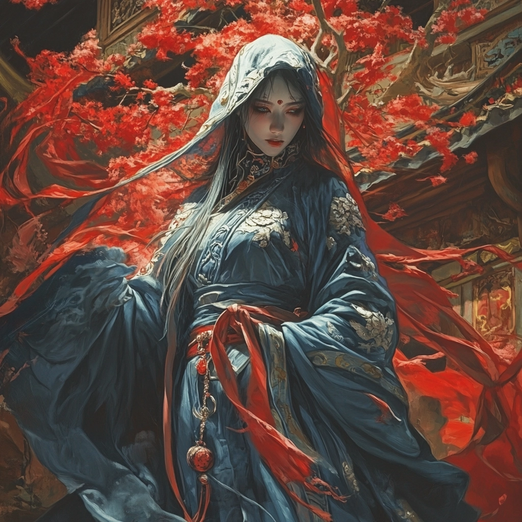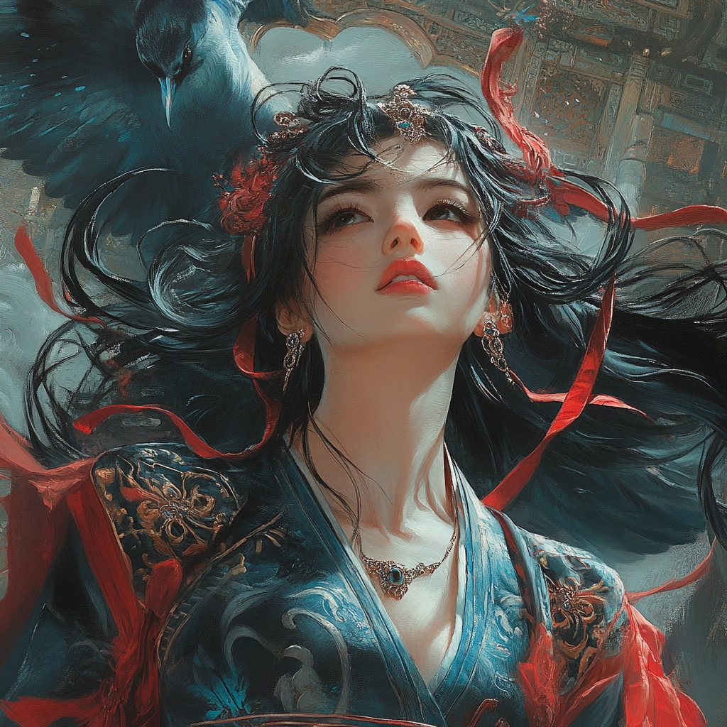 Dynamic use of bold colors and intricate details enhancing a mystical aesthetic.