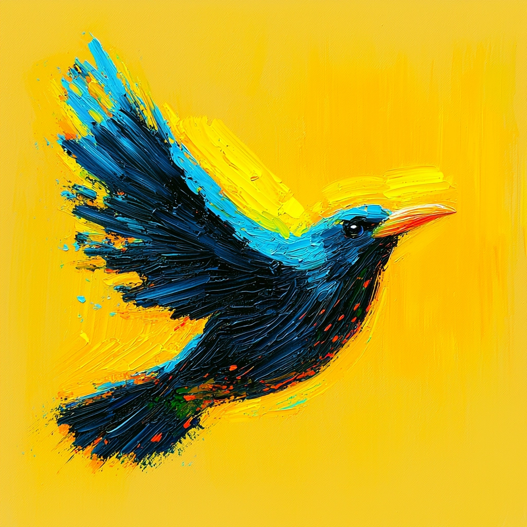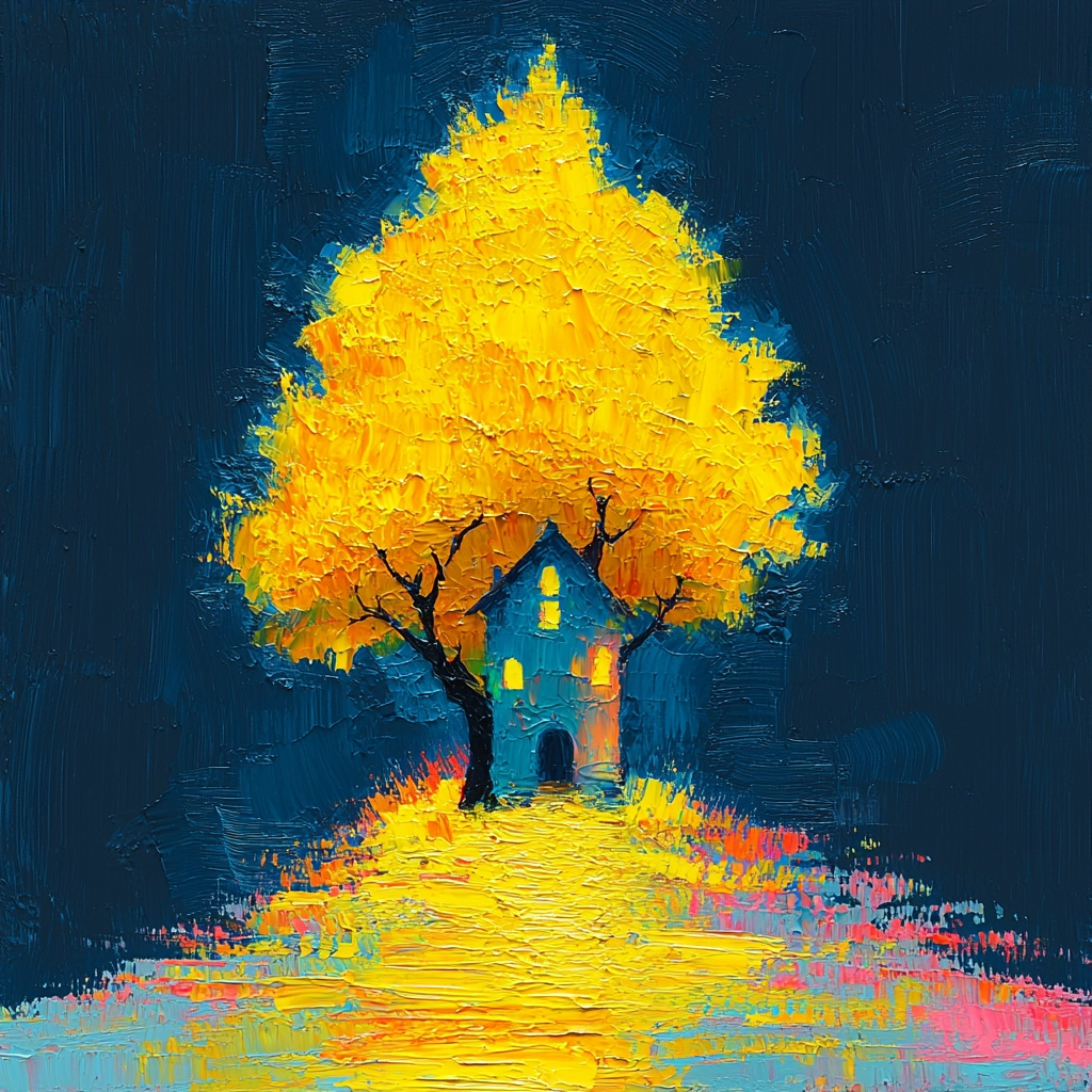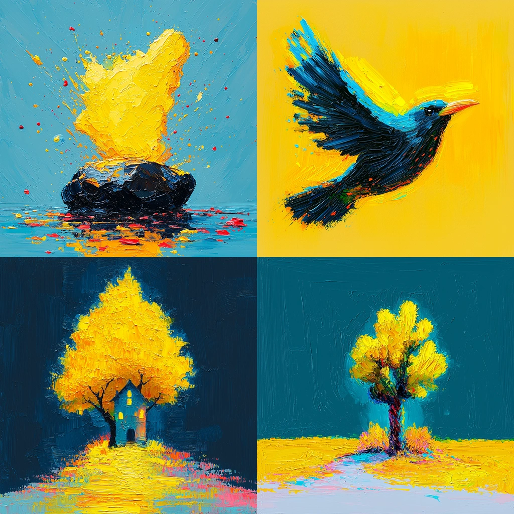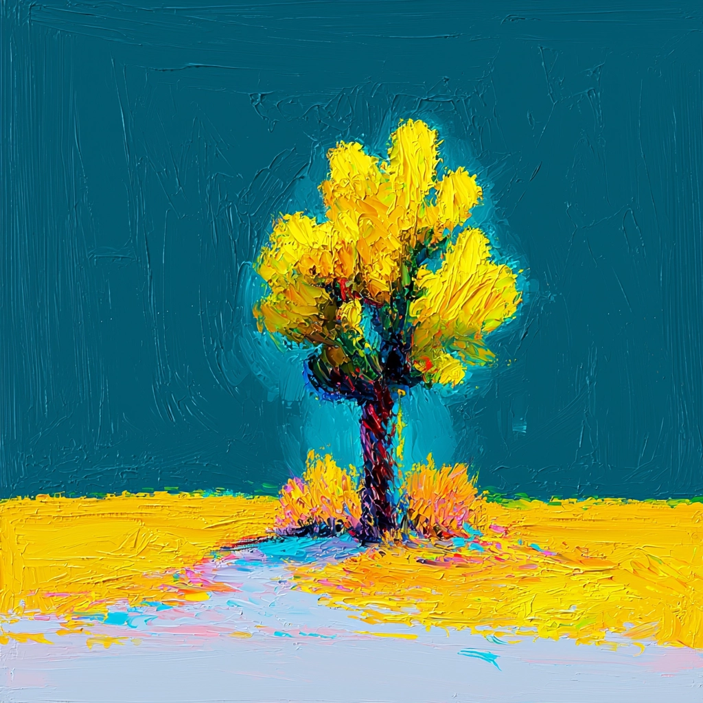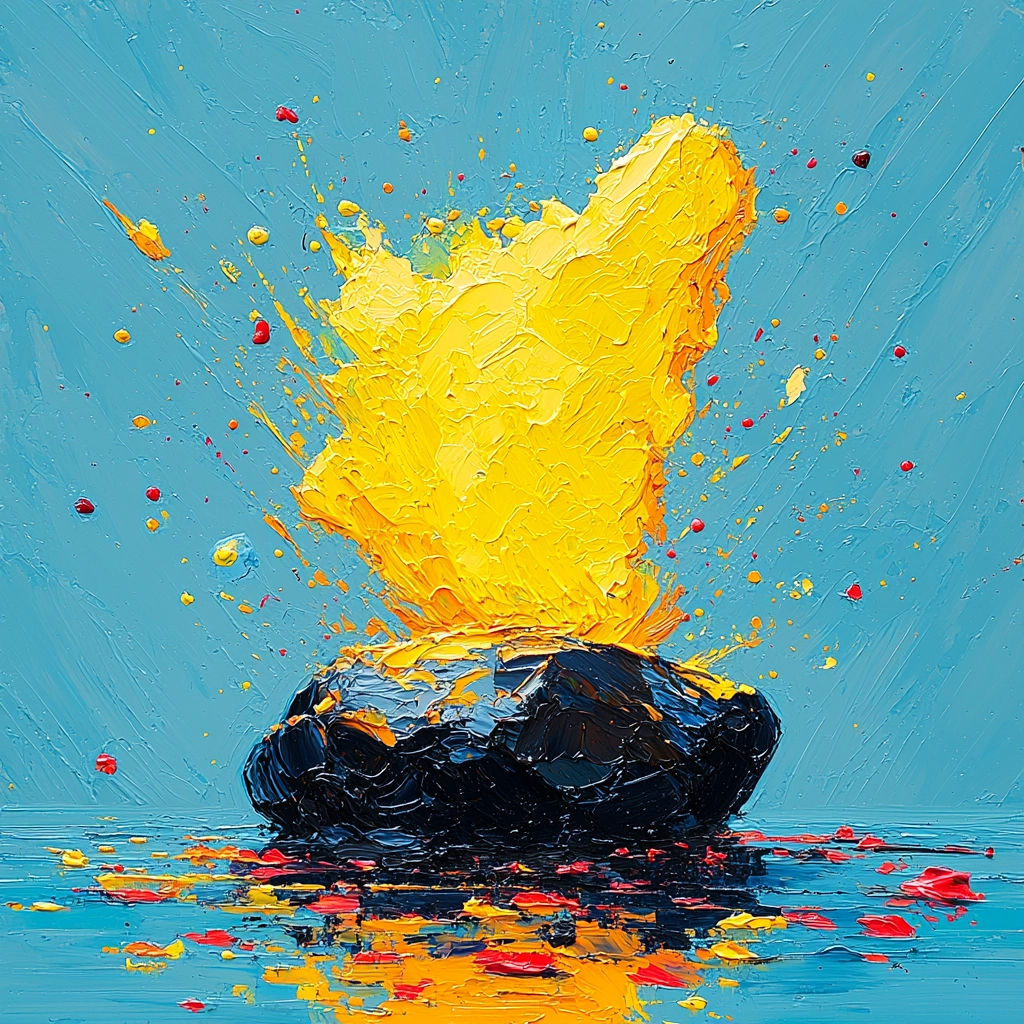 Bold brush strokes dominate, with vibrant yellow and deep blue enhancing visual texture. Energetic lighting ignites color interactions, while layered composition builds spatial depth, maintaining vibrant intensity.