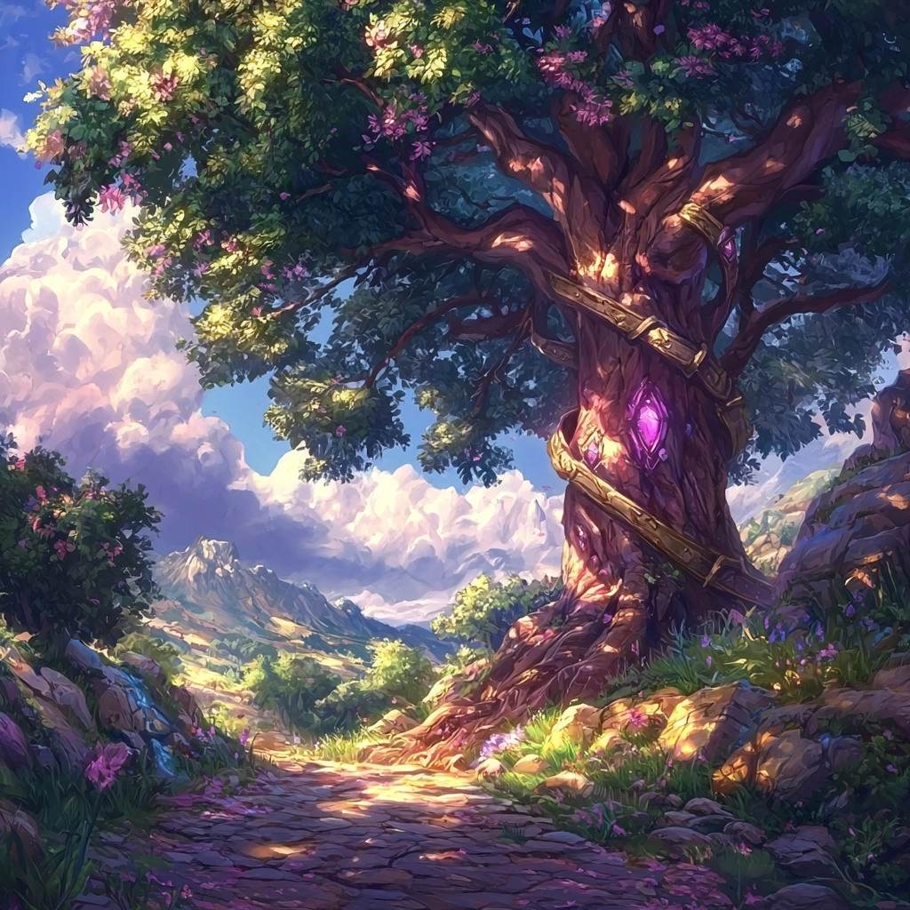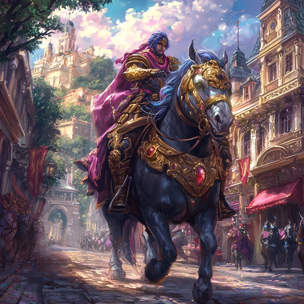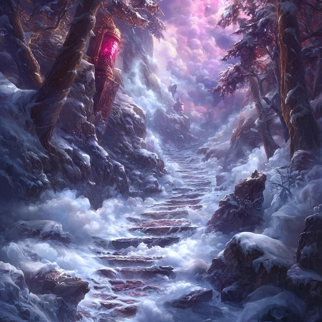 The lighting effects highlight intricate details and create high contrasts between shadows and illuminated areas. Color characteristics include saturated hues with glowing purples and warm golds. Spatial sense is enhanced by carefully rendered depth and perspective, while texture expression gives a tactile feel to various surfaces.