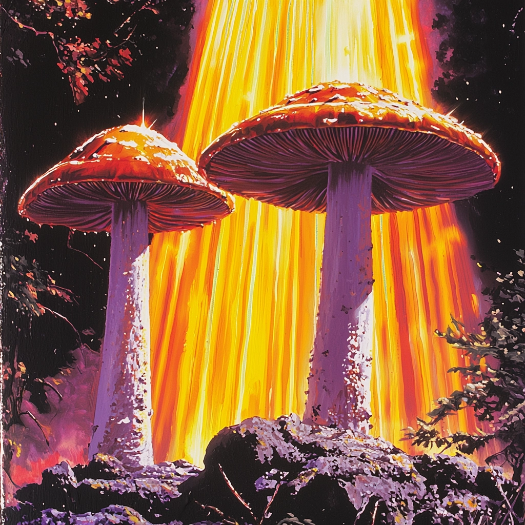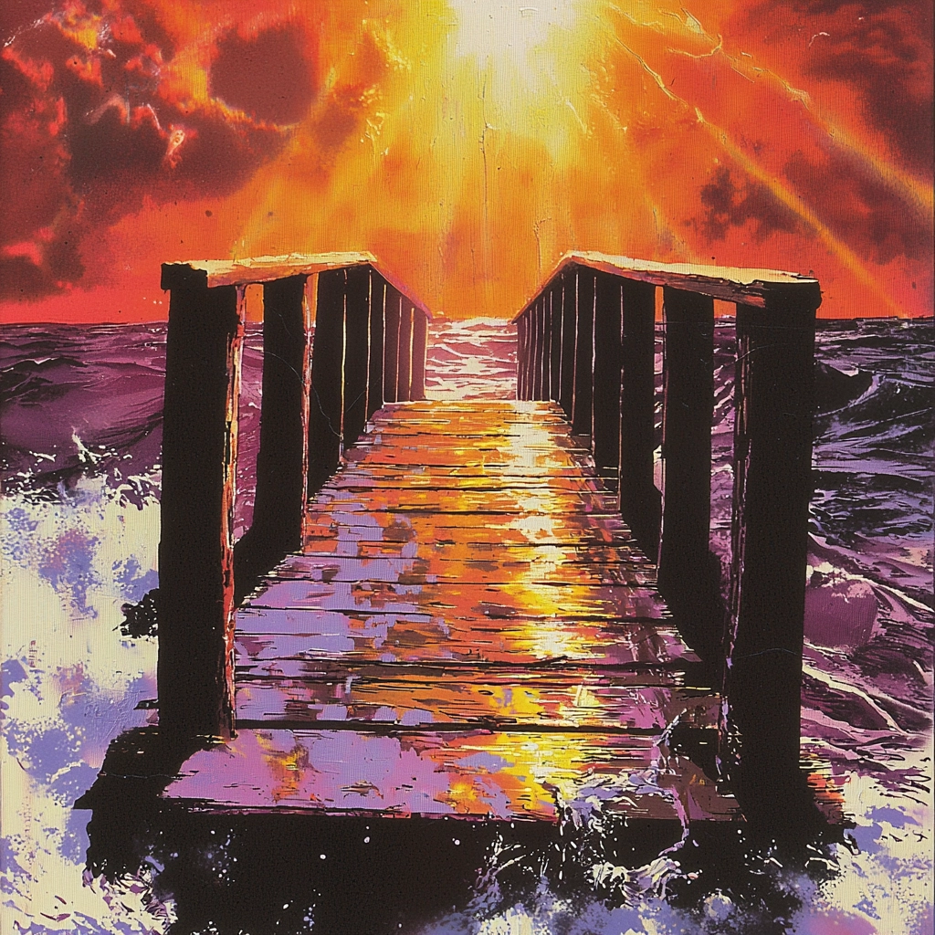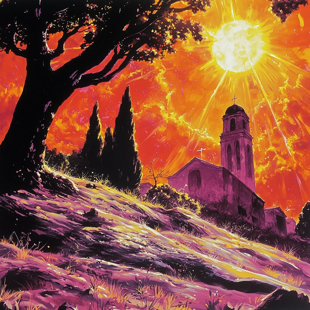 The artwork features high-contrast lighting with vivid orange dominating the visual field, intertwined with contrasting purples. Sharp lighting effects enhance texture and surface detail, while dynamic, severe contrasts intensify depth perceptions and spatial drama.