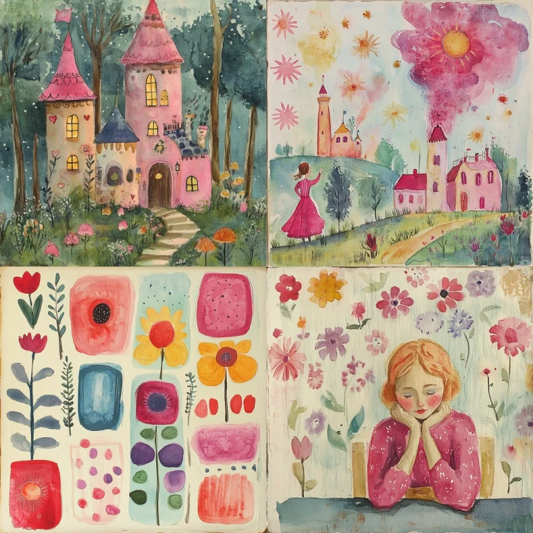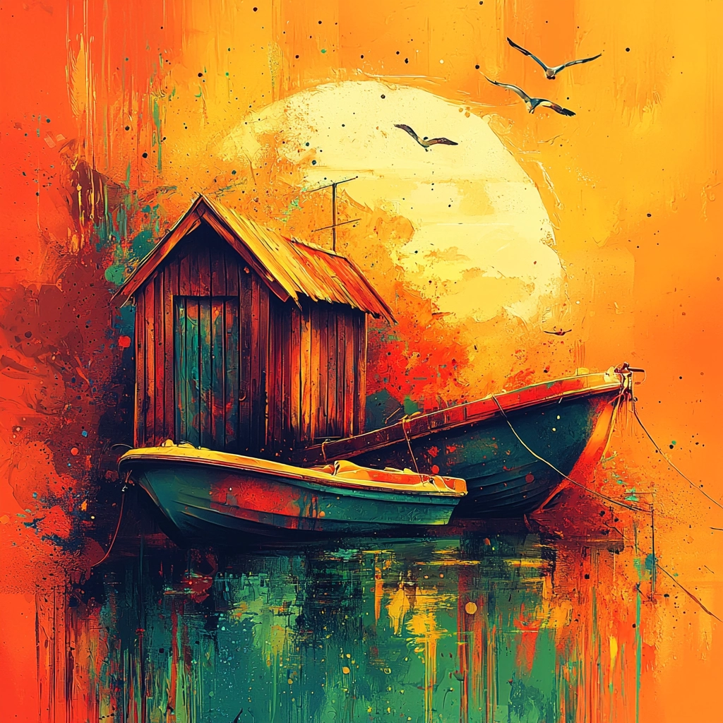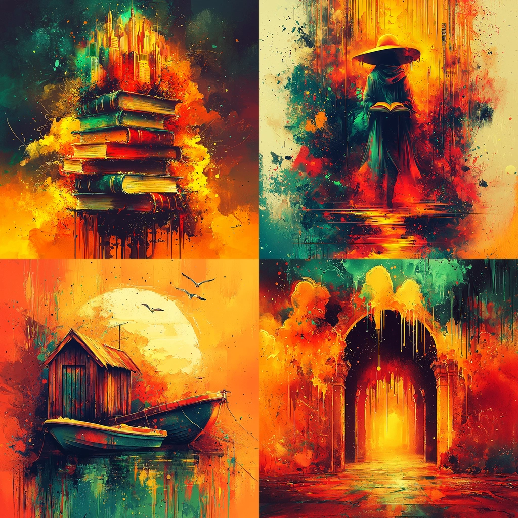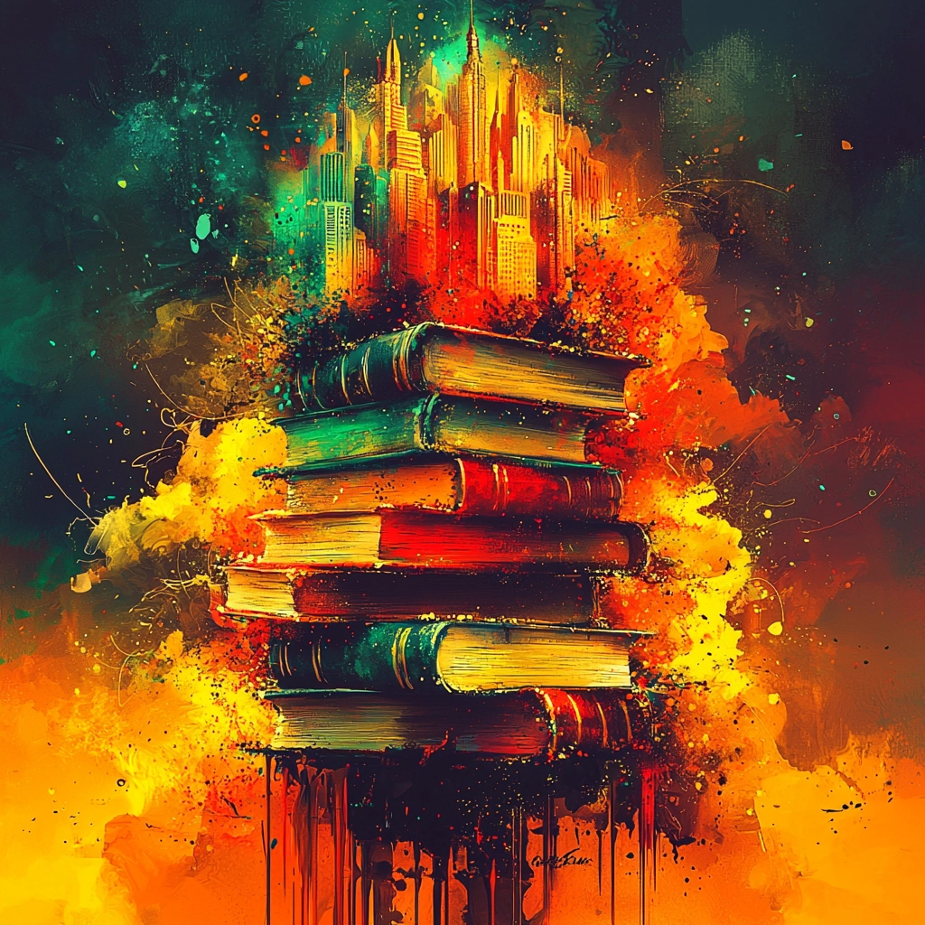 Dynamic use of bright fiery hues with contrasting dark shadows.