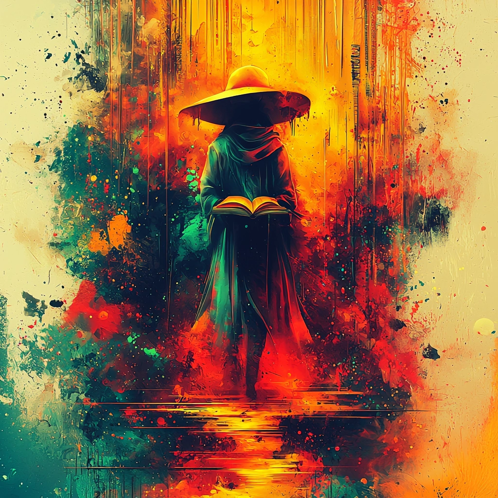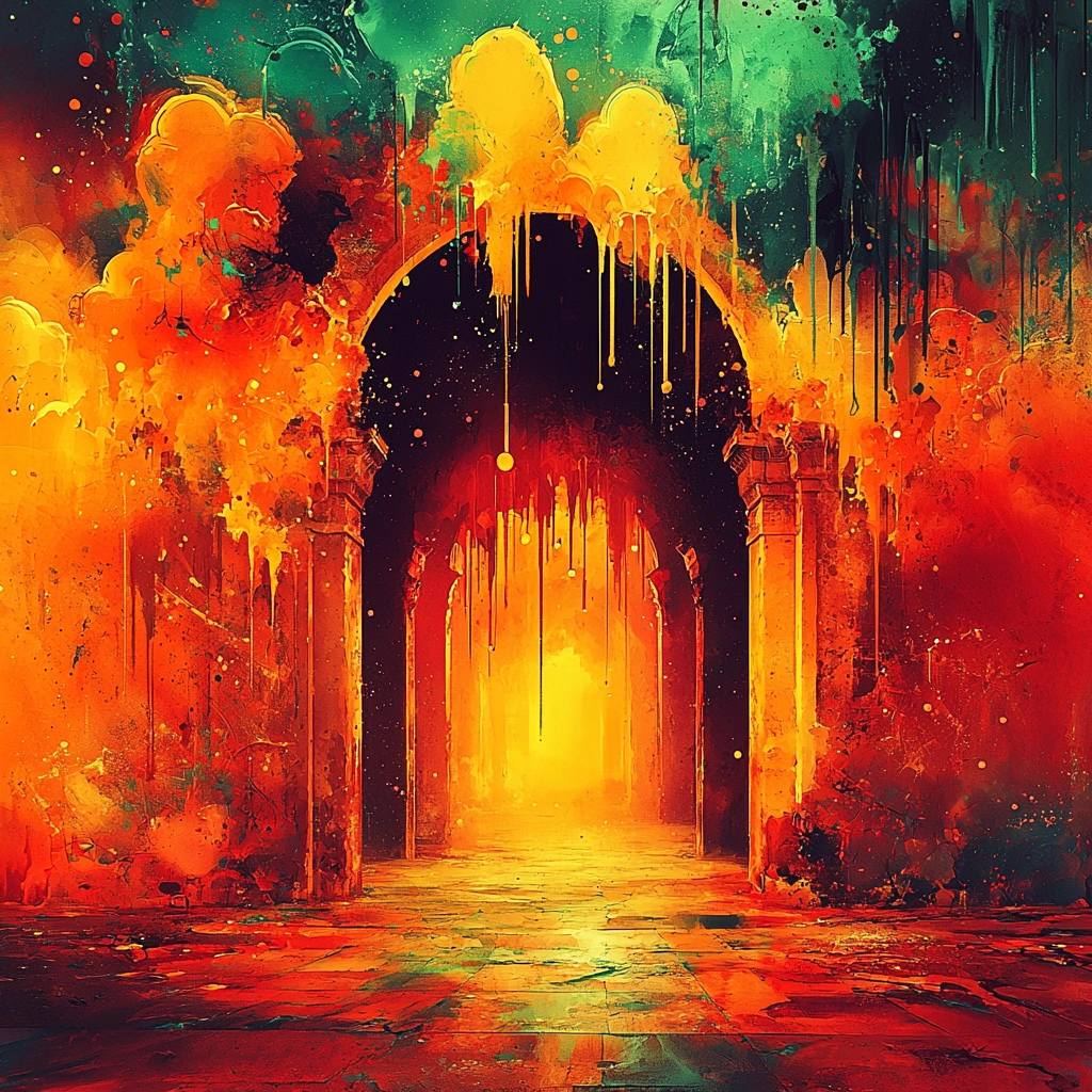 Lighting intensifies the rich warm colors, emphasizing contrasts with the deep shadows for a dramatic spatial impact. The textures are emphasized through fluid, expressive drips that suggest motion and intensity, creating a vivid interplay between form and background.