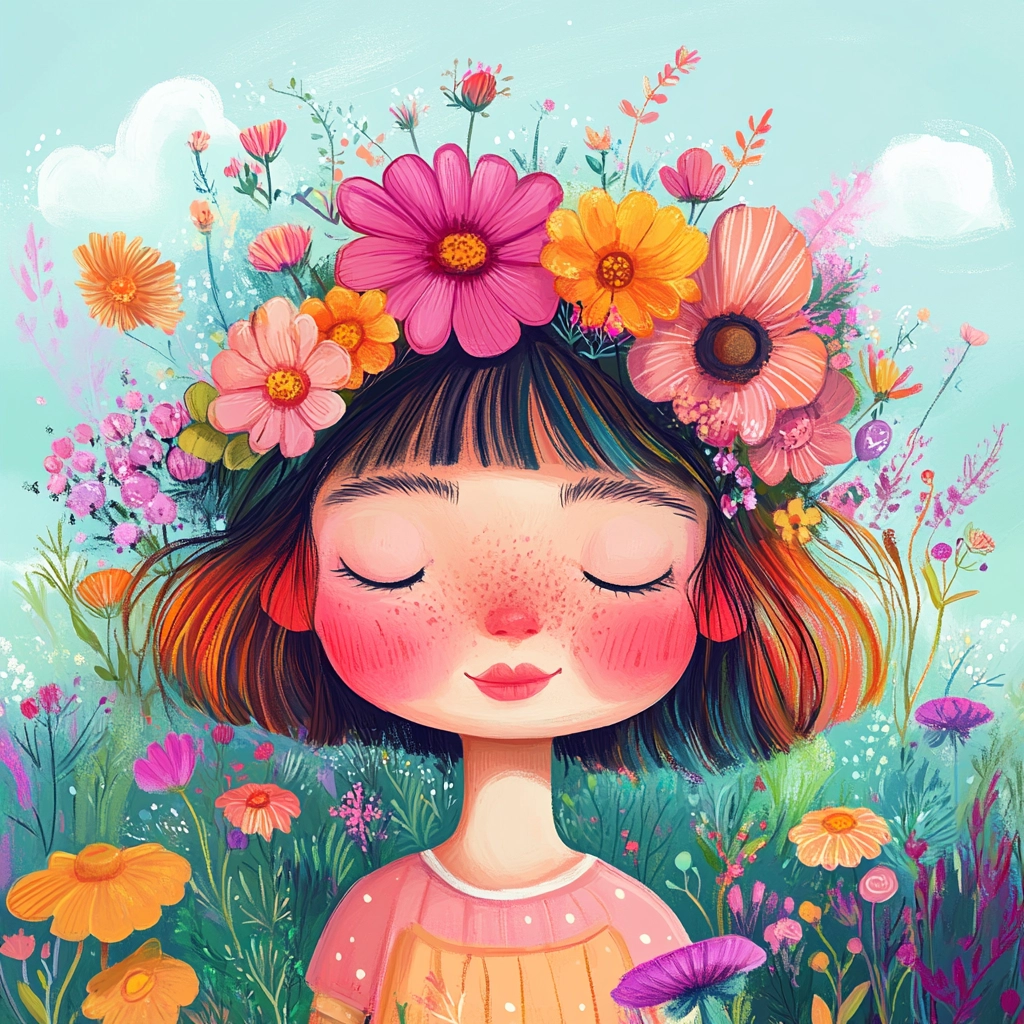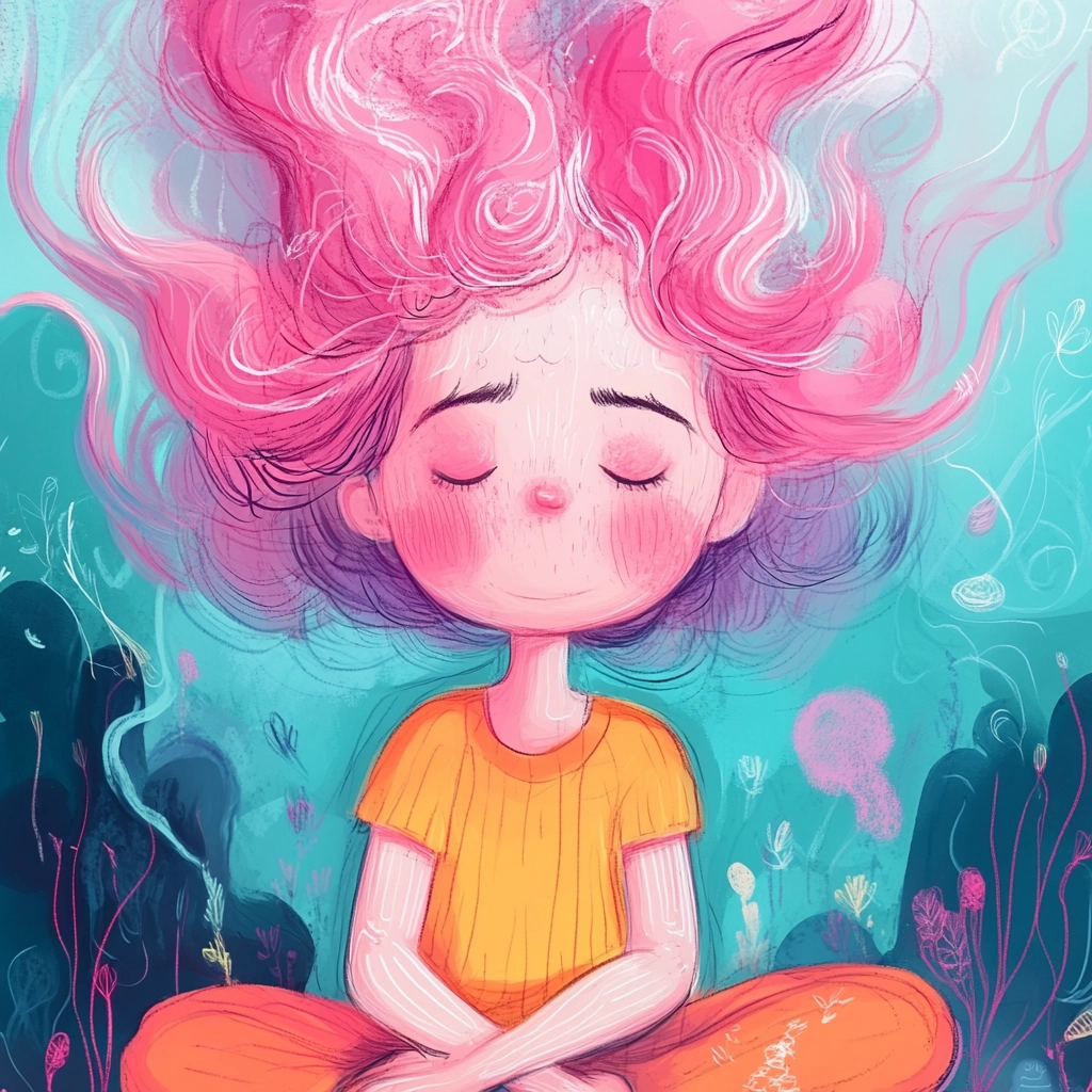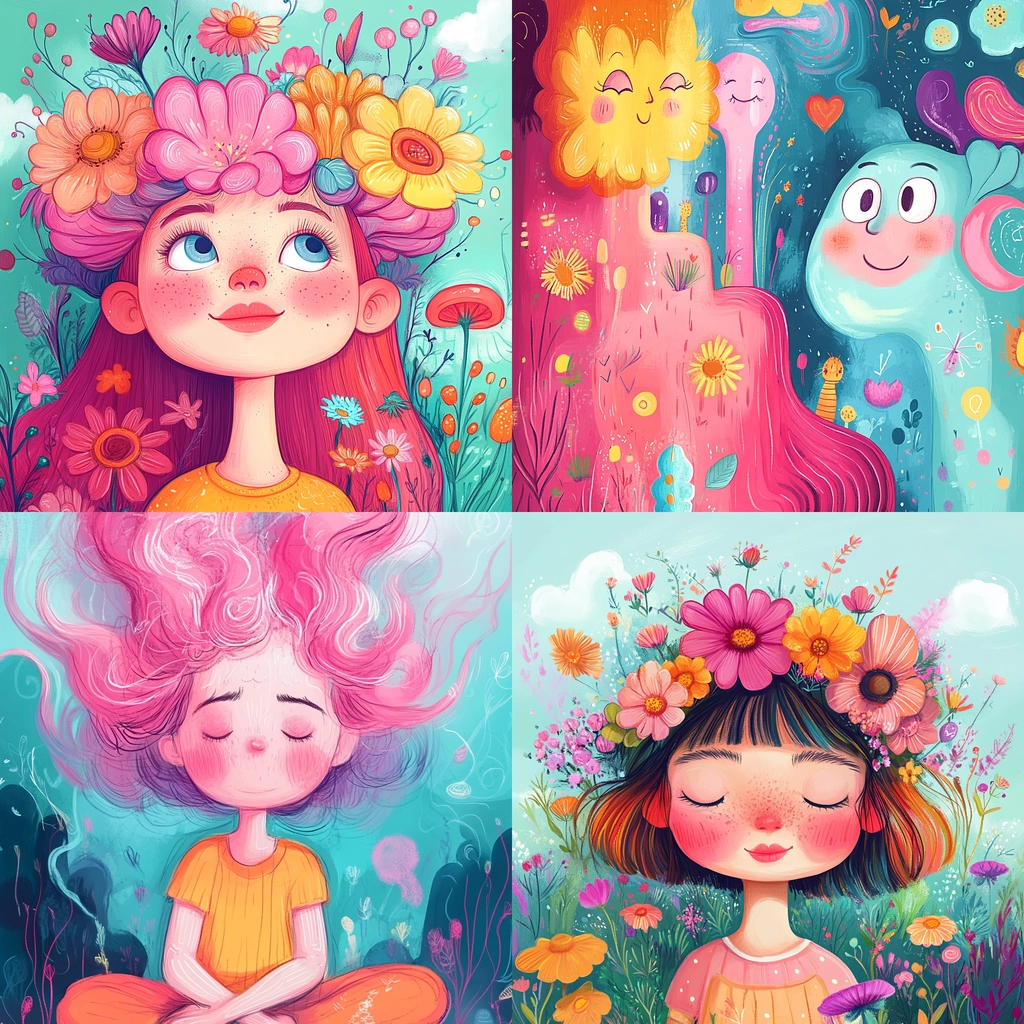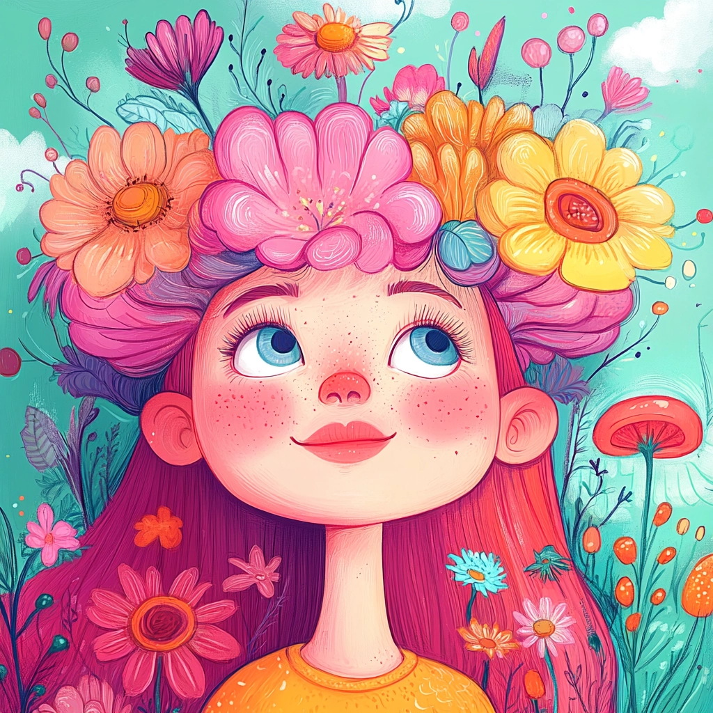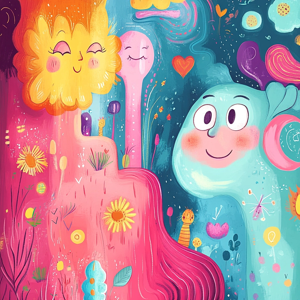The lighting is bright and enhances the rich colors, with a noticeable use of pinks and blues that create a lively yet harmonious ambiance. The textures are soft but rich, inviting a sense of visual warmth and tactile curiosity.