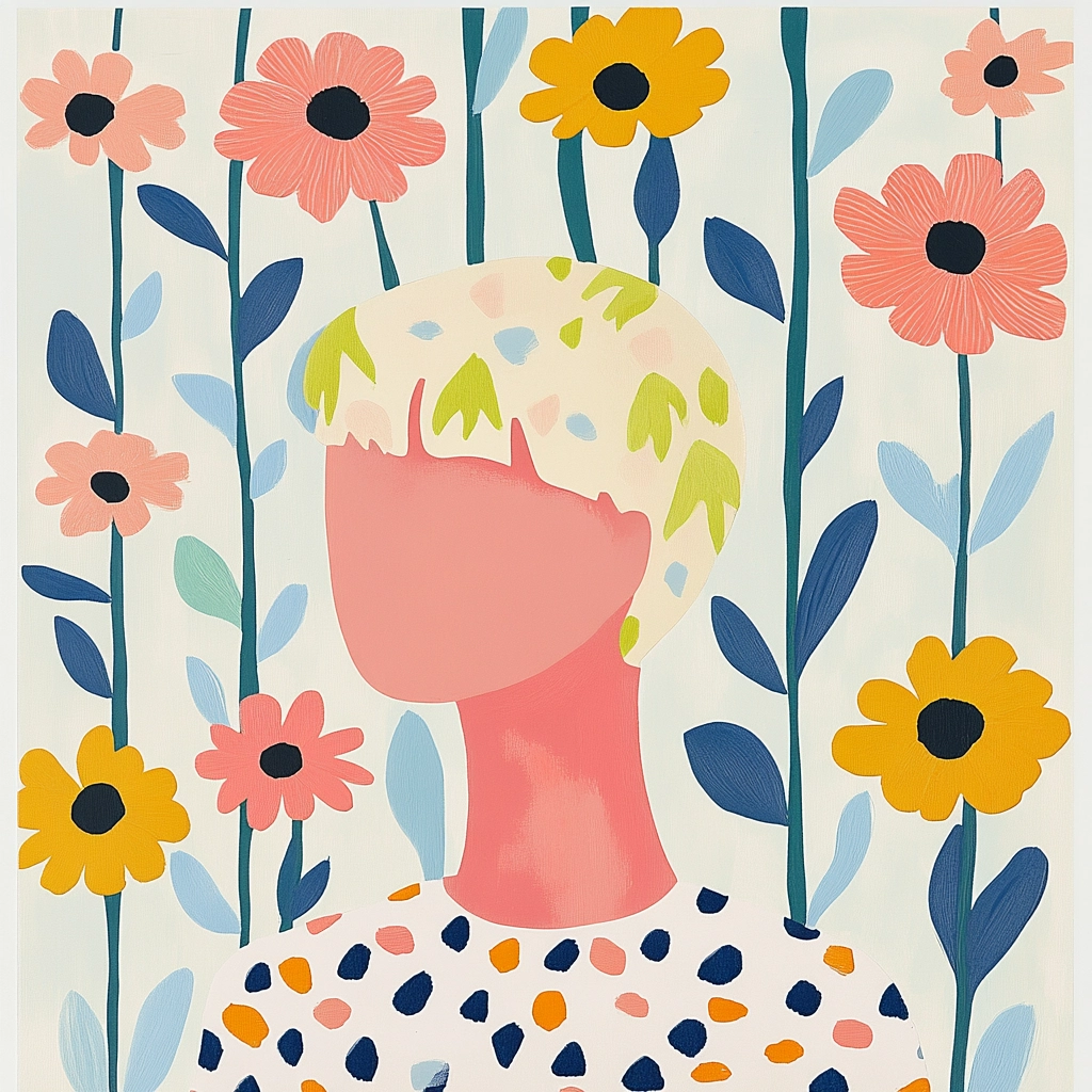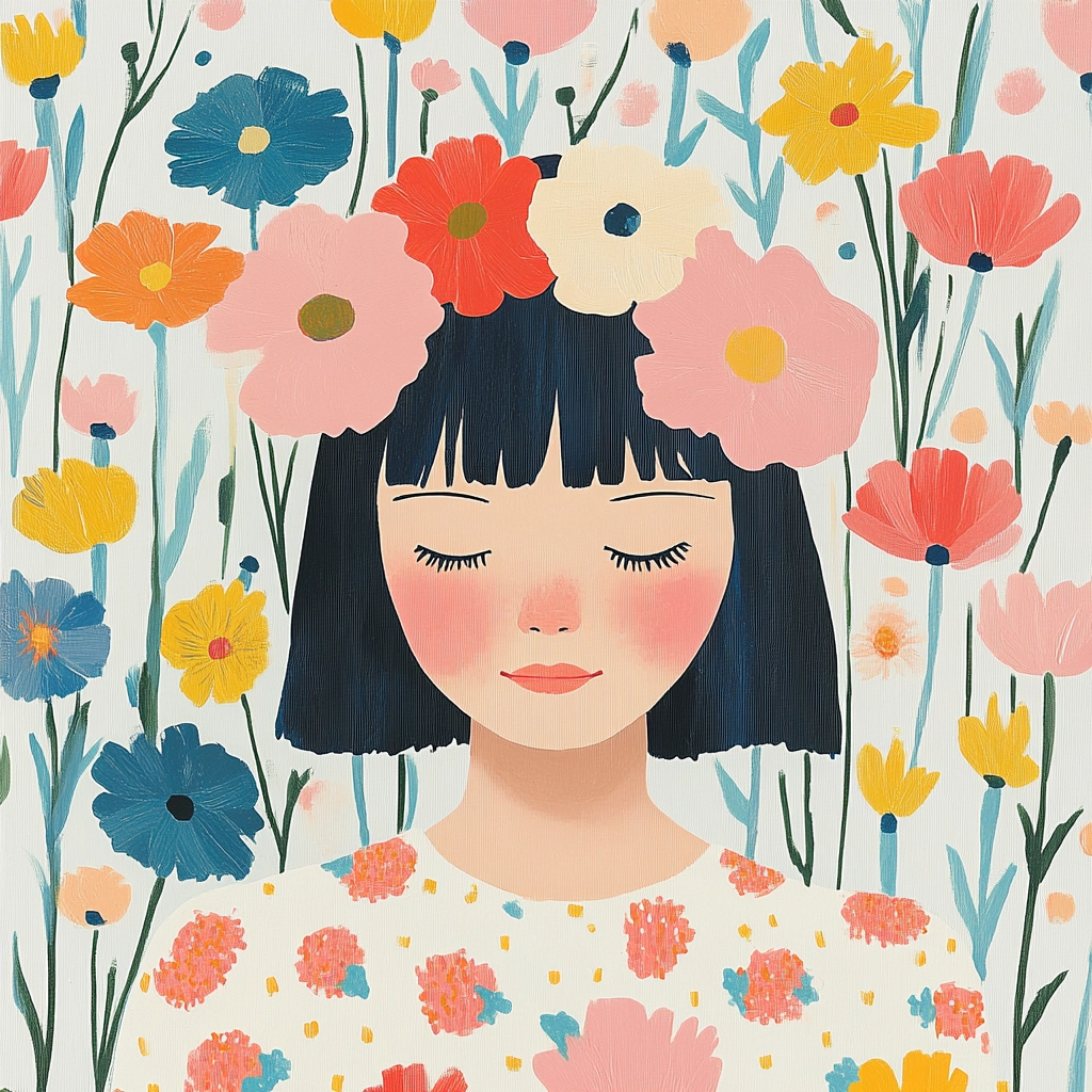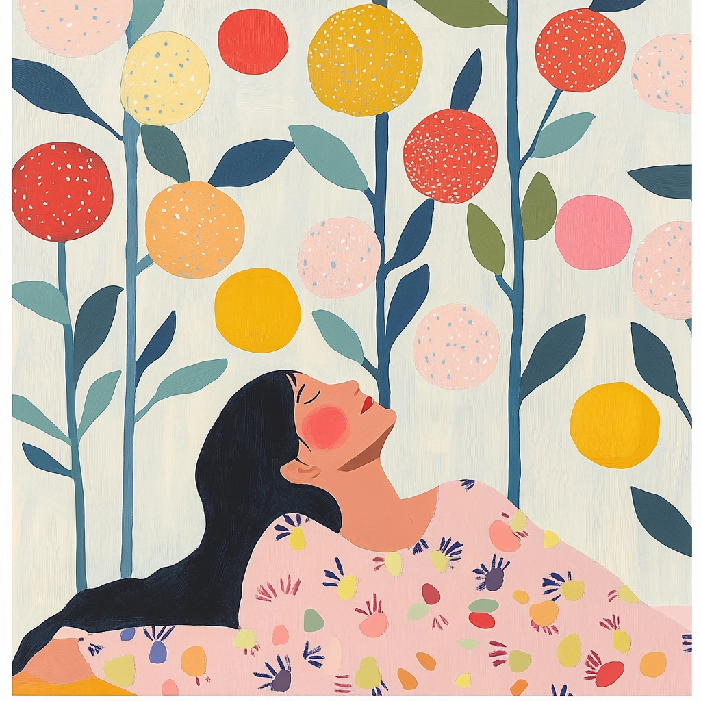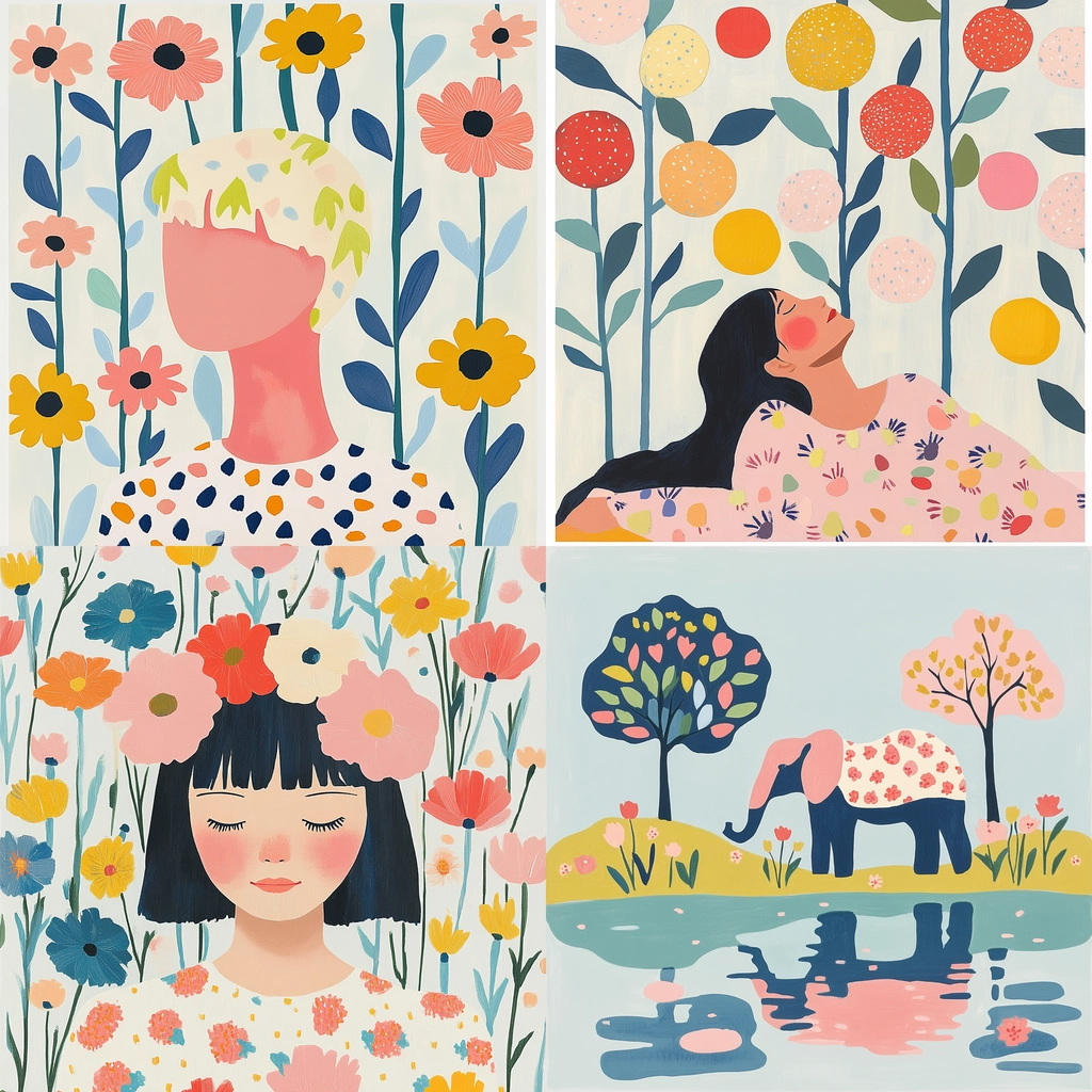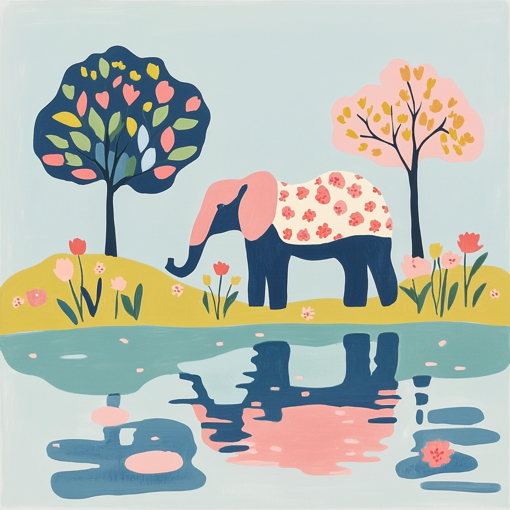 The lighting is soft and even, creating a gentle and inviting atmosphere. Colors are vibrant yet pastel, producing a playful visual effect. There is a flat spatial sense with minimal depth, emphasizing the surface texture and patterns.
