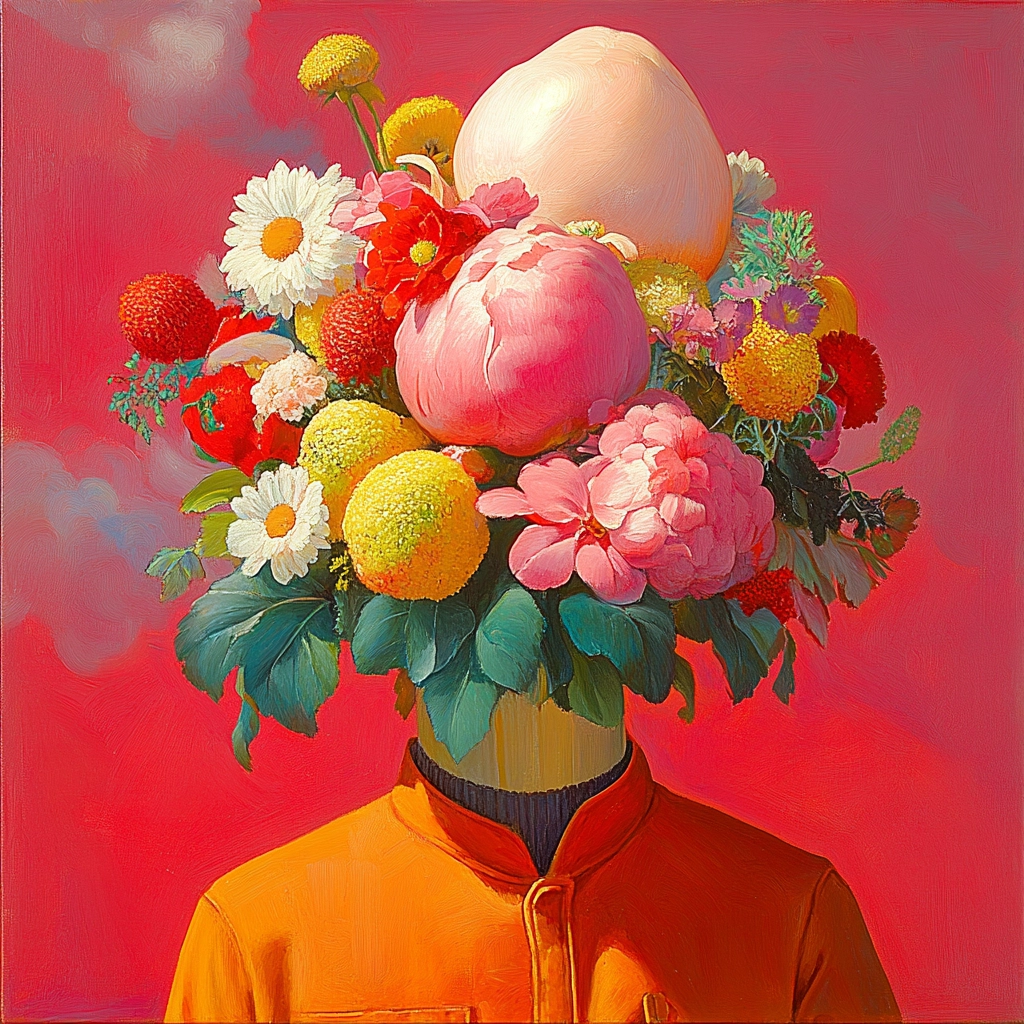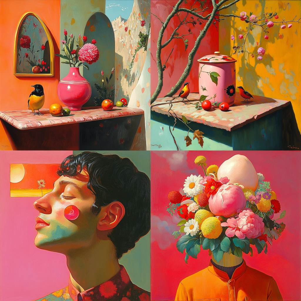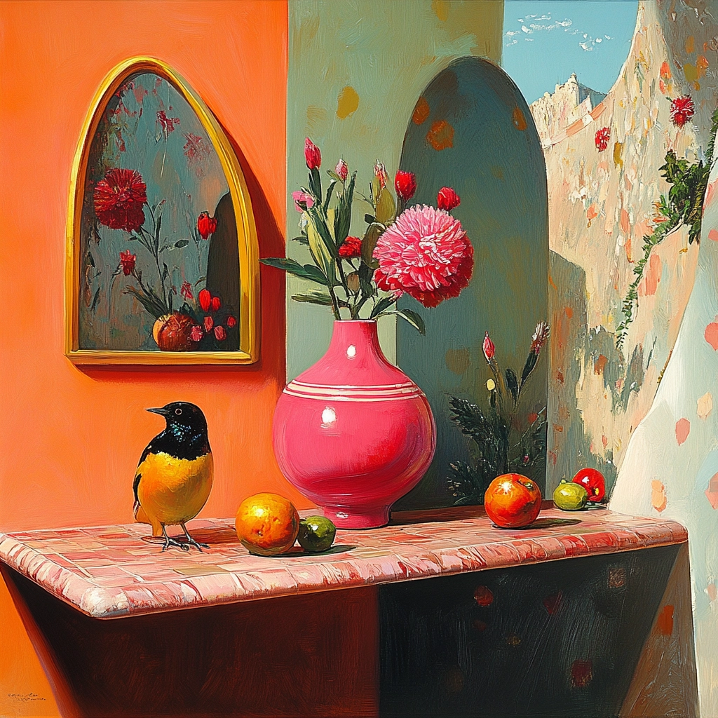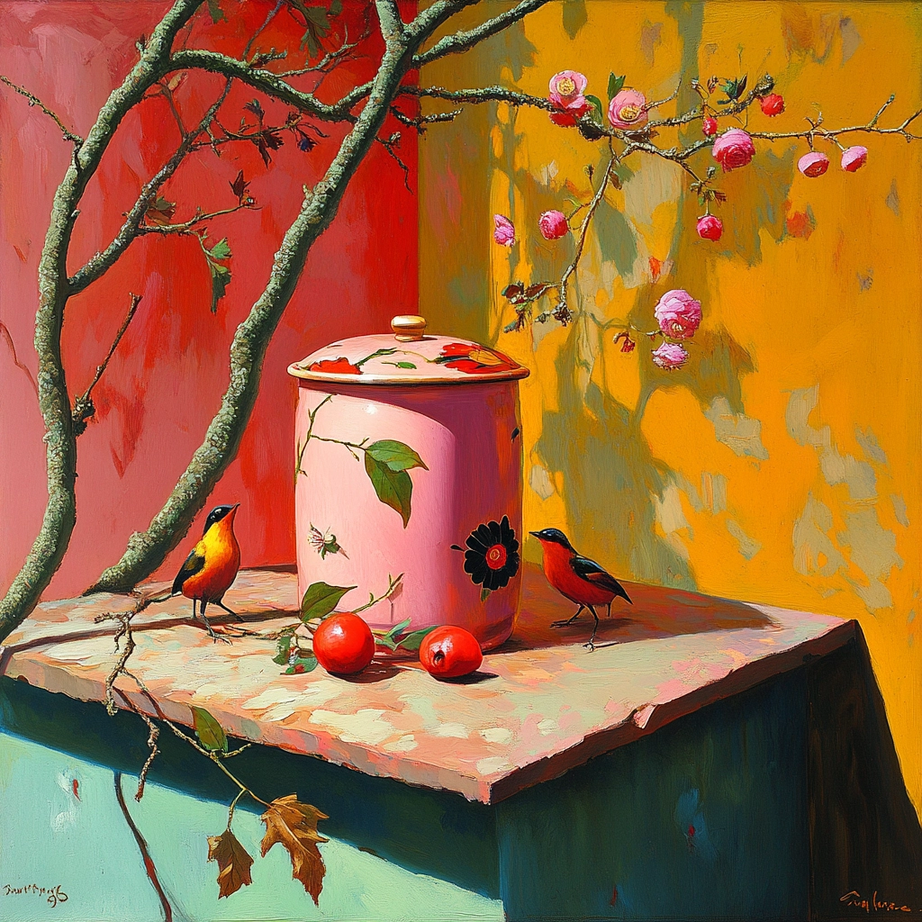 Bright lighting enhances the vivid color palette, creating a sense of depth and dimension. Texture is meticulously depicted, highlighting the smooth surfaces and intricate details. The spatial arrangement is carefully balanced, drawing the viewer's eye across the entire image.