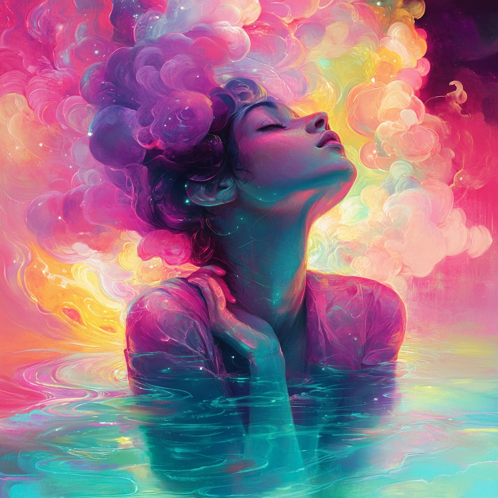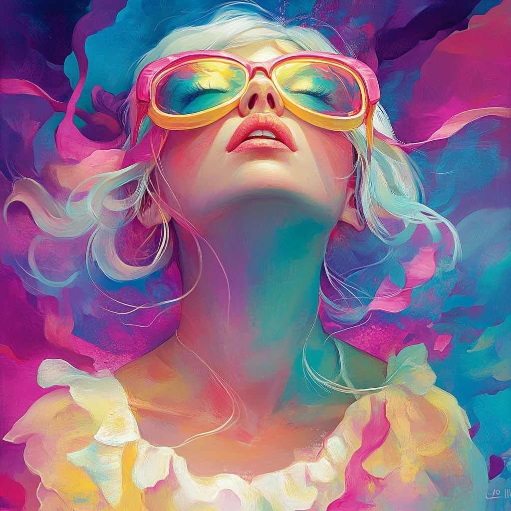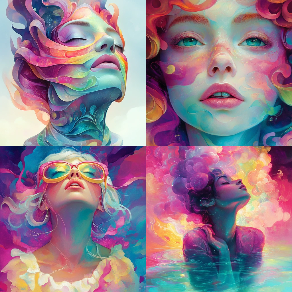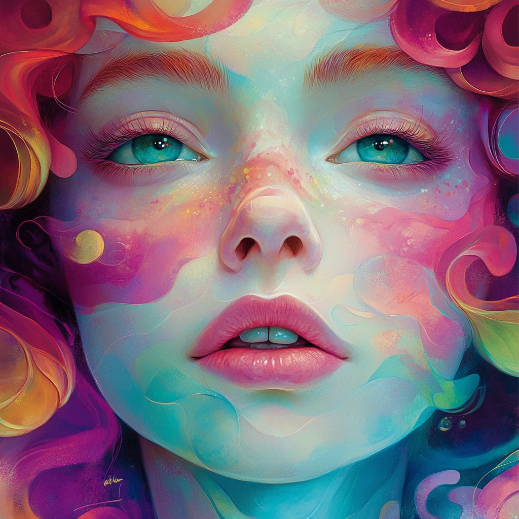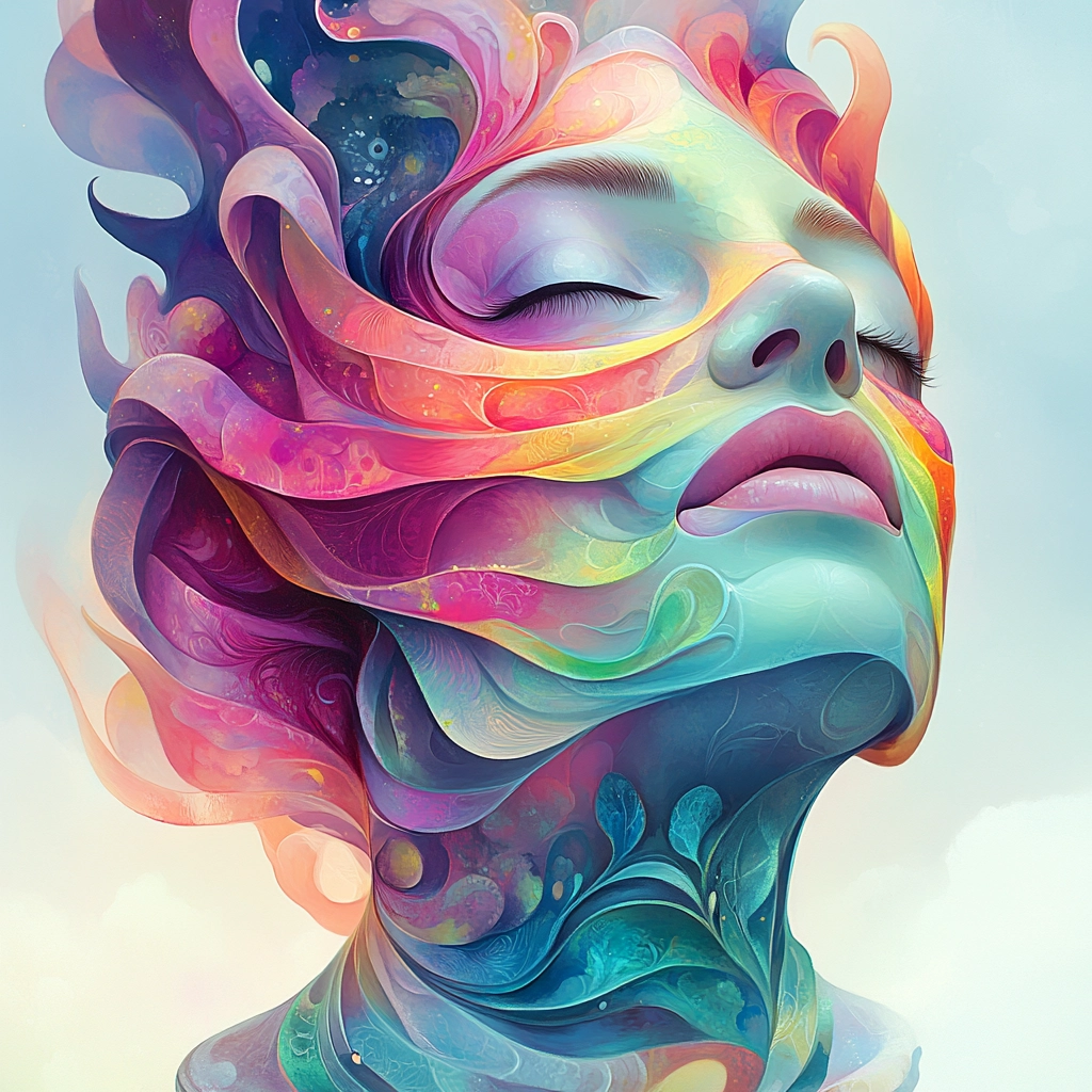 The combination of vibrant colors and fluid, swirling patterns creates a dynamic sense of motion. Light plays across surfaces with an iridescent quality, enhancing the impression of flow and movement.