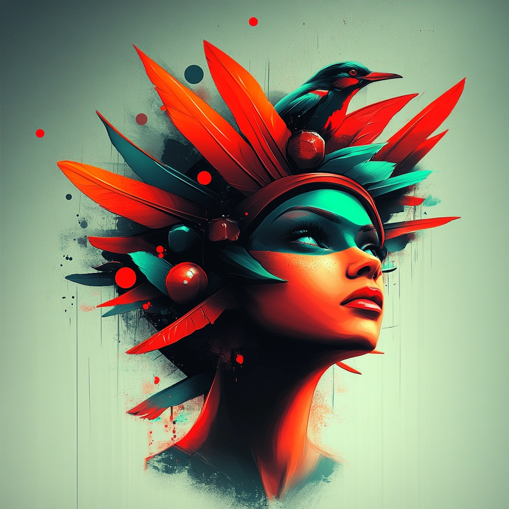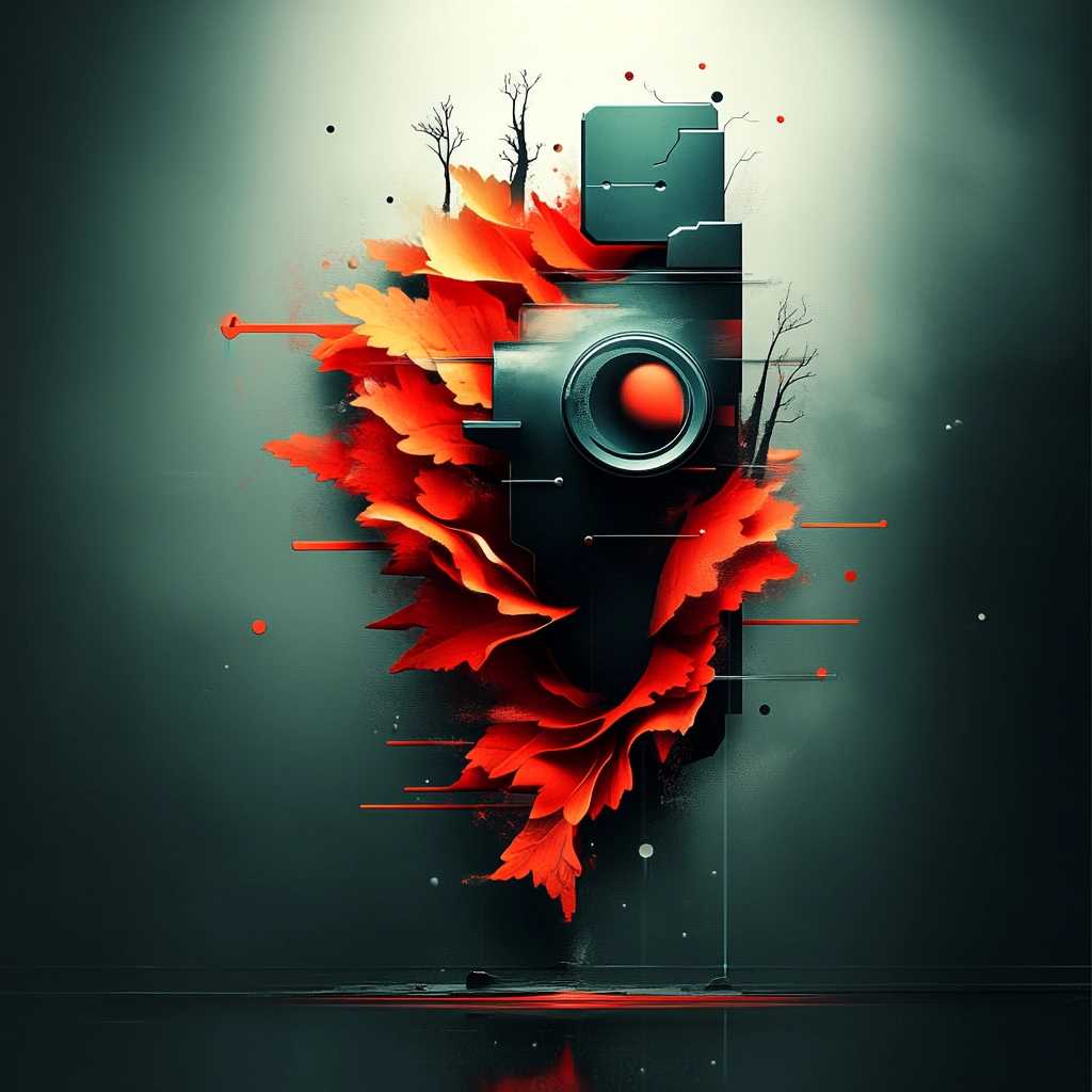 A vivid interplay of saturated reds and muted tones creates dynamic forms.