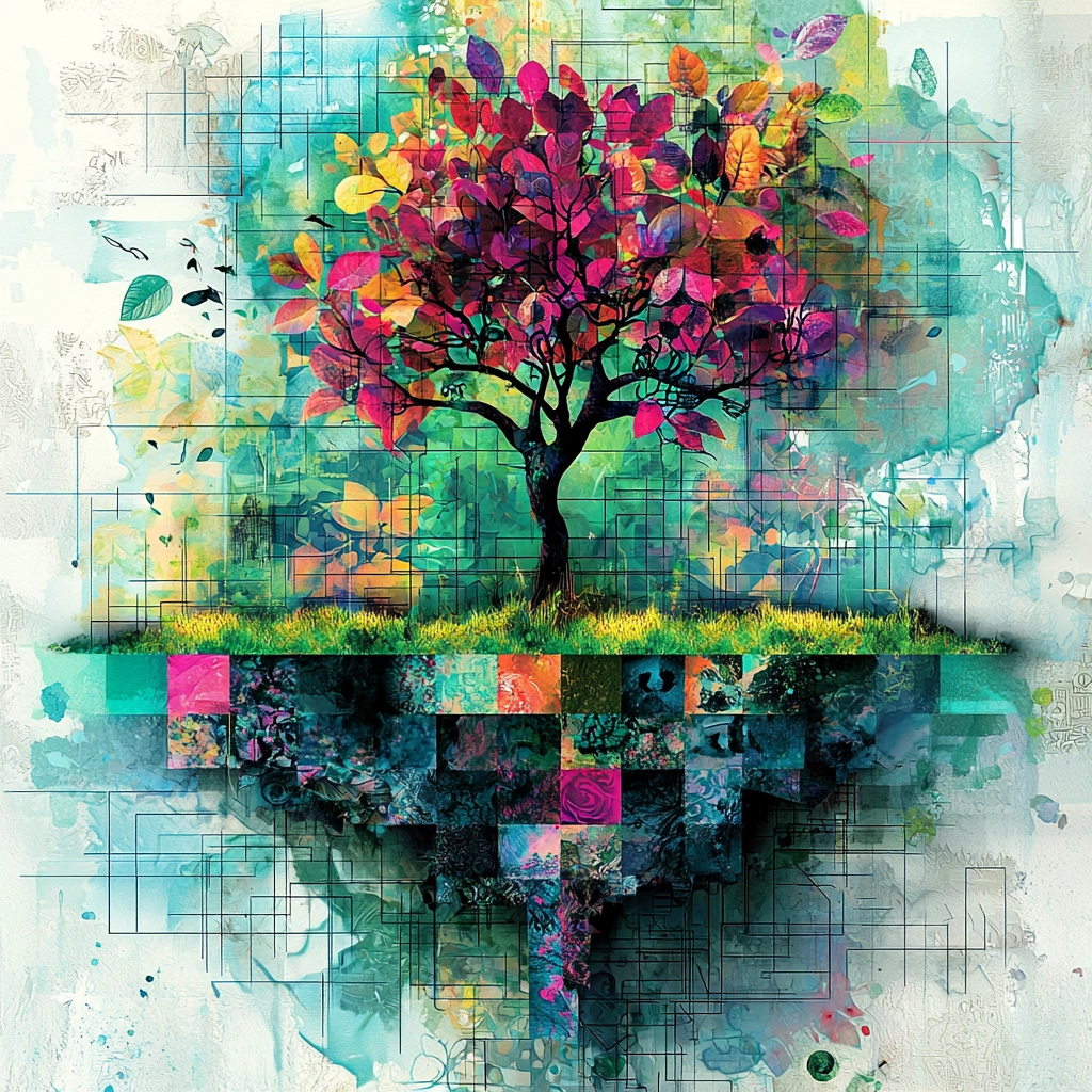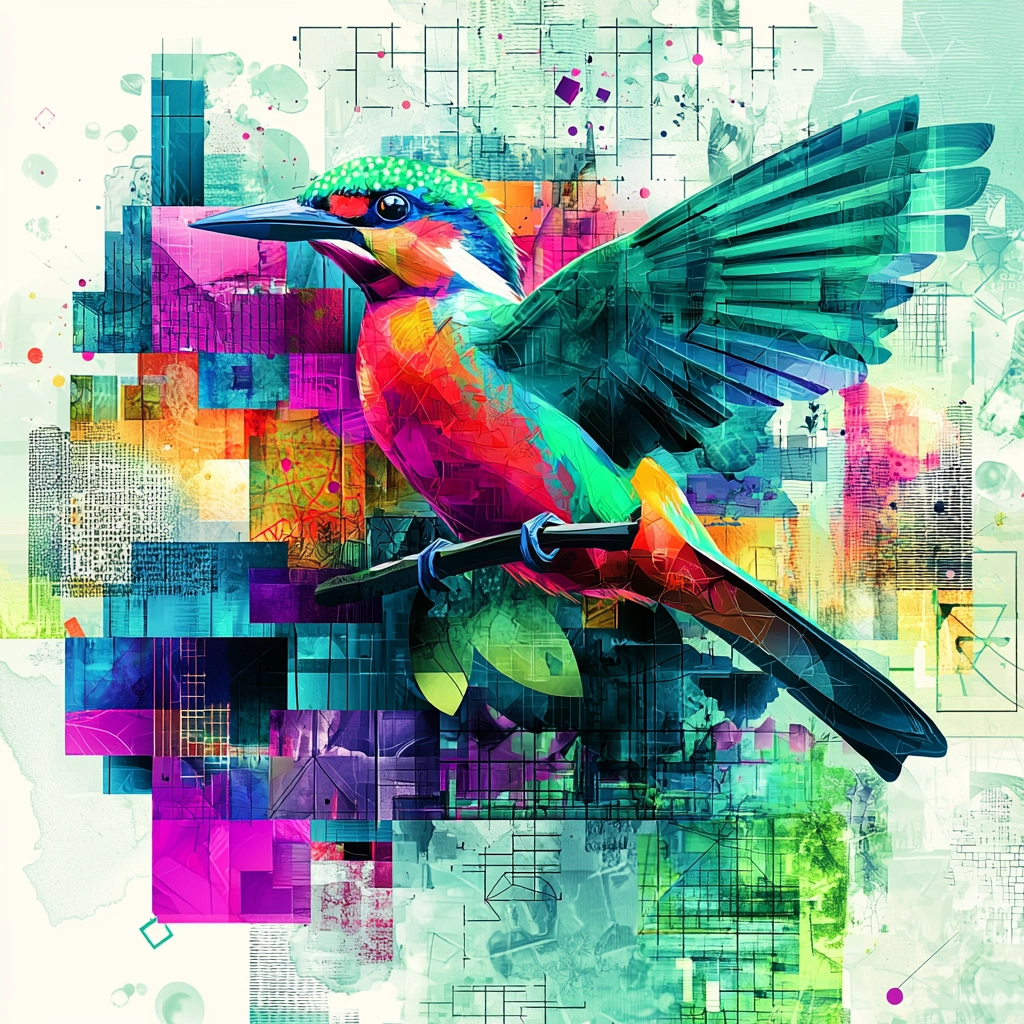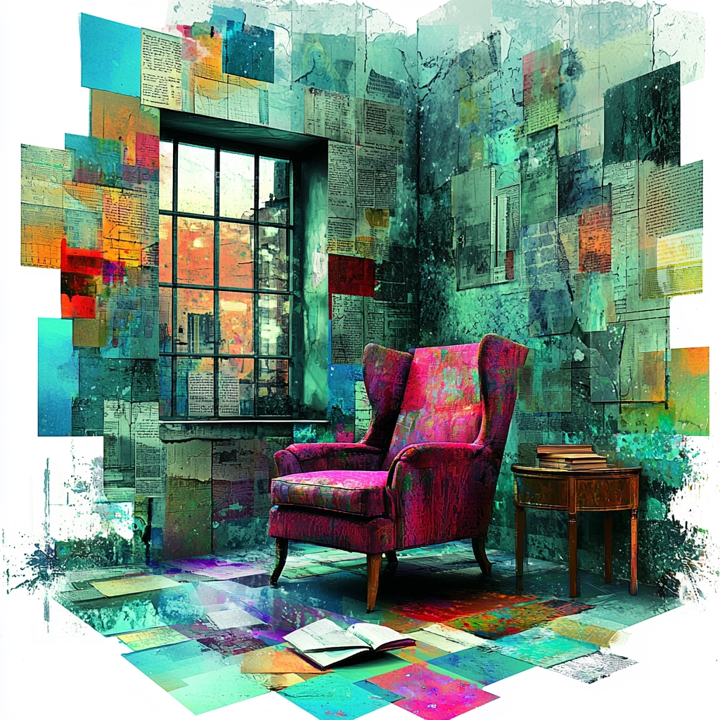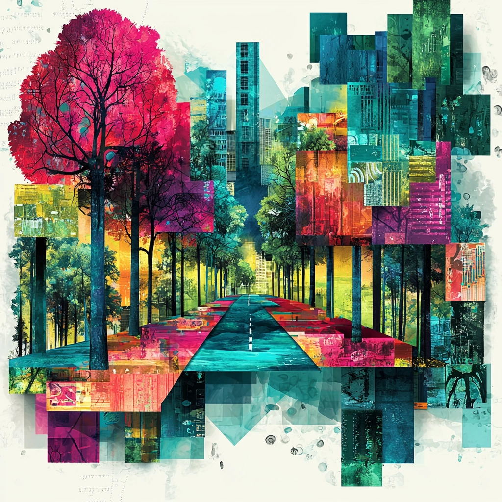 Bright lighting enhances bold colors that burst against structured layouts, creating clear depth. Vivid hues emphasize a dynamic, energetic spatial presence while multiple textures layer seamlessly, blurring the distinctions between elements.
