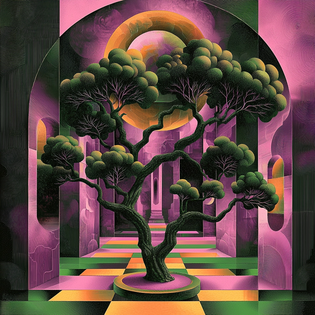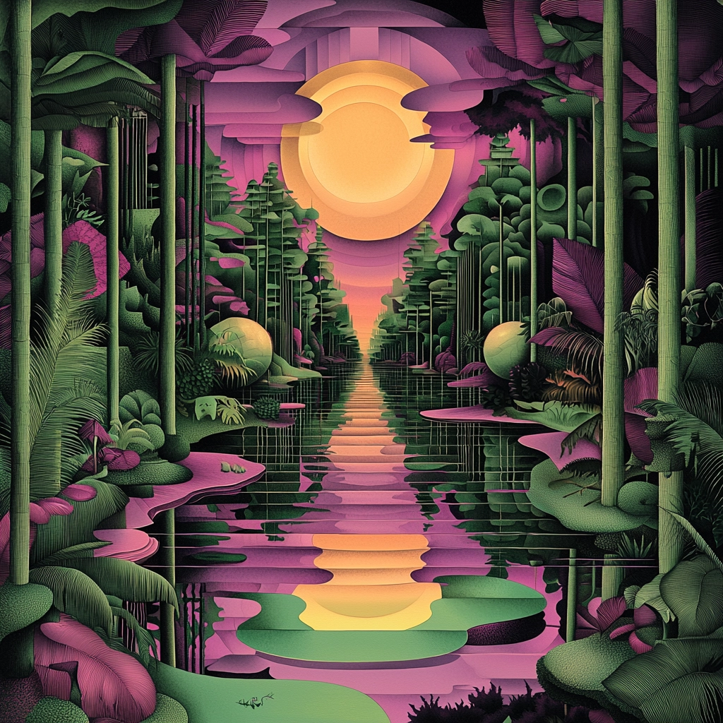 Lighting enhances depth and dimension, combining bright hues with intricate patterns. Color gradations transition smoothly, and the interplay between light and shadow adds a three-dimensional feel. Textures range from smooth to detailed, emphasizing different spatial elements.