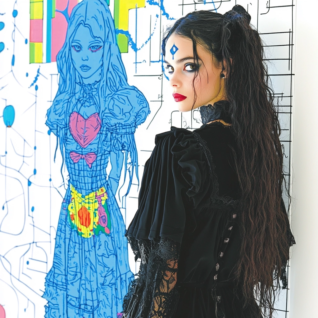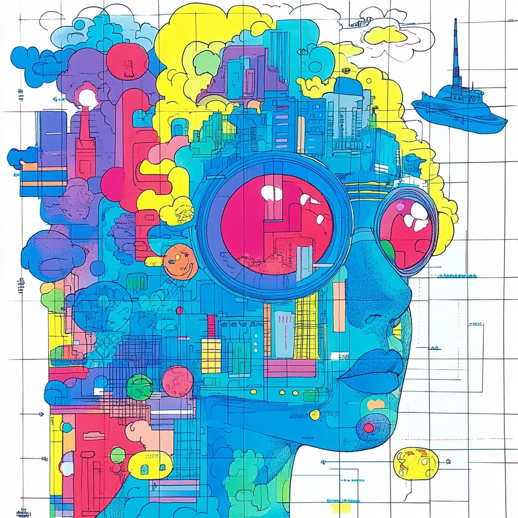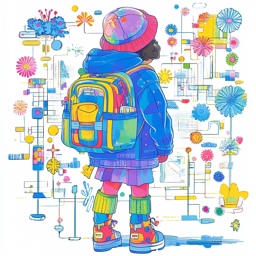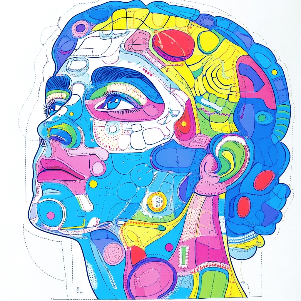 The lighting is consistent and bright, accentuating vivid primary and secondary colors defined by clean, precise lines. The spatial layout utilizes a two-dimensional plane with layered textures creating depth, and detailed patterning expresses complexity through structured visual elements.