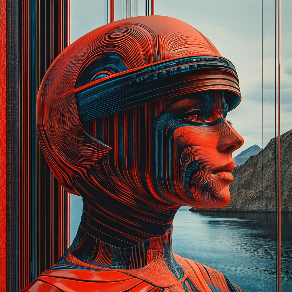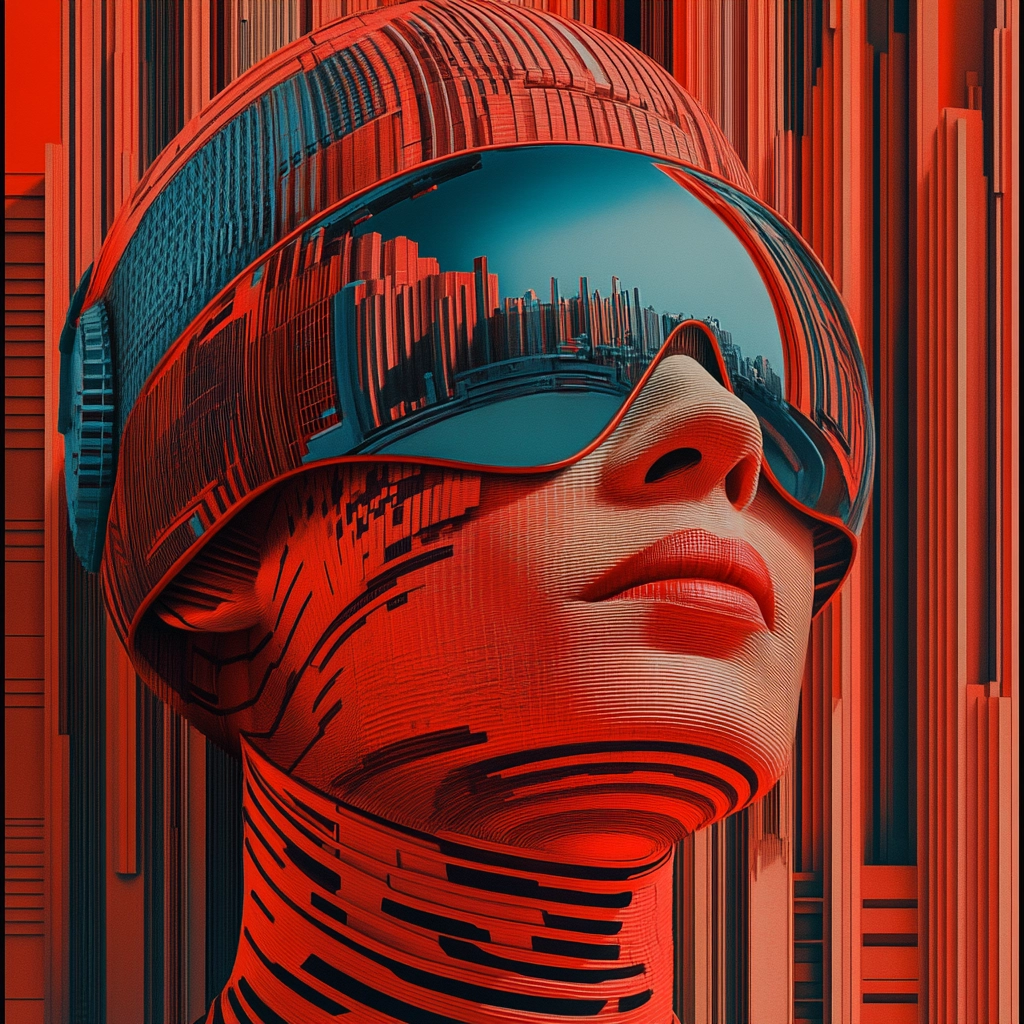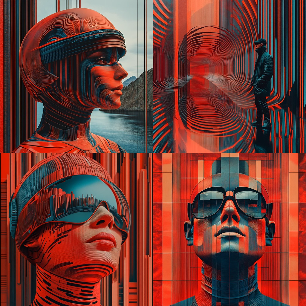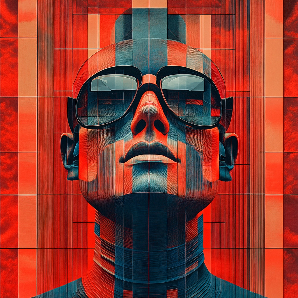 The use of vibrant red with contrasting black and blue forms intricate geometrical patterns. The spatial depth is enhanced by strong lines and textures with a vivid and energetic presence.