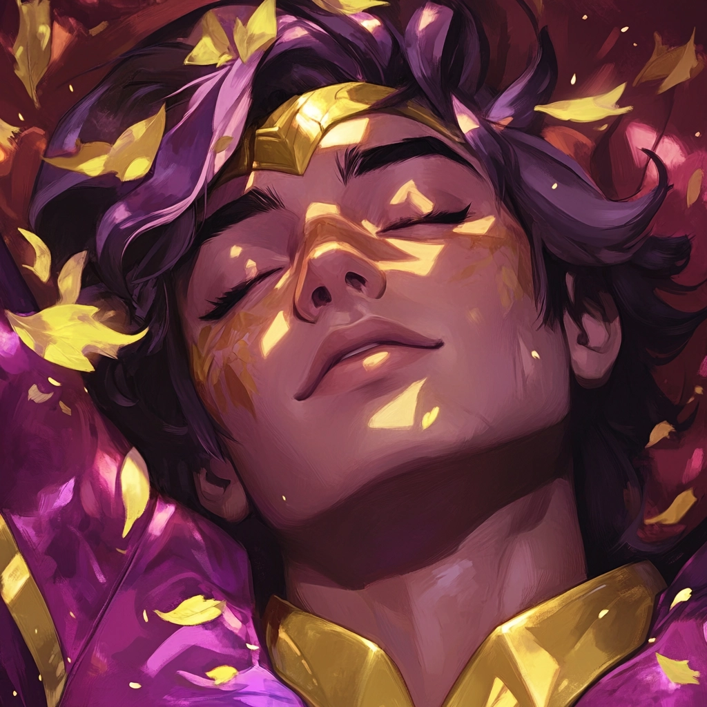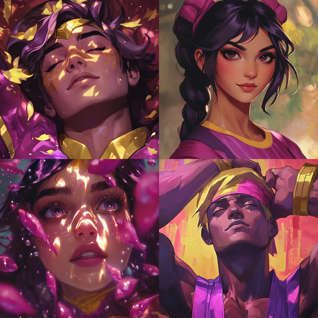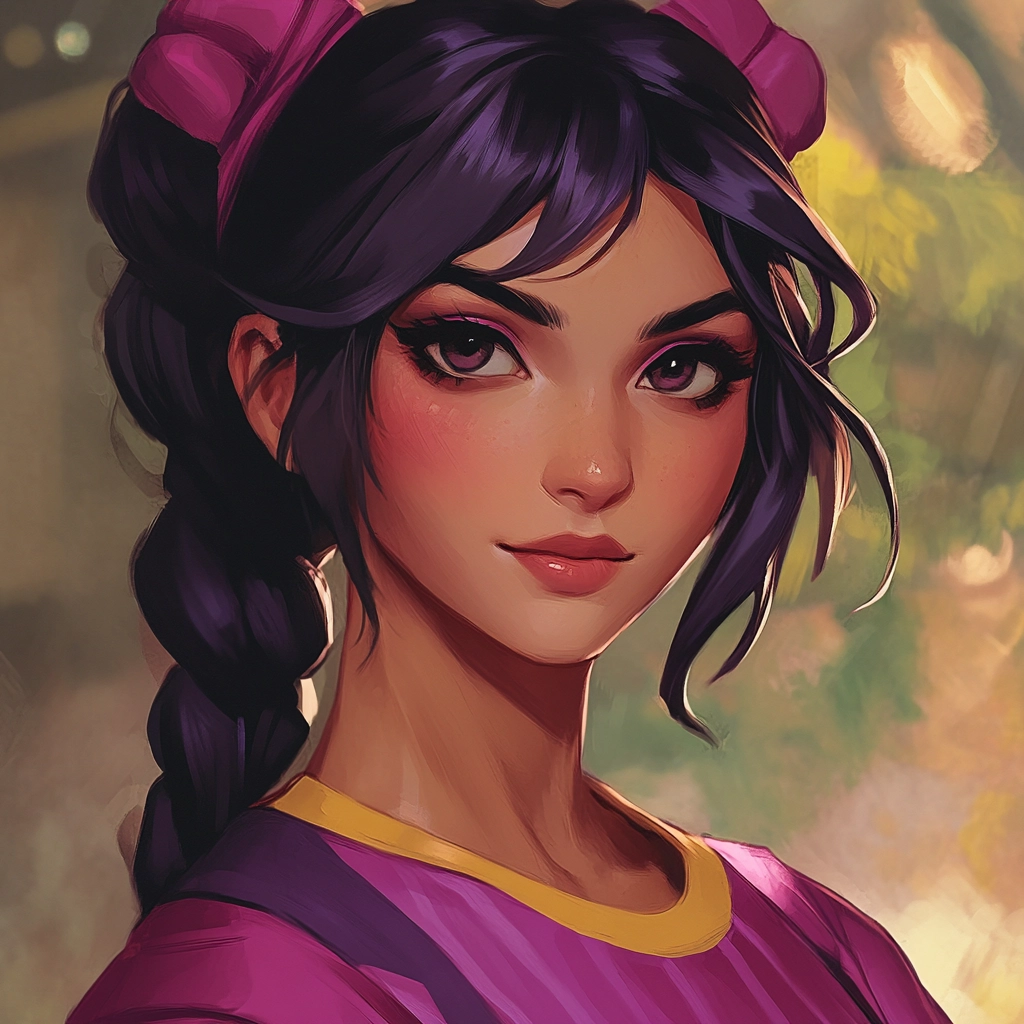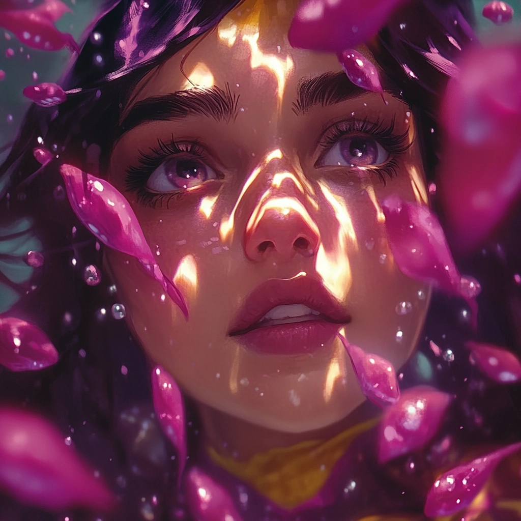 The lighting creates a sense of depth and enhances the vibrant color palette. The textures are meticulously rendered, giving a rich visual feel. Spatially, the elements are well-balanced, providing a dynamic composition.