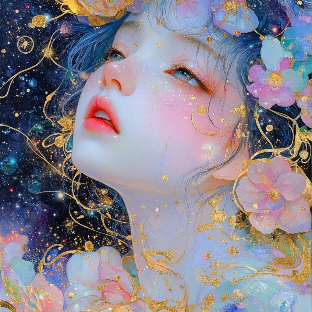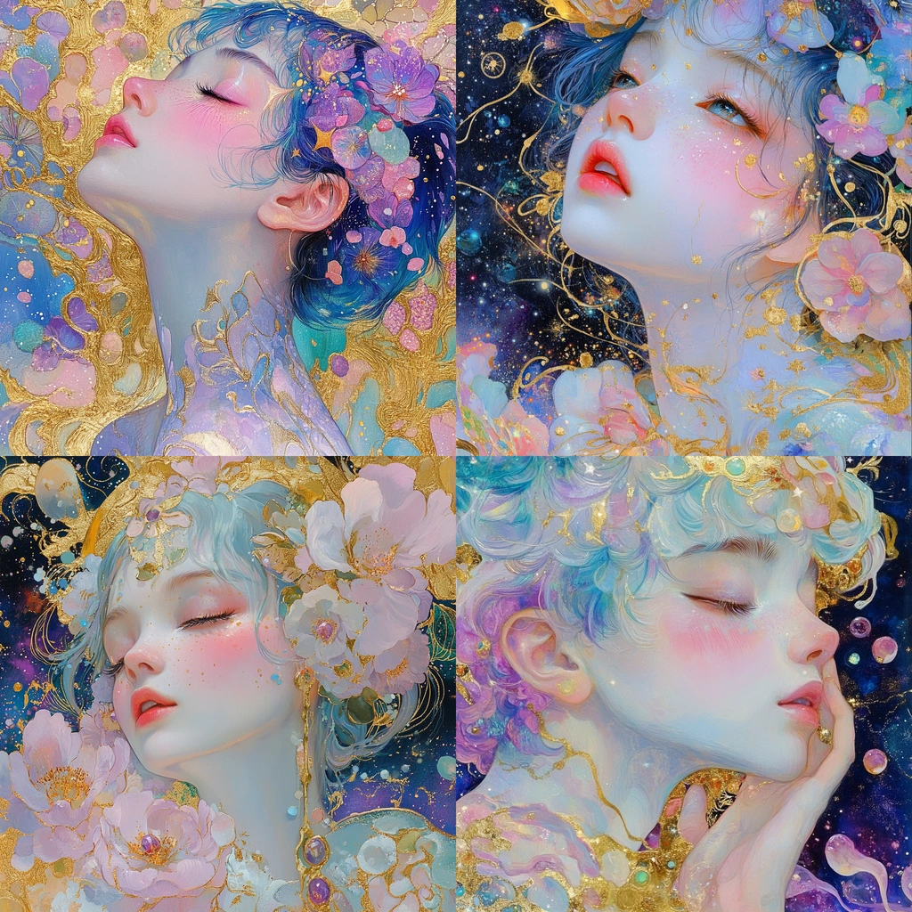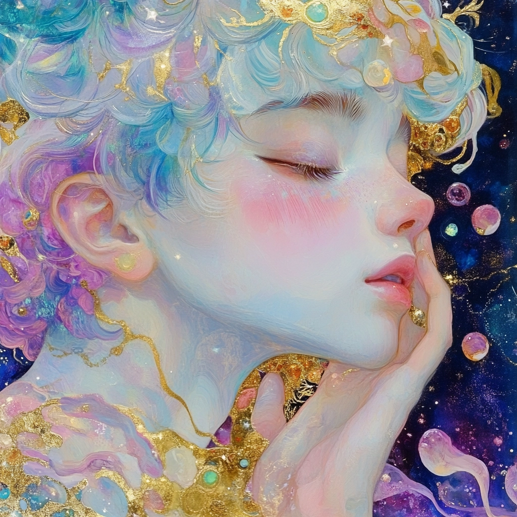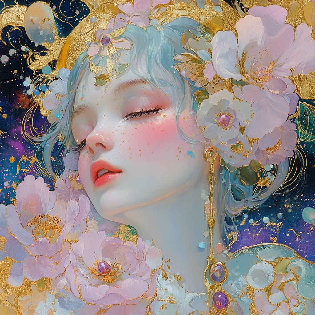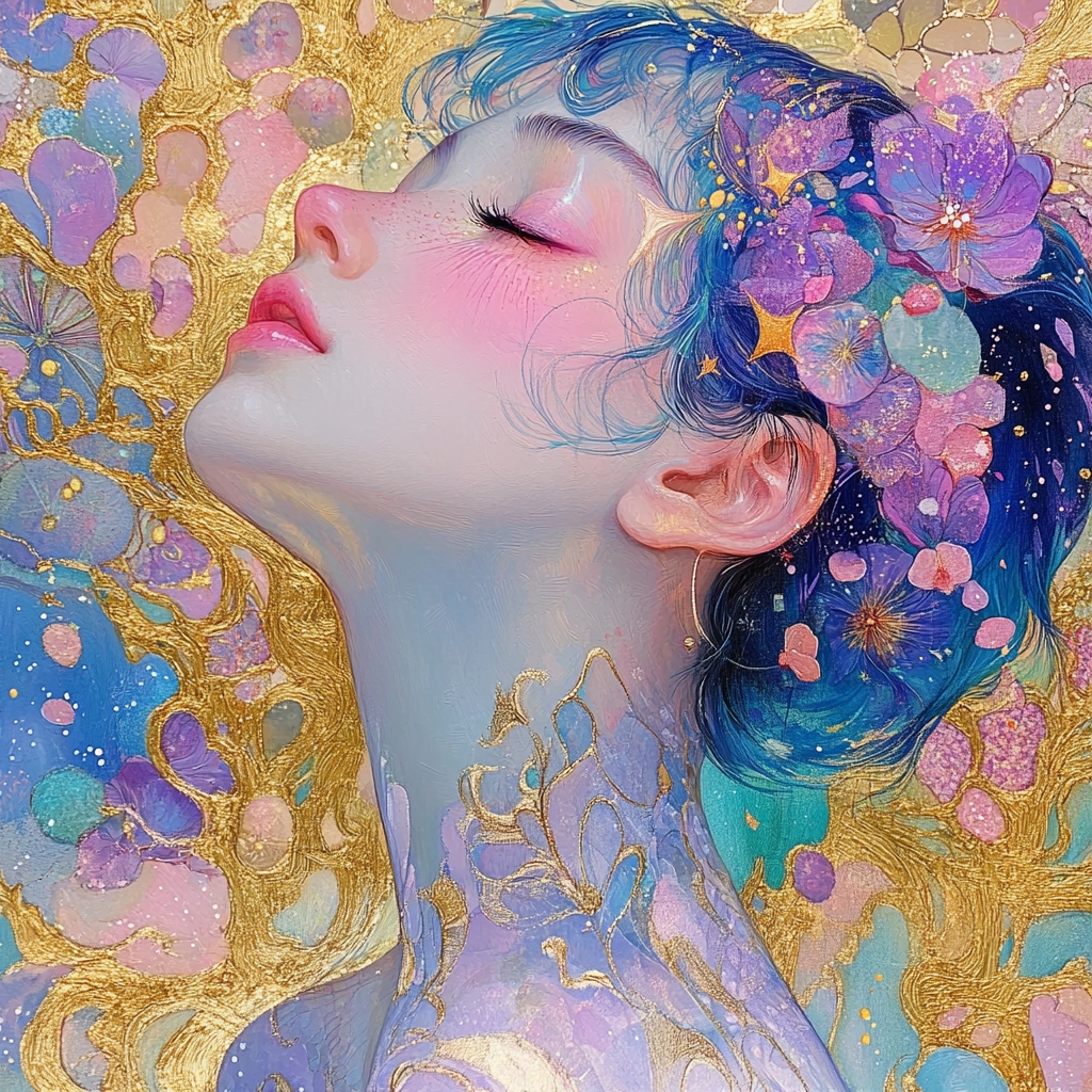 The lighting emphasizes a lustrous quality with shimmering gold against cool purples and blues. Textures are rich, with layered brushwork providing a tactile and opulent sense of depth.