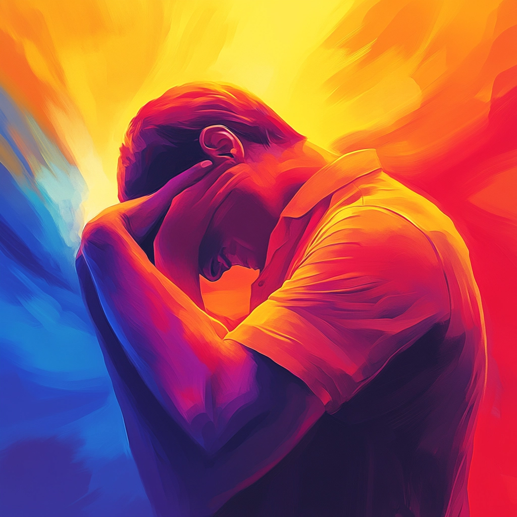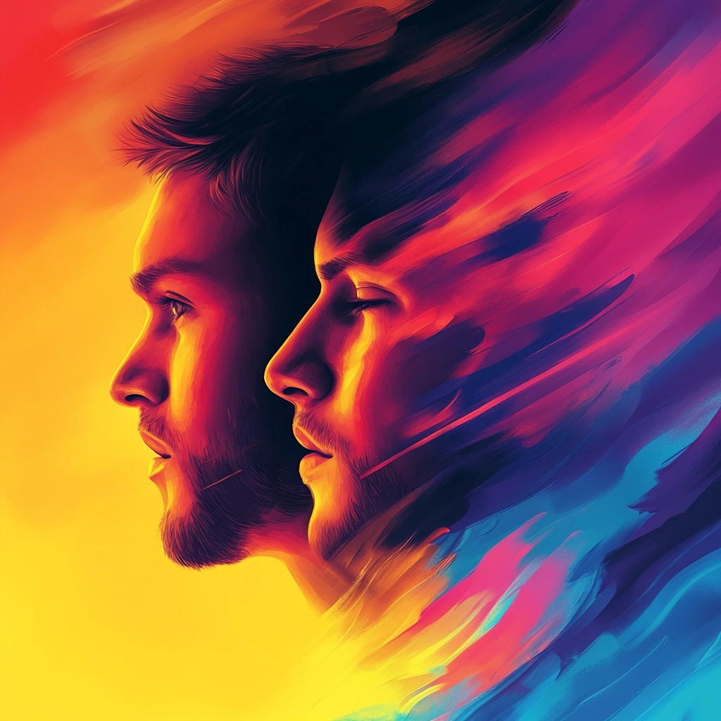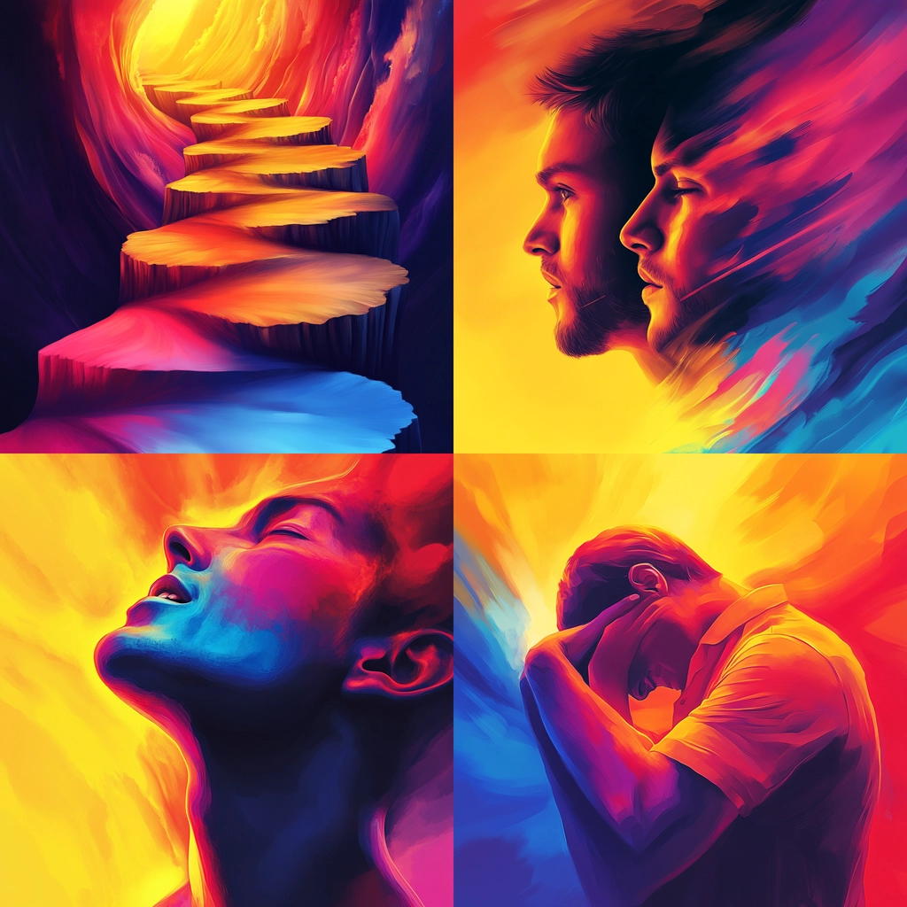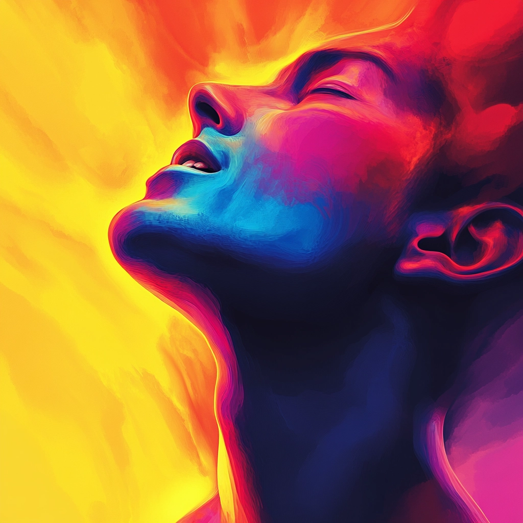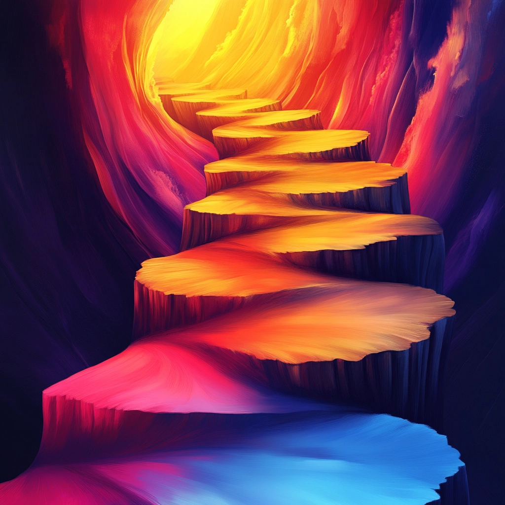 Utilizes sharp contrast lighting creating a stark differentiation between vivid colors and shadowed tones. The brushwork echoes dynamic movement, enhancing spatial delineation through bold texture expression, focusing on undefinable shapes and vibrant gradients.