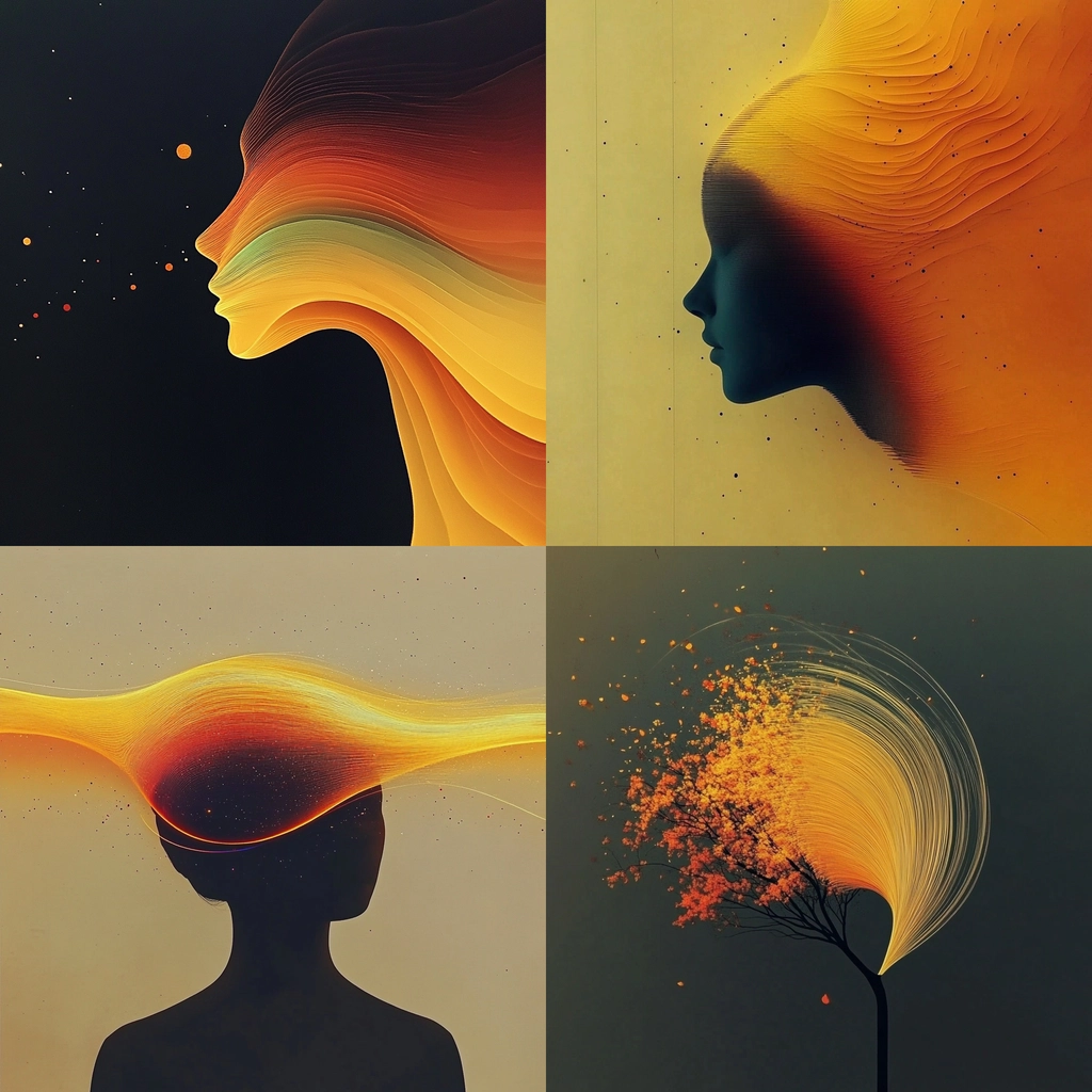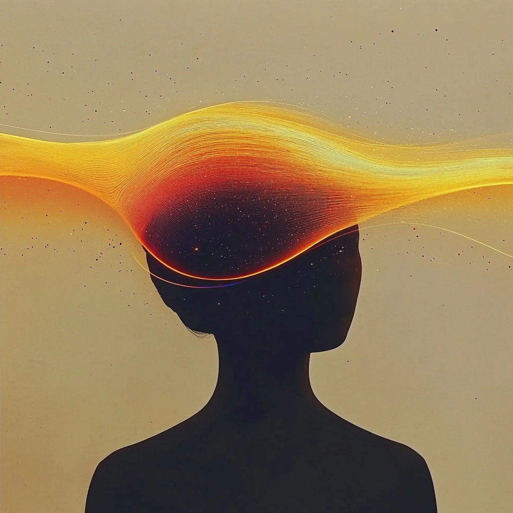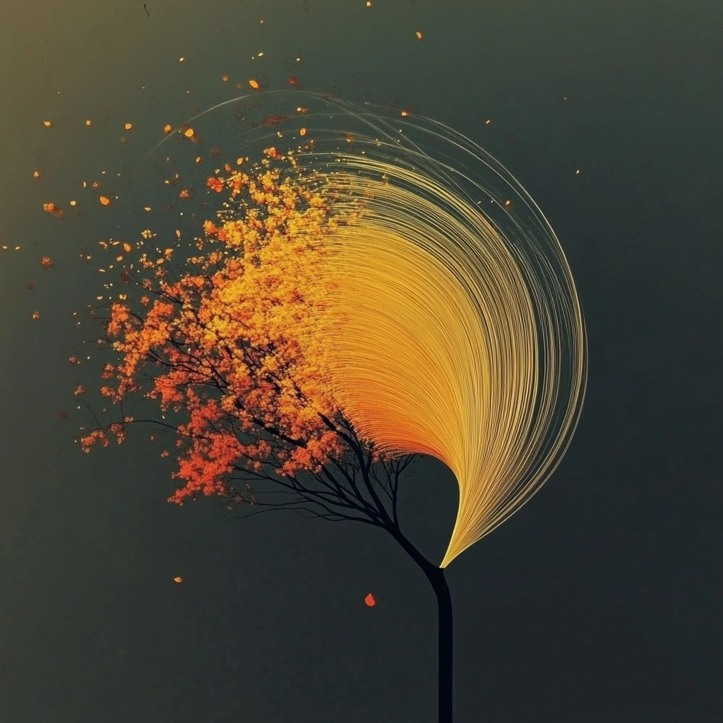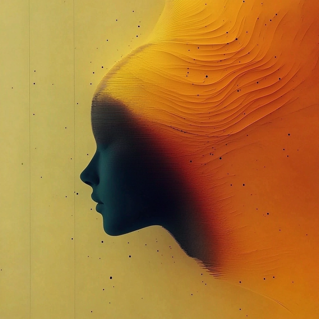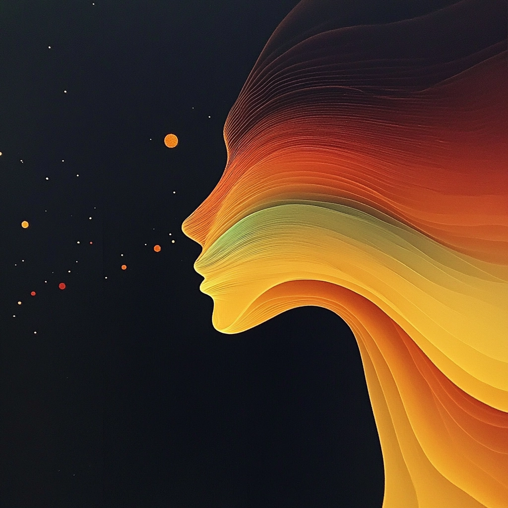 The lighting creates a strong contrast between highlights and shadows while smooth gradients express movement. The spatial depth is accentuated by flowing textures, creating a sense of continuous motion with sharp color transitions.