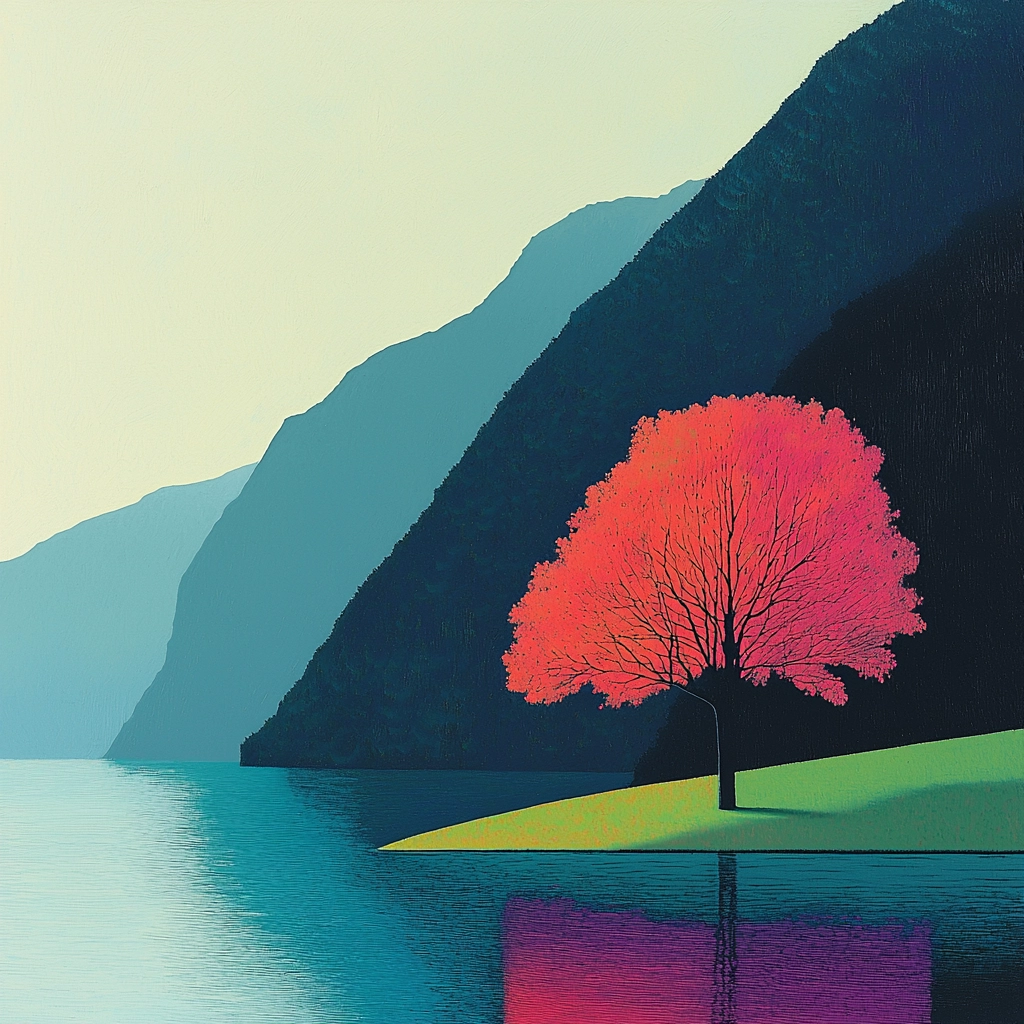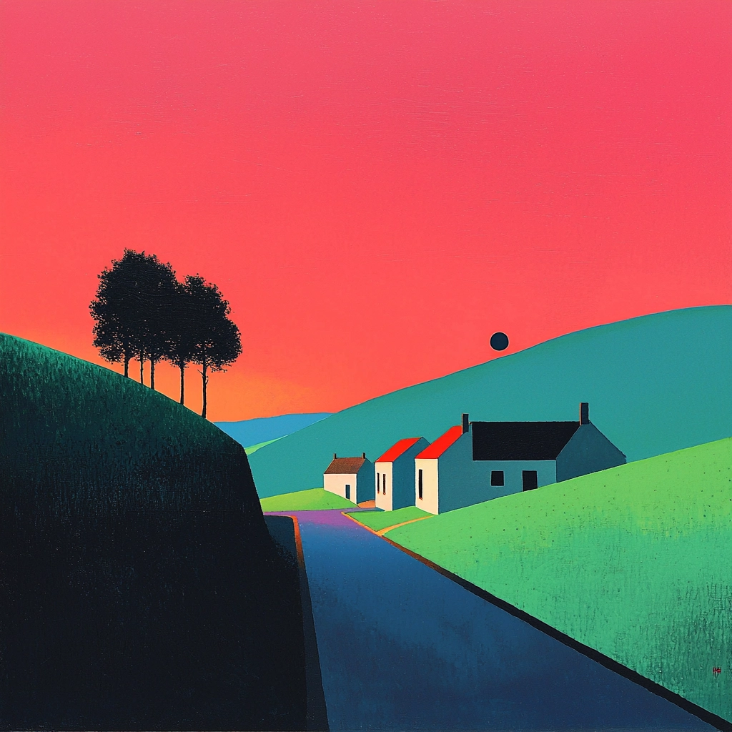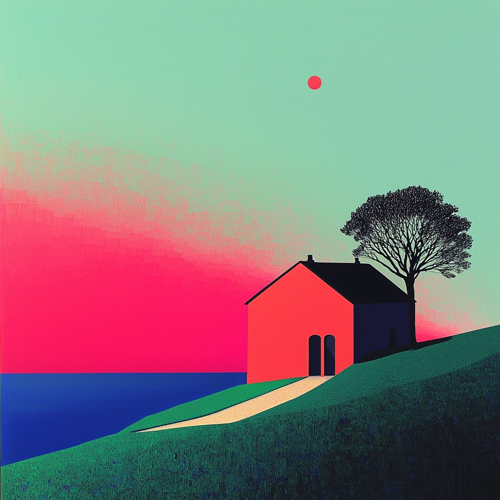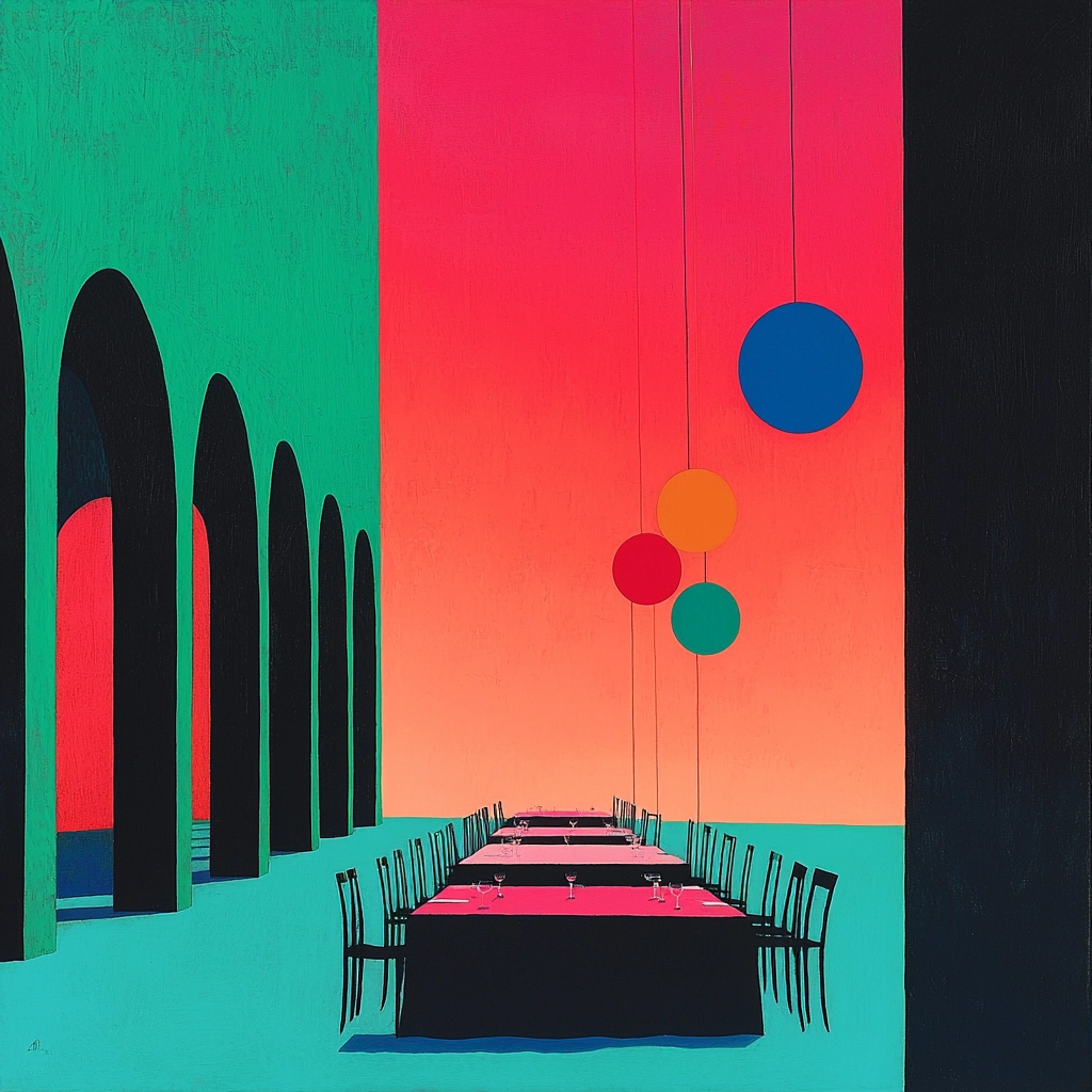 The artwork features strong color contrasts with vivid gradients transitioning smoothly between hues, imparting a dynamic yet structured spatial arrangement. Lighting is used to enhance bold outlines and sharp edges, while textures remain predominantly flat, allowing colors to speak for the imagery.