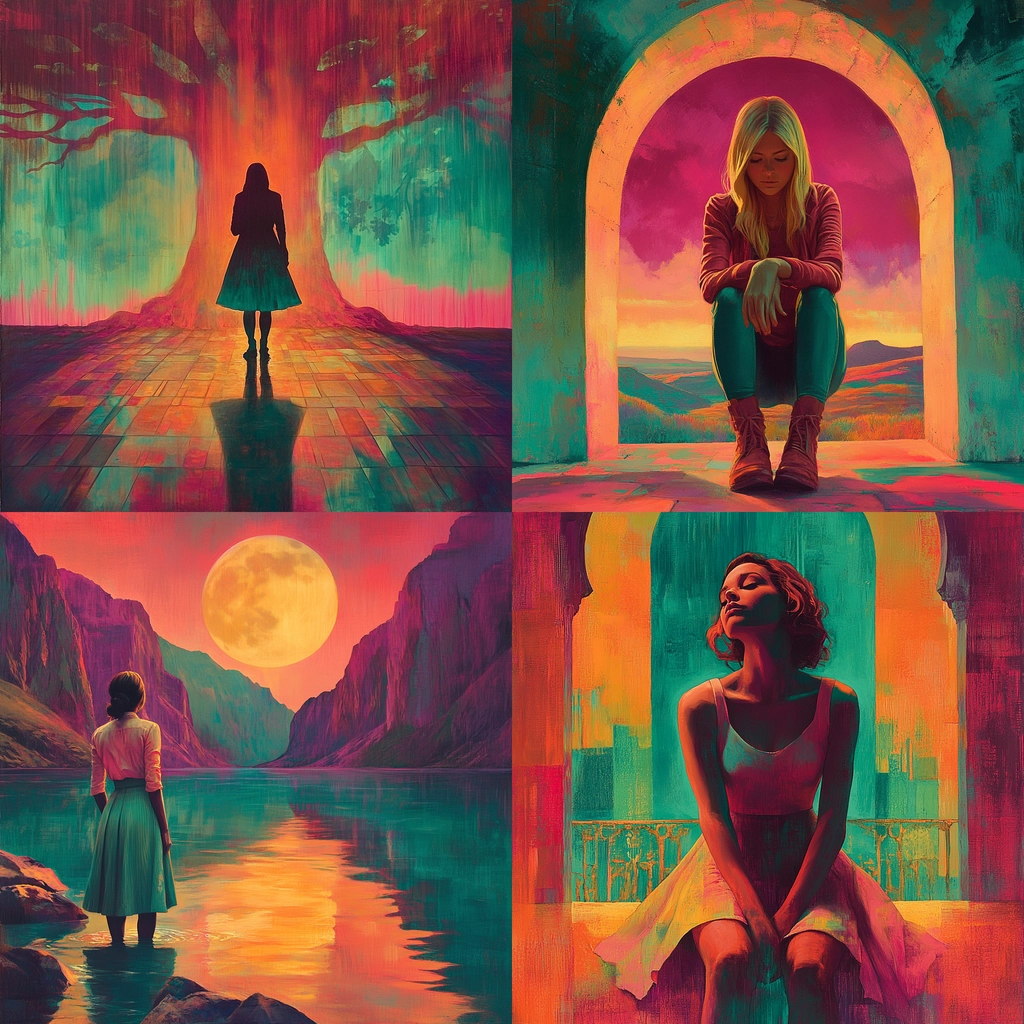 Richly hued compositions with fluid transitions, utilizing a vibrant color palette and expressive textures that create layered atmospheric depths.