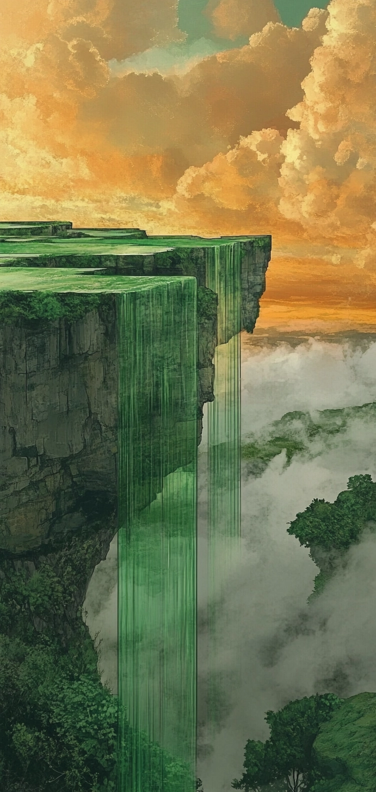 The composition utilizes vibrant lighting effects that enhance contrast between lush greens and warm amber tones. Spatial perception is heightened through varied texture representation and reflective surfaces.