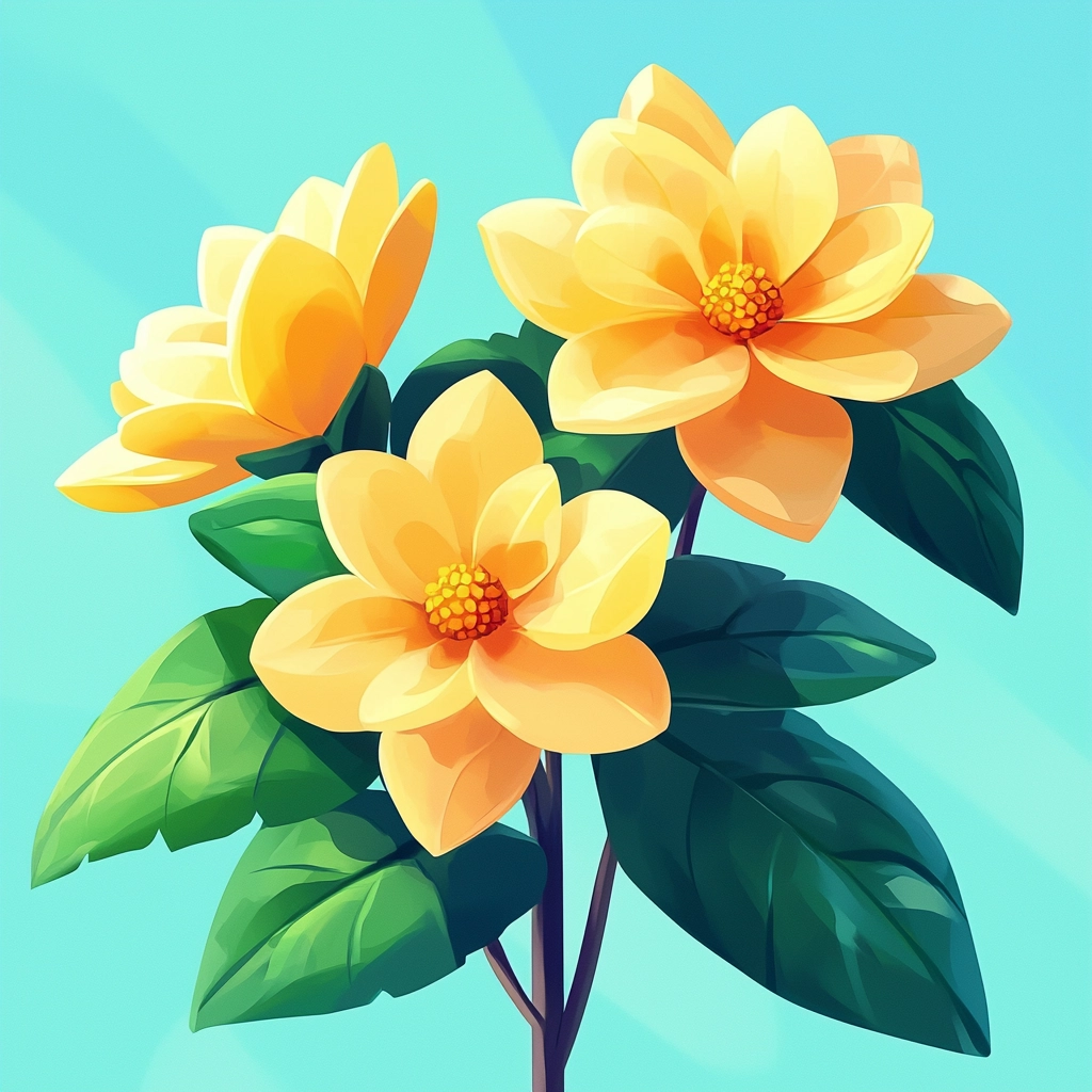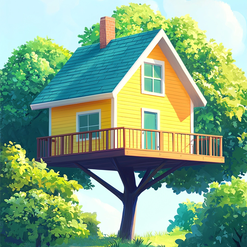 The use of vivid green and yellow creates a striking contrast, enhanced by the bright blue sky. Light filters through elements, casting shadows that add depth. The textures are smooth, and there's a sense of clarity and openness.