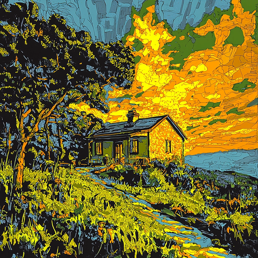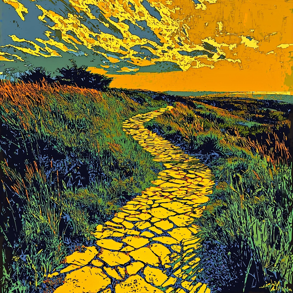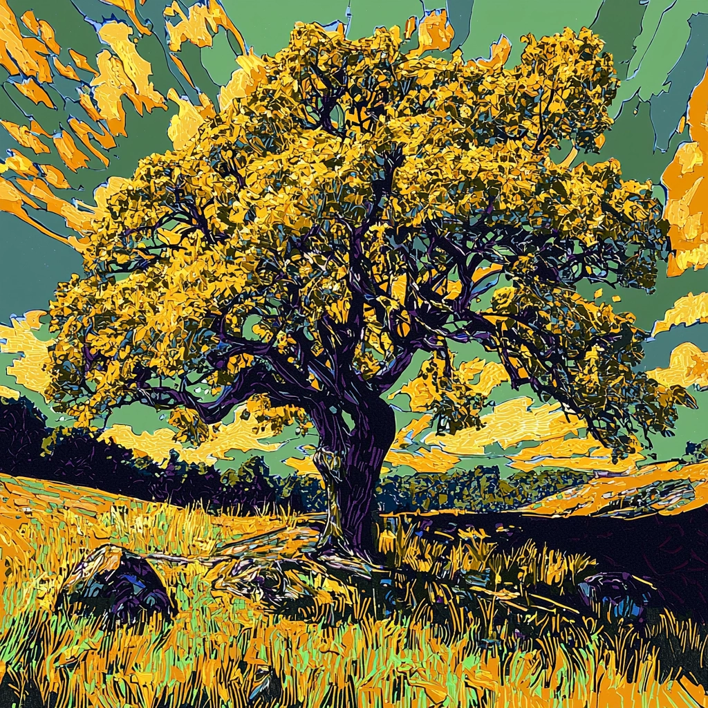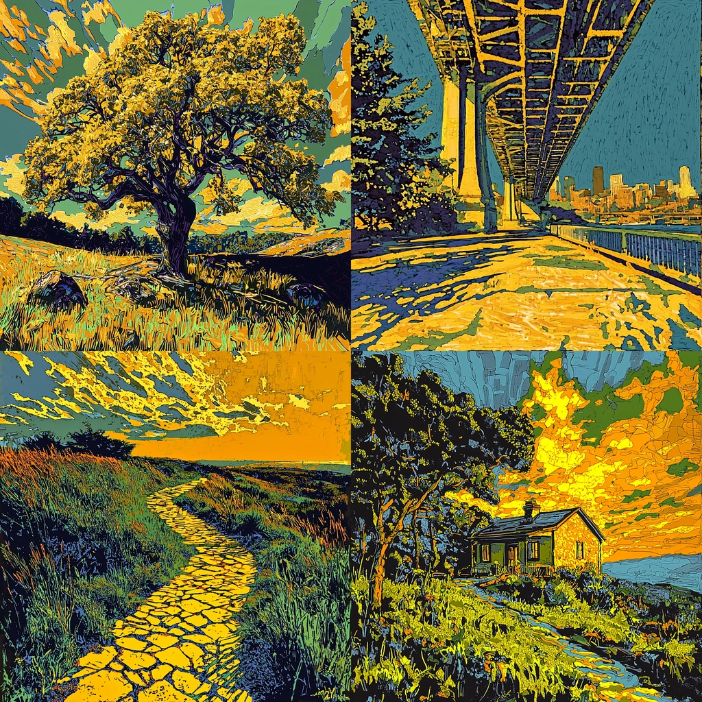 Dynamic lighting enhances the saturated yellow and blue hues, creating a strong visual impact while highlighting intricate textures and organic forms. The spatial arrangement emphasizes depth, leading the viewer's eye across the scenes.