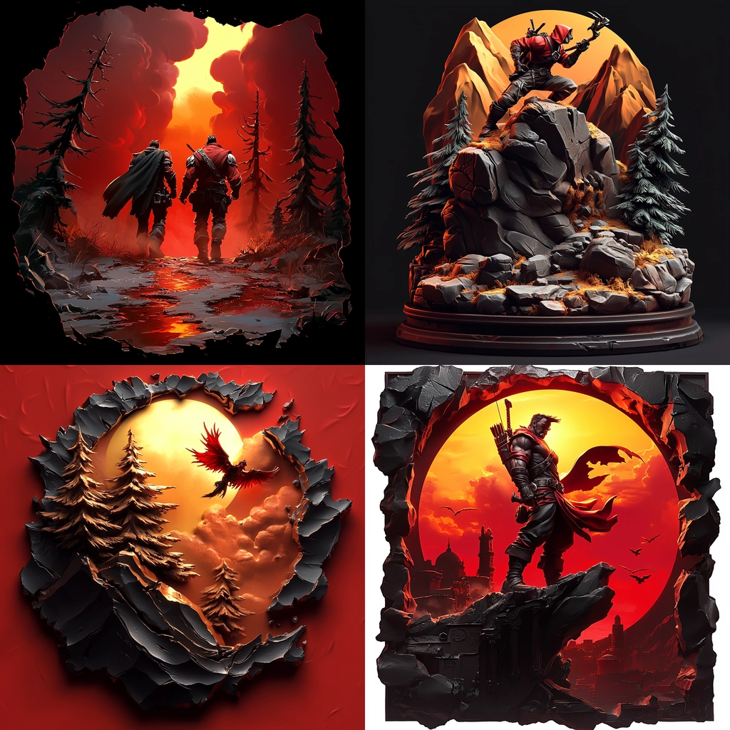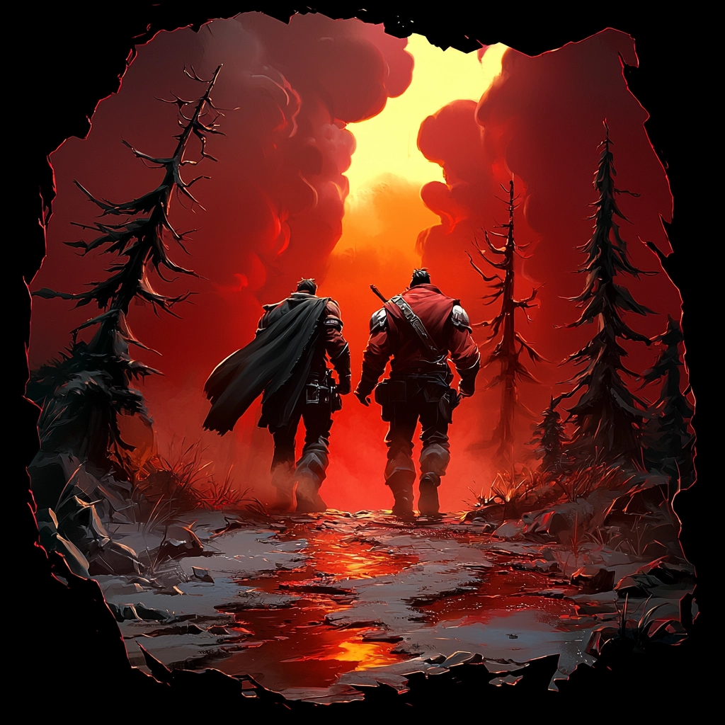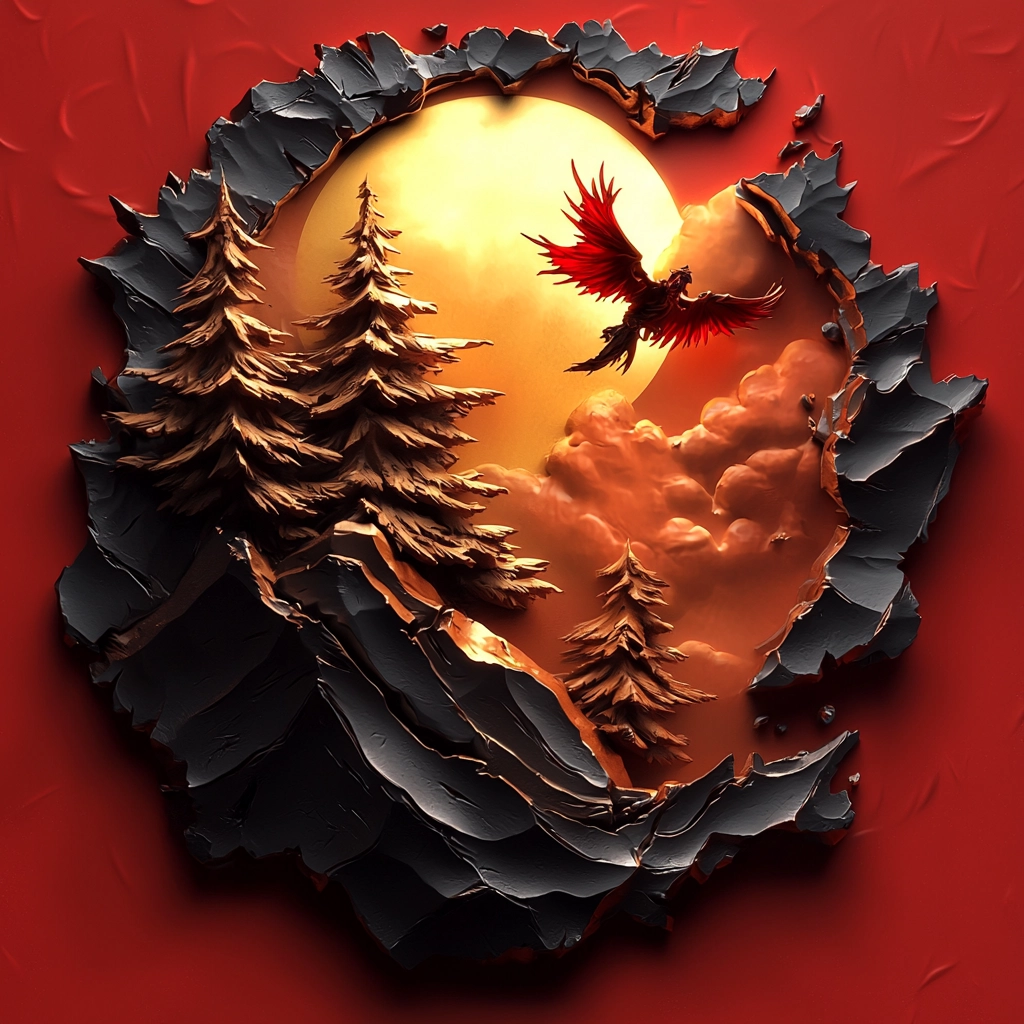 The composition contrasts intense reds against deep silhouettes, with dynamic forms creating a powerful visual impact.