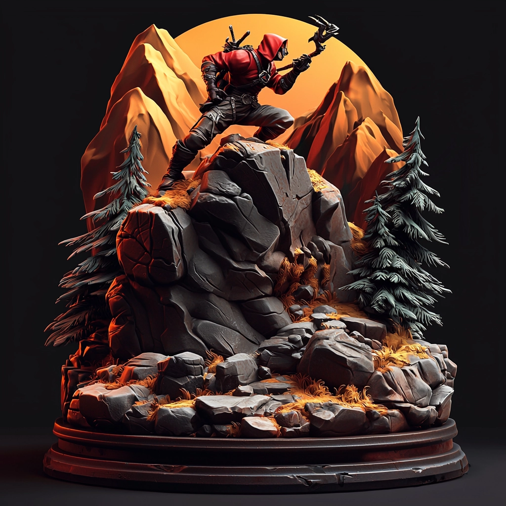 Dramatic lighting intensifies the vivid red hues against shadowy, detailed textures, enhancing the sense of depth and ruggedness. The stark contrast between light and dark draws focus and adds definition to each component, emphasizing a strong spatial dimension.