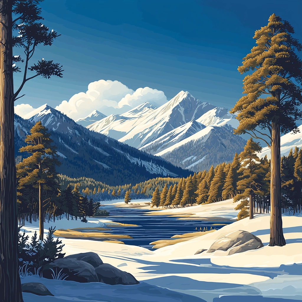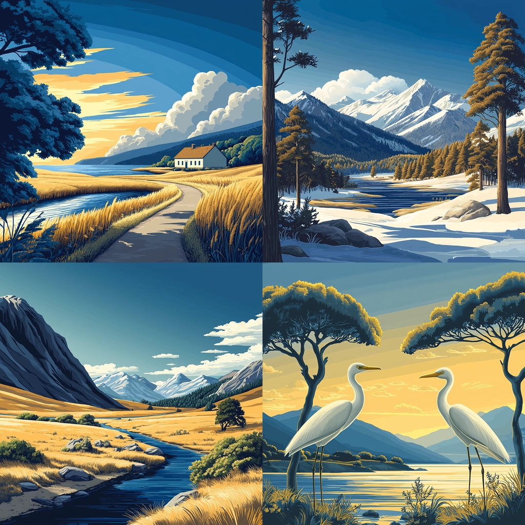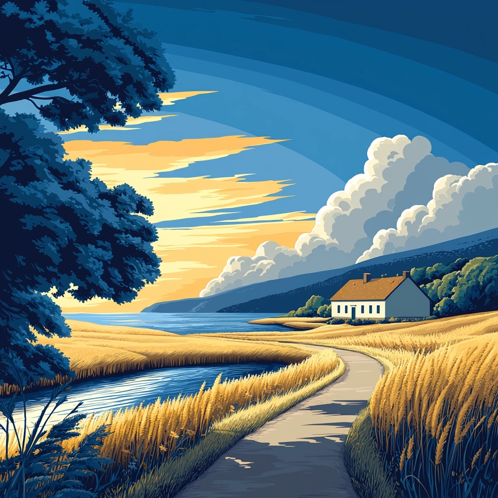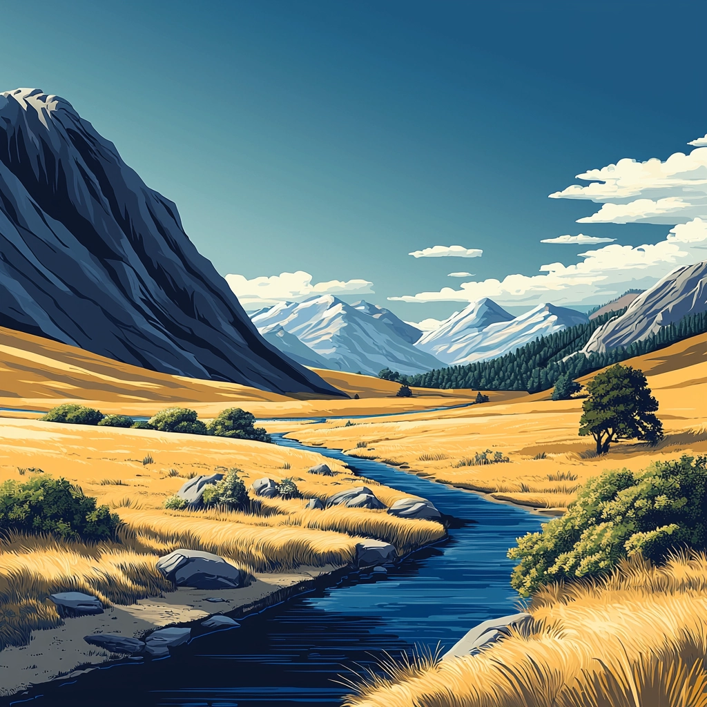The use of lighting creates sharp contrasts between sunlit areas and shadows, enhancing depth. The vivid colors and clear outlines emphasize the distinction between elements, giving a sense of vast space and realism. Textures are smooth and crisp, contributing to a clean and structured appearance.