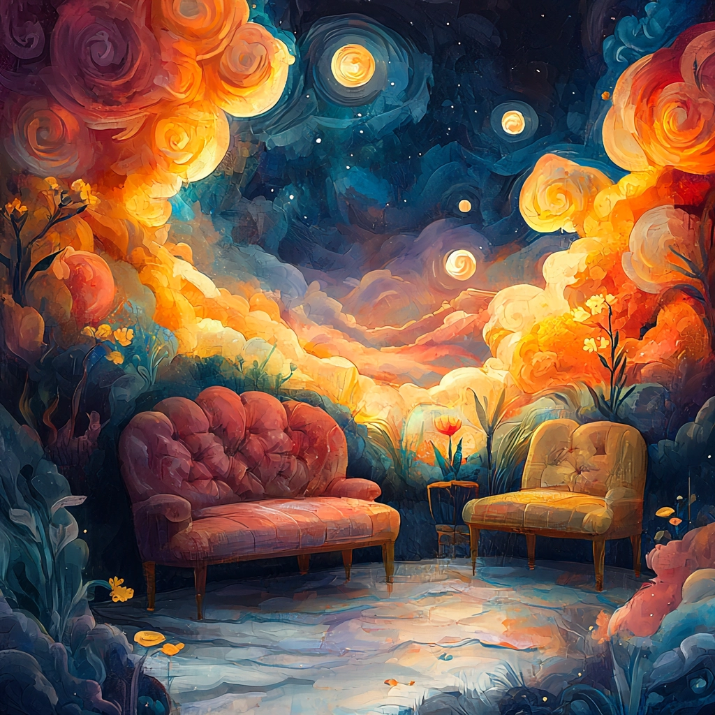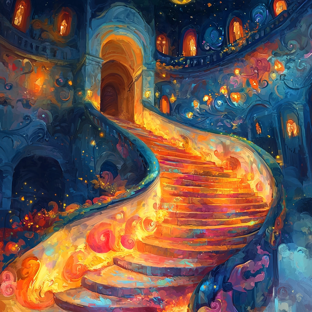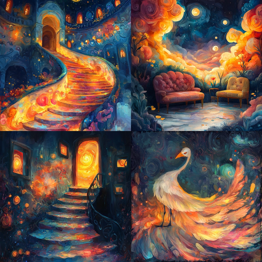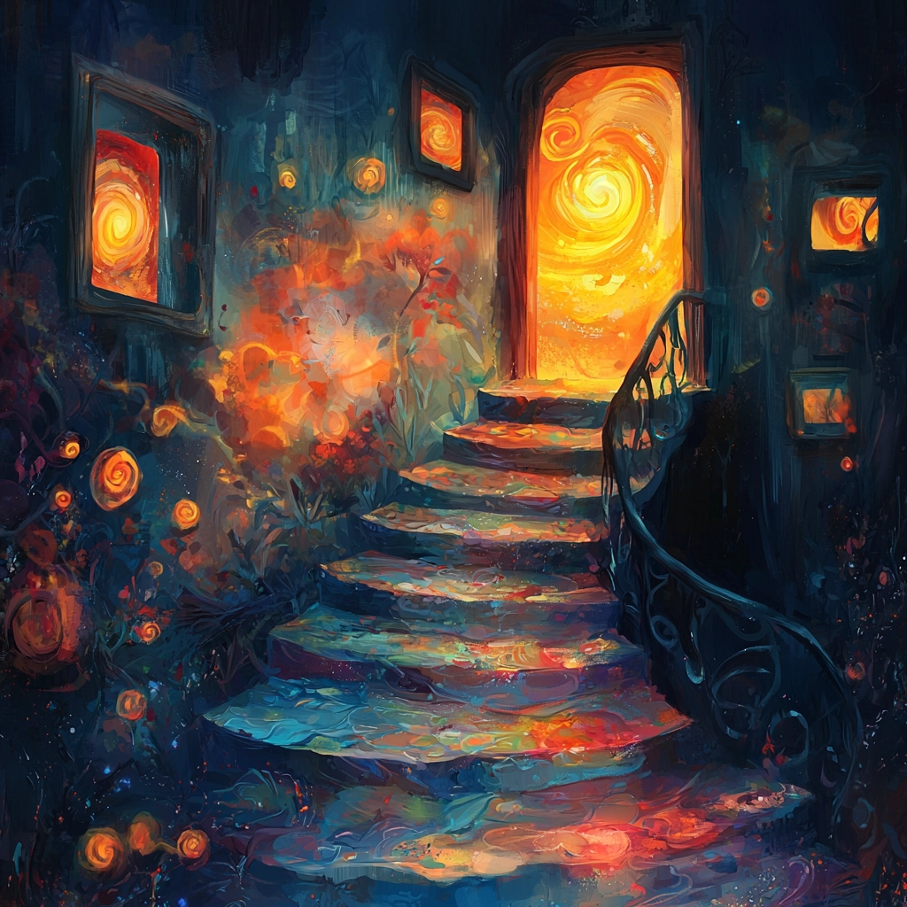 Fluid textures evoke movement and life, enriched by dynamic lighting effects. Rich, warm colors contrast with dark backgrounds, and varied spatial depth invites exploration. Each element builds a cohesive sense of vivid engagement and intrigue.