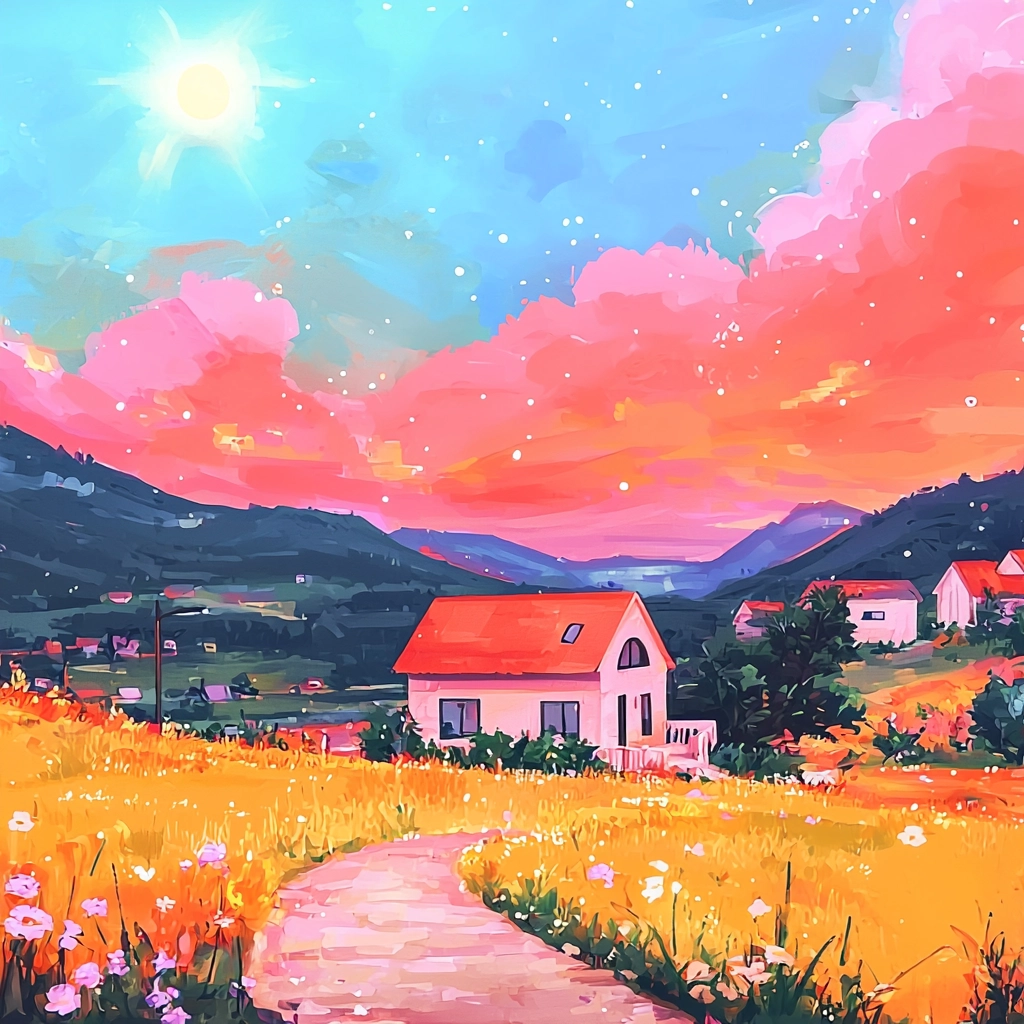 Vivid and dynamic scenes with bold color contrasts and soft edges.
