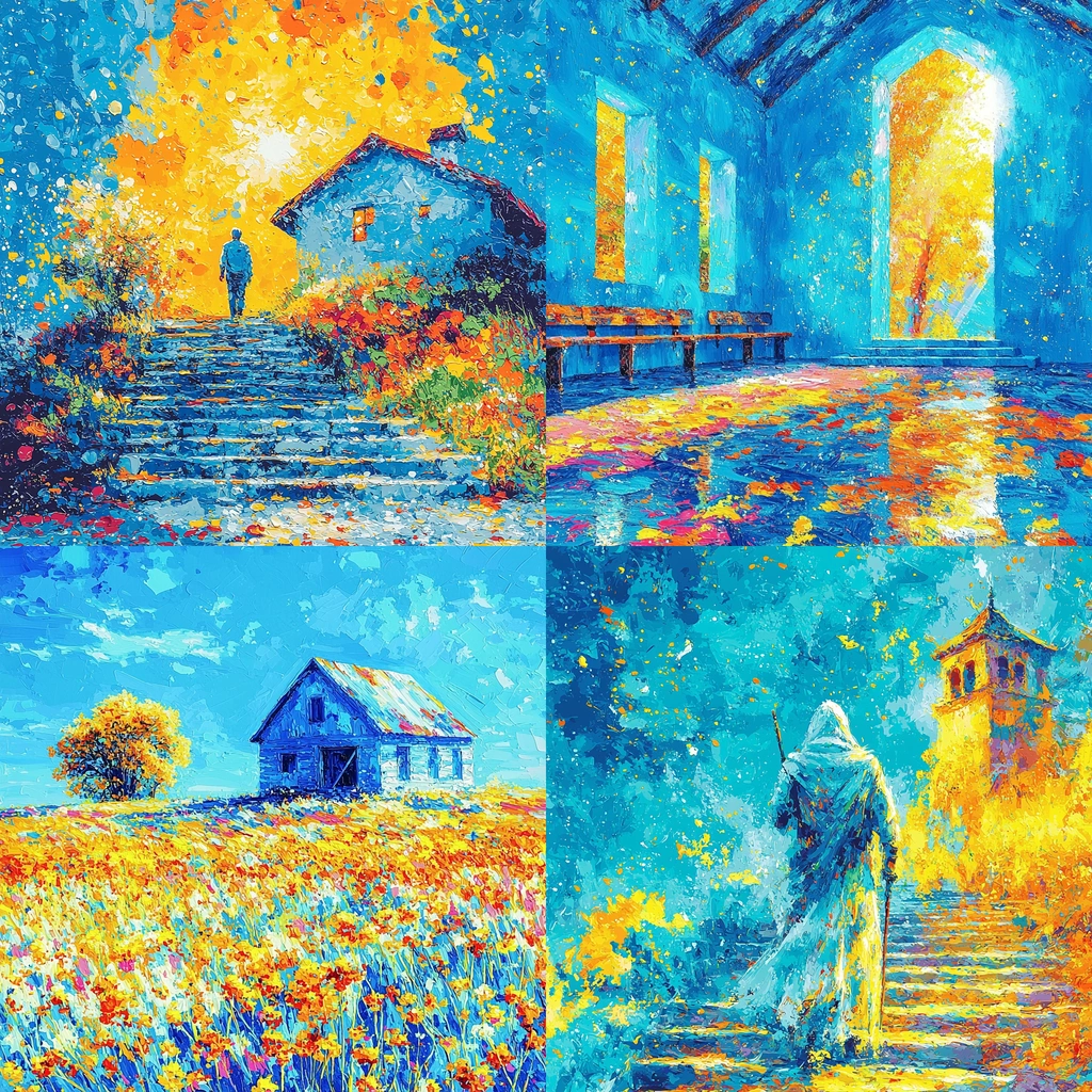 The vivid blue dominates the spatial sense, augmented by orange bursts that provide contrast. Light diffuses across textured surfaces, while bold brushwork adds dynamic depth and motion.