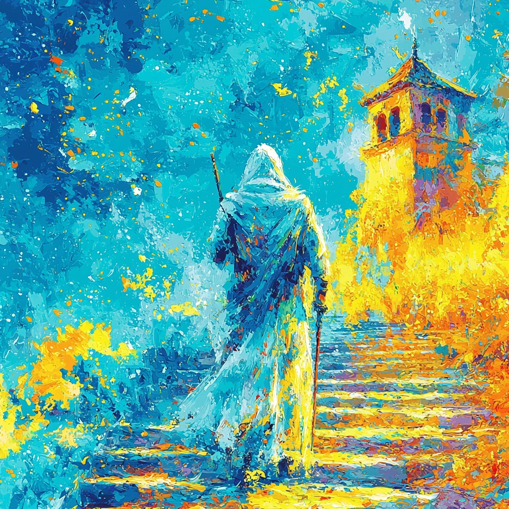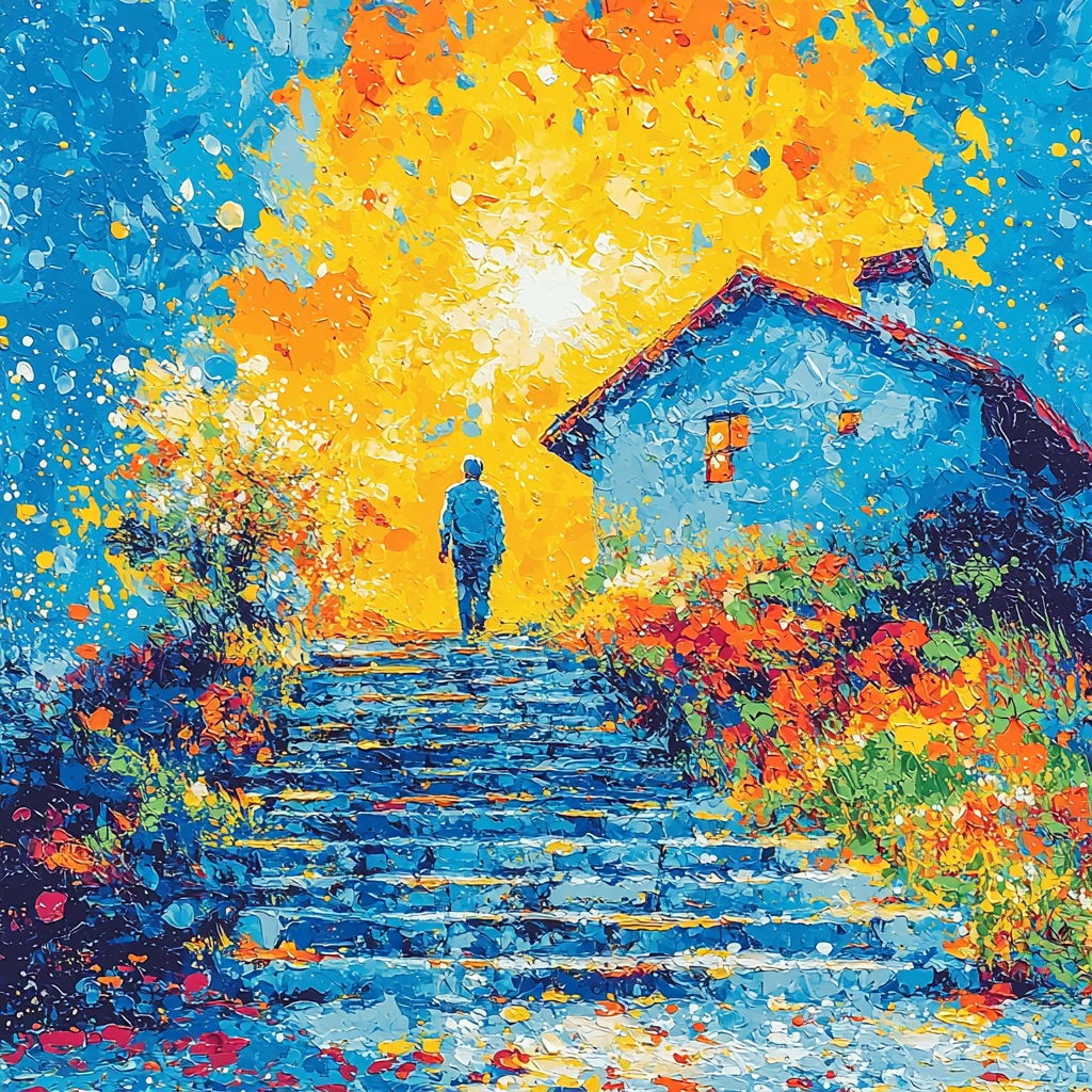 The vibrant interplay between blue and orange creates dynamic energy through varied brushstrokes and lighting.